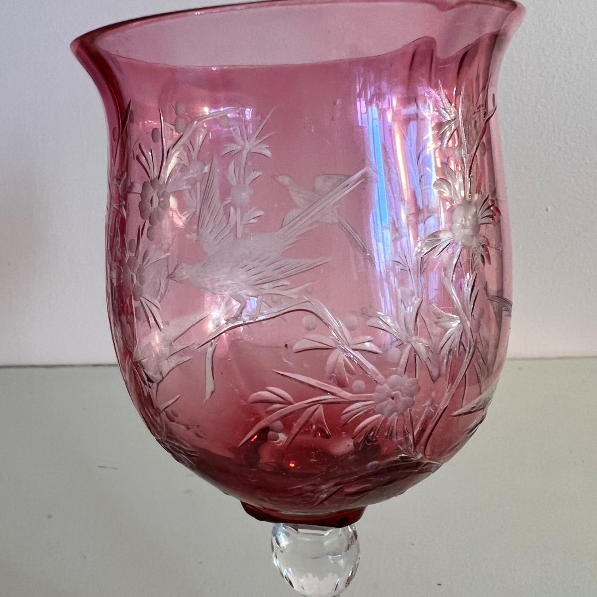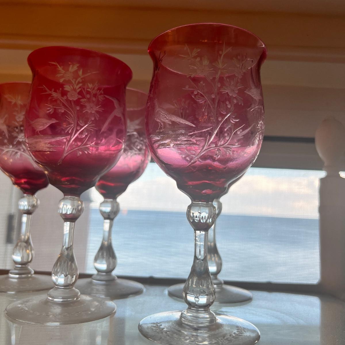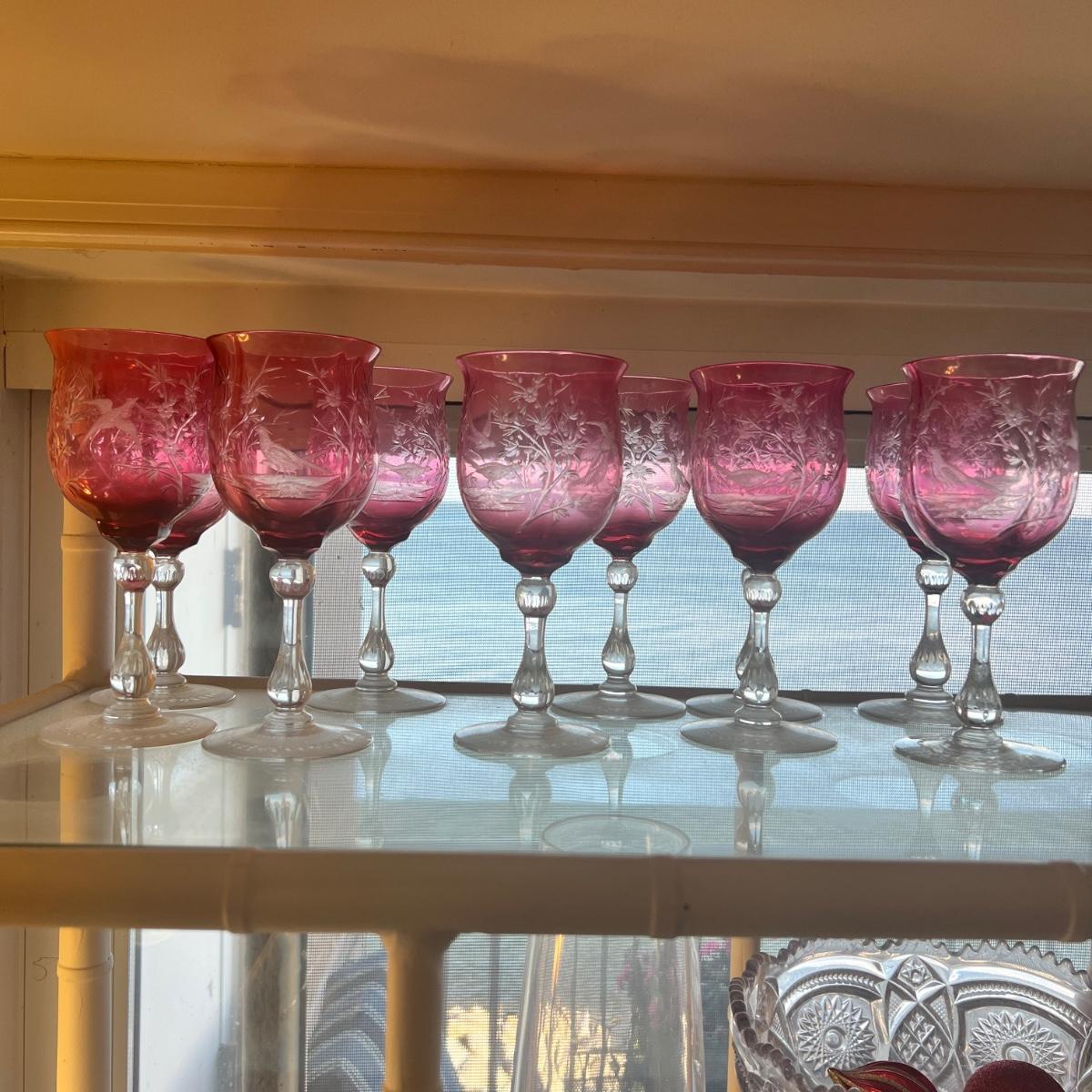 Vintage Set 10 Cranberry Etched Wine Glasses