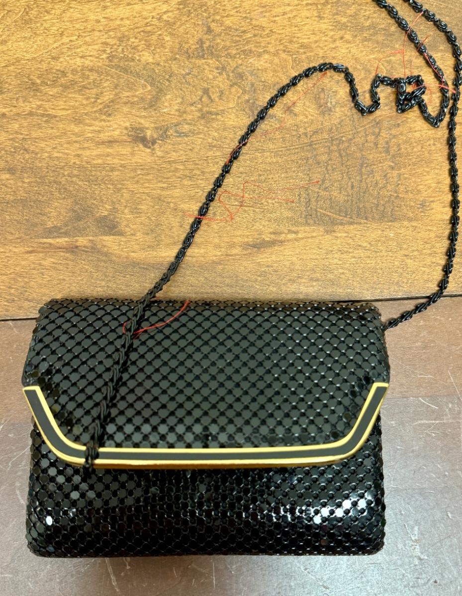Black sequins with gold tone snap closure. Chain shoulder strap tucks inside. Near new condition.