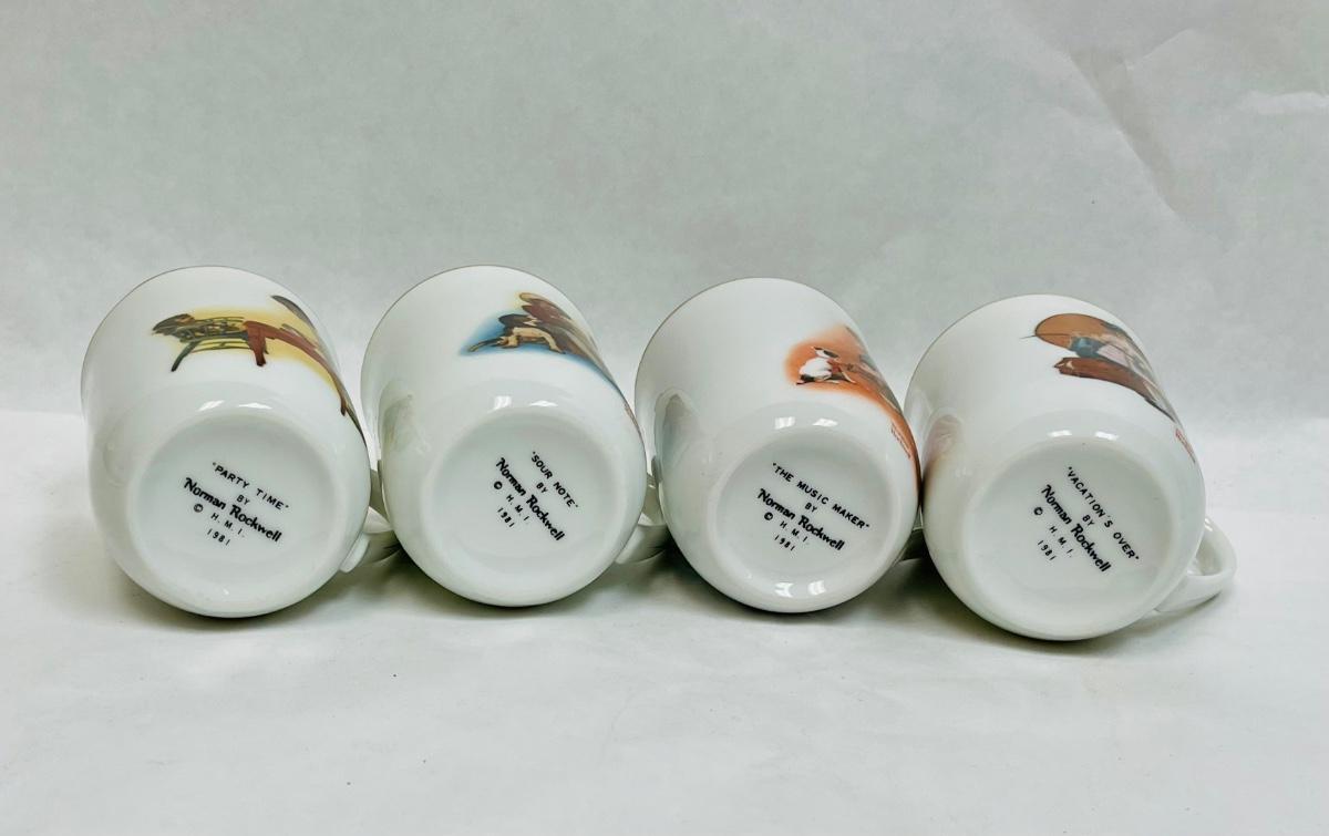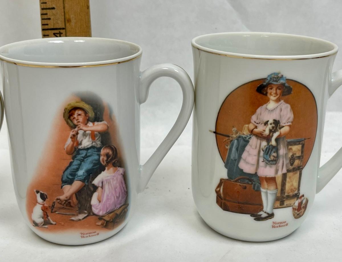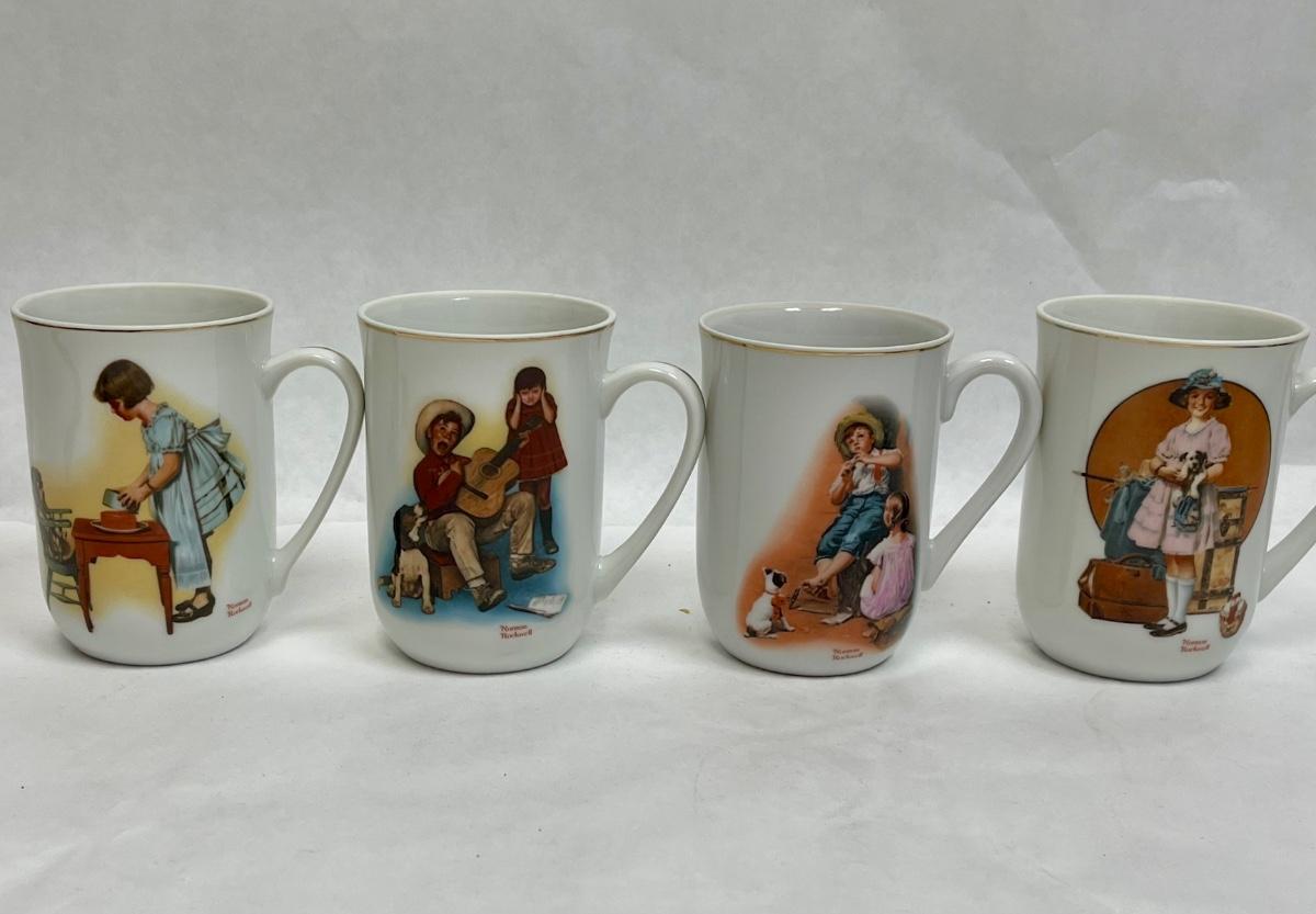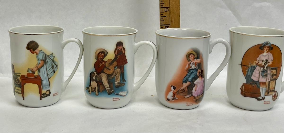 Each cup has a Norman Rockwell illustration in full color. Cups are approx. 4" tall, all are in good condition.
