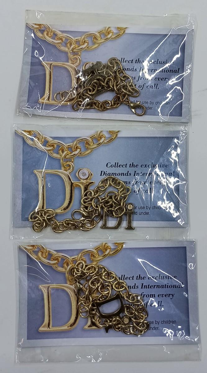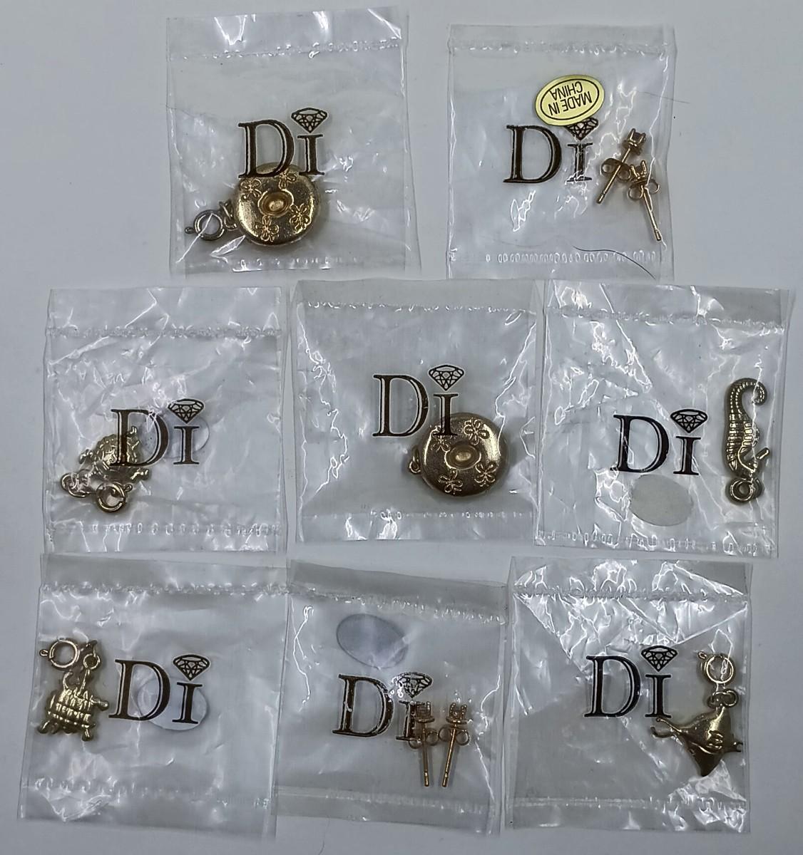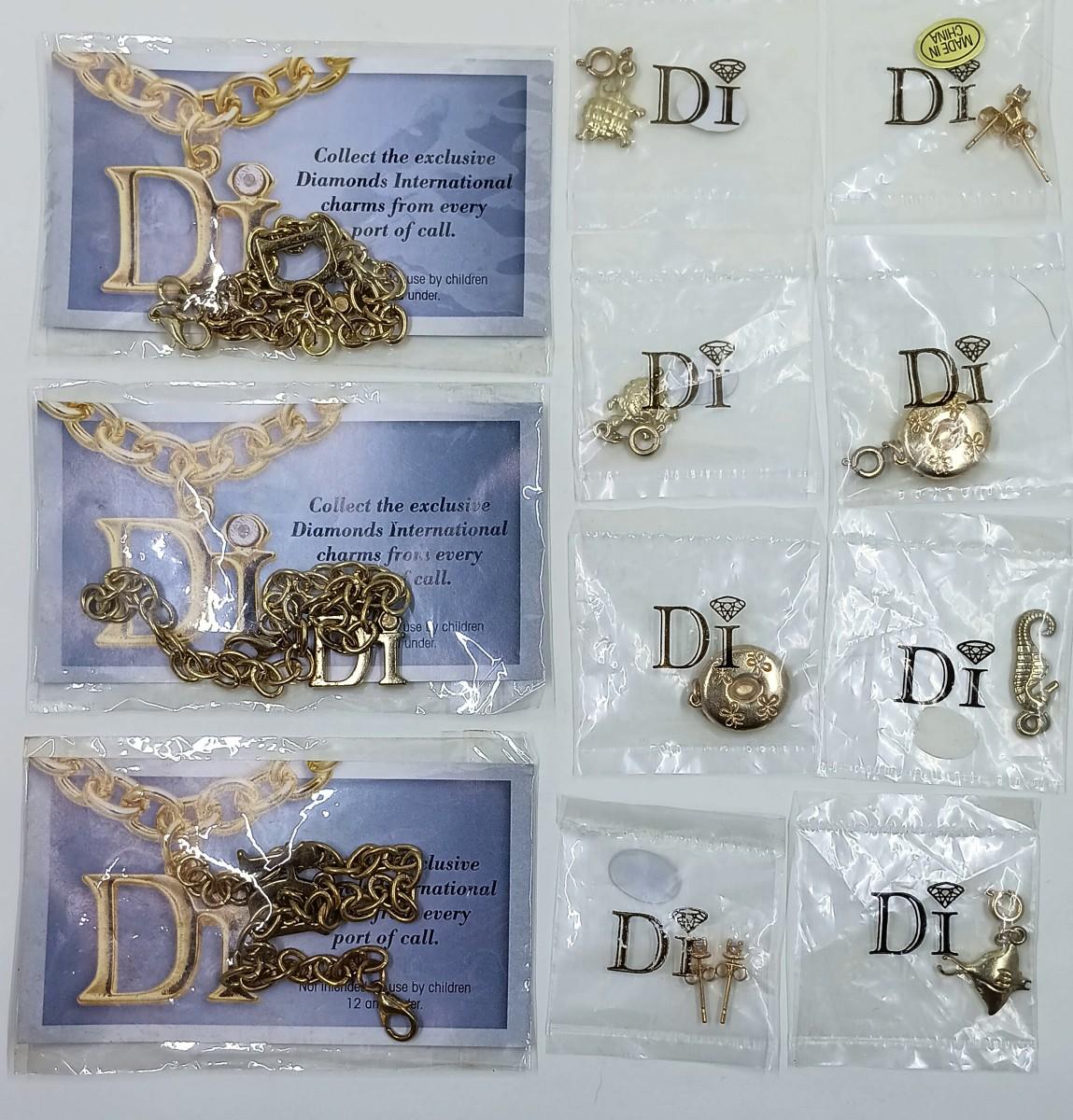 This lot of Diamonds International costume jewelry in brand new. The lot includes three charm bracelets, six charms and two pair of simulated gemstone earrings.