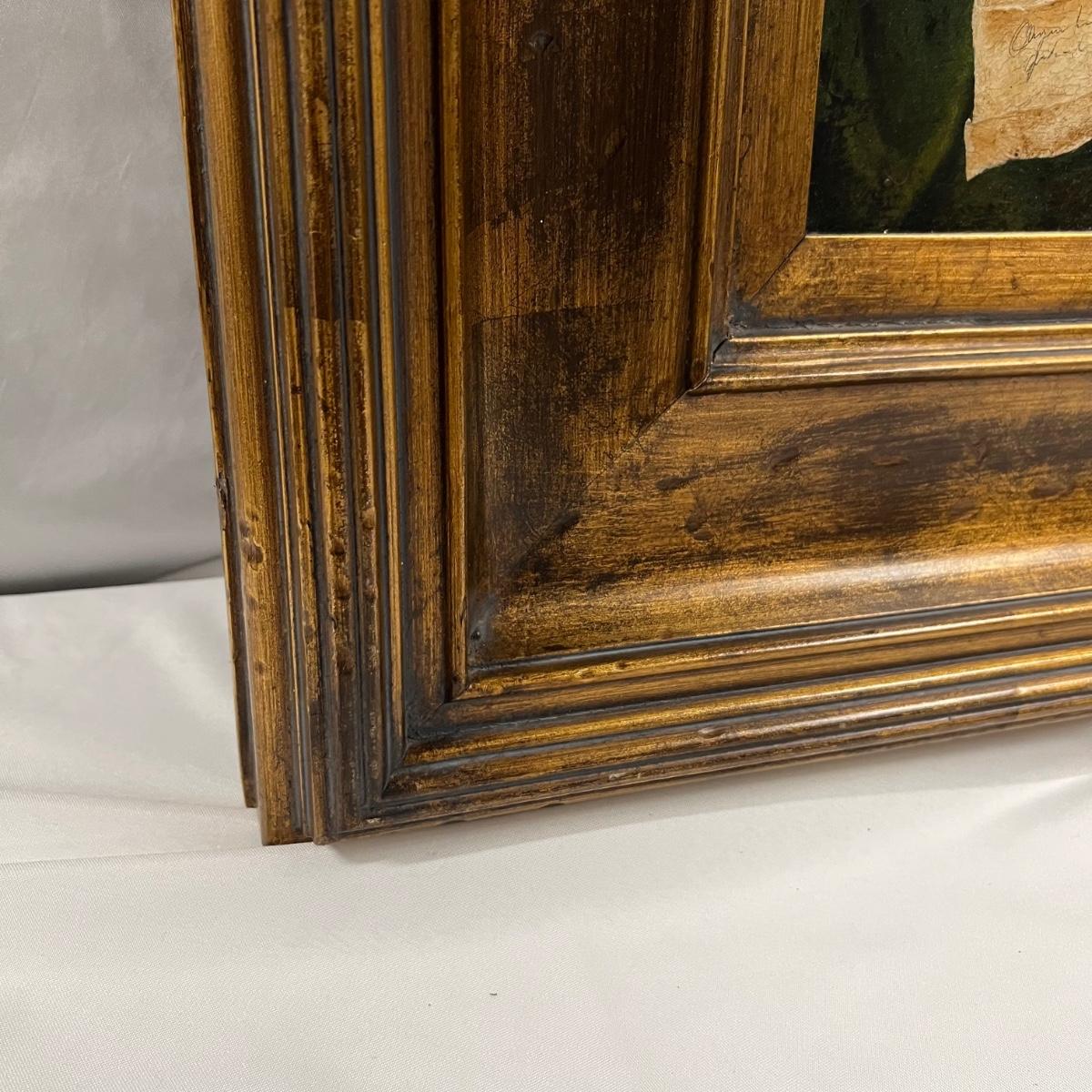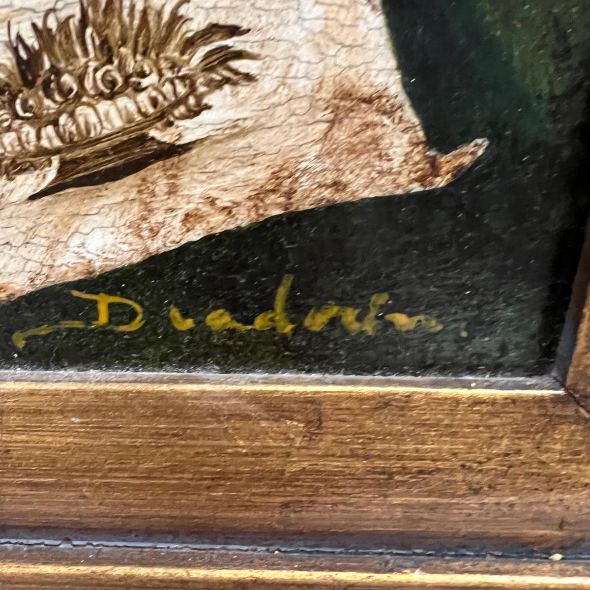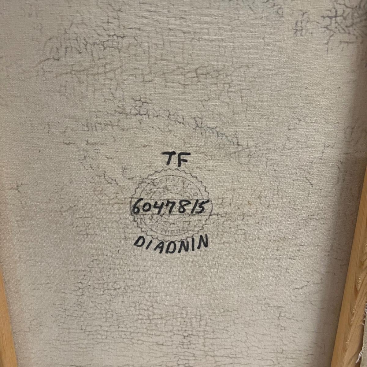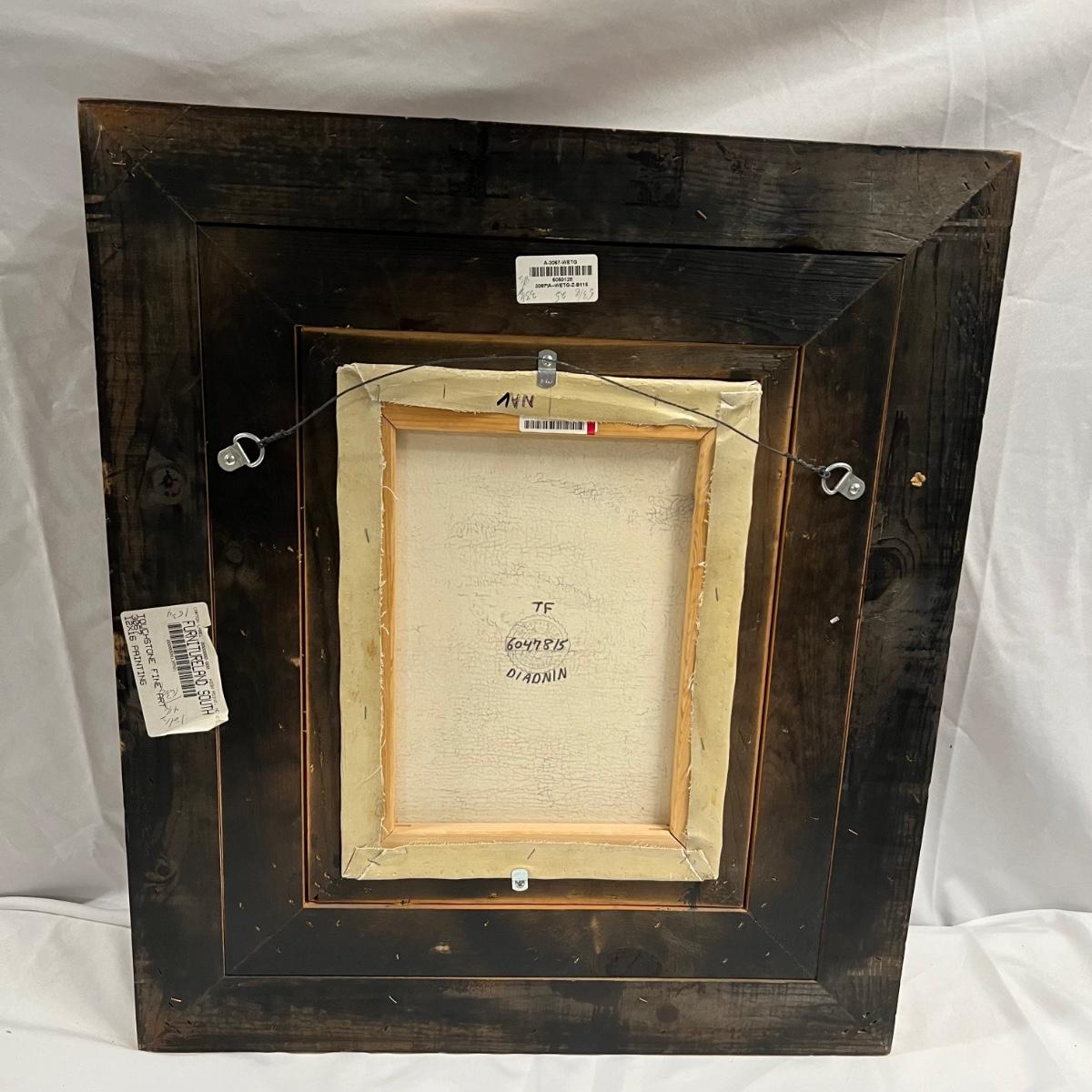 This canvas art appears to be a painting on canvas with a stamped signed name that reads Diadnin. It is mounted in a thick gold painted wood frame that has a distressed finish.