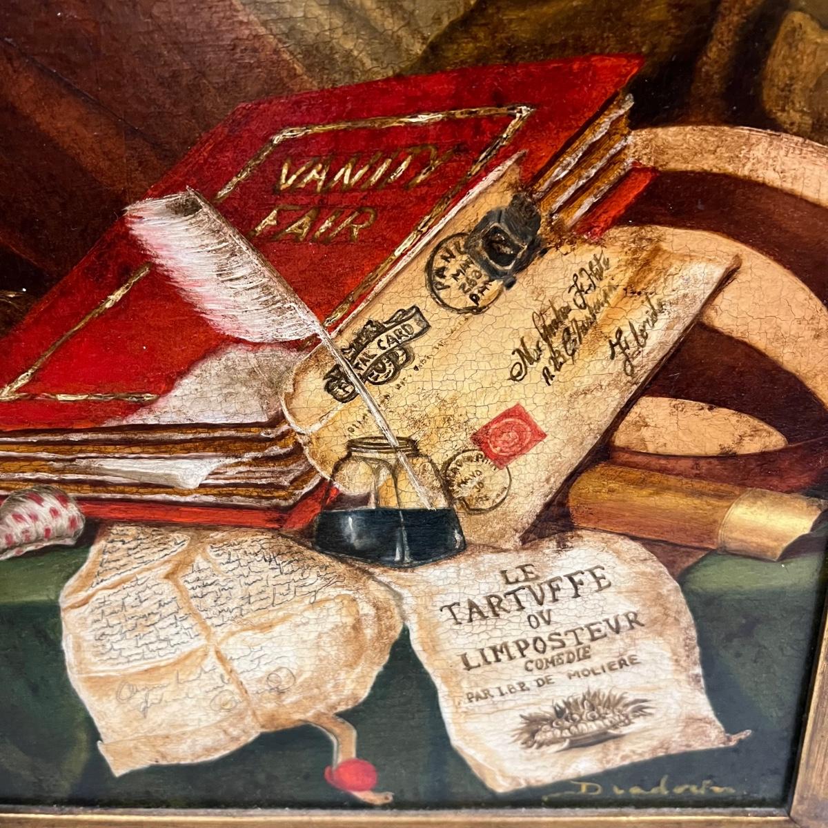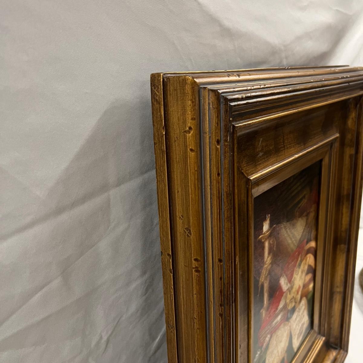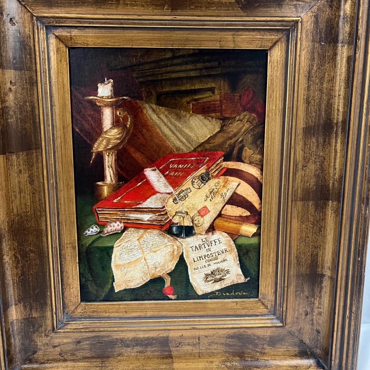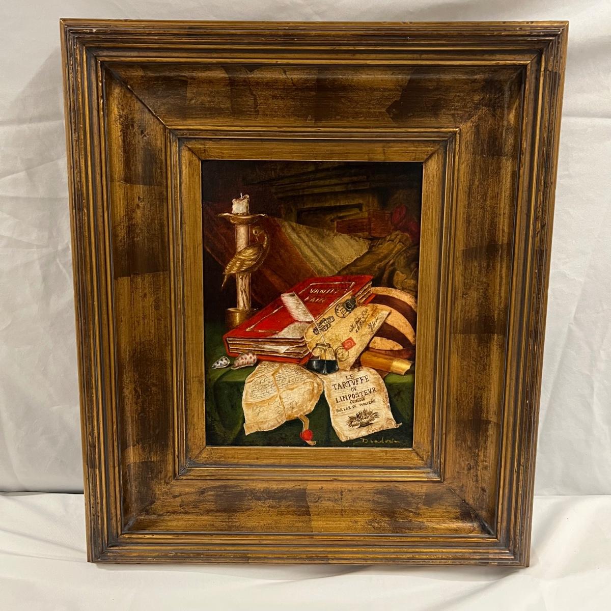 This canvas art appears to be a painting on canvas with a stamped signed name that reads Diadnin. It is mounted in a thick gold painted wood frame that has a distressed finish.