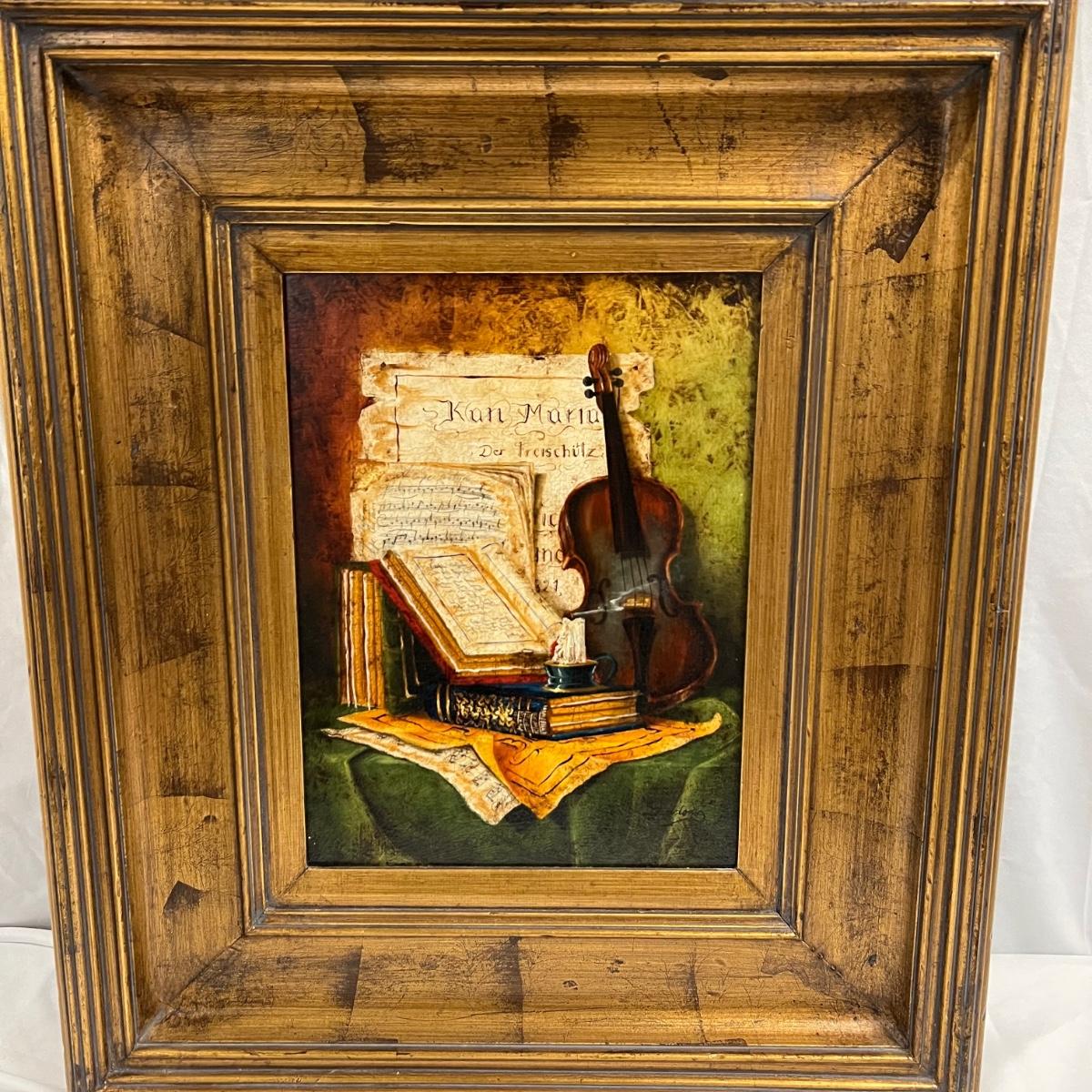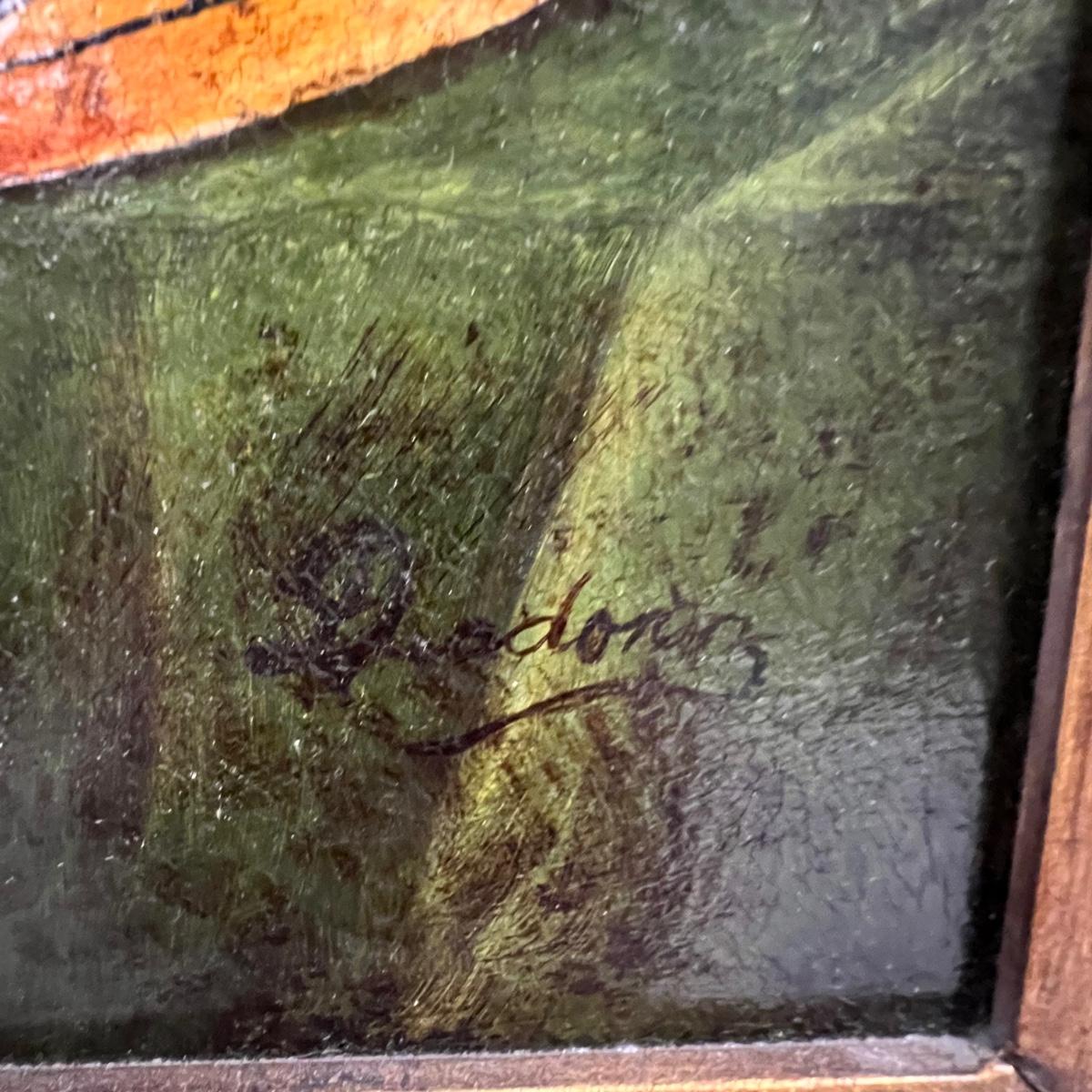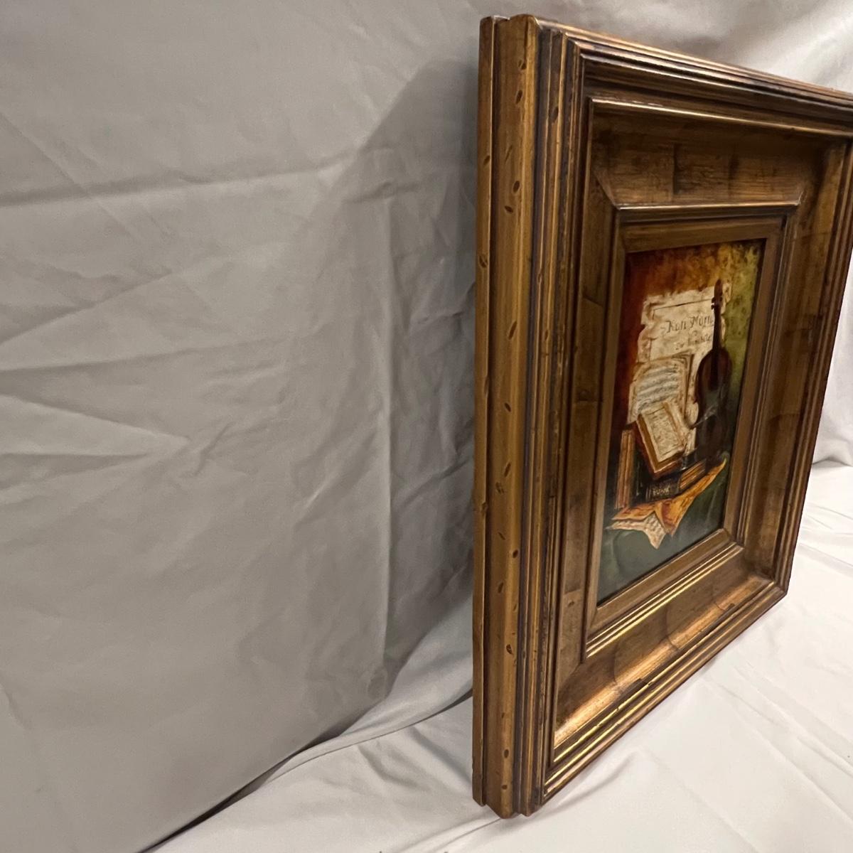 This attractive still life appears to be a painting on canvas by the artist Diadorin. Frame is wood with a distressed gold finish. Signature that reads Diadorin is stamped on the front and written on the back of the canvas.