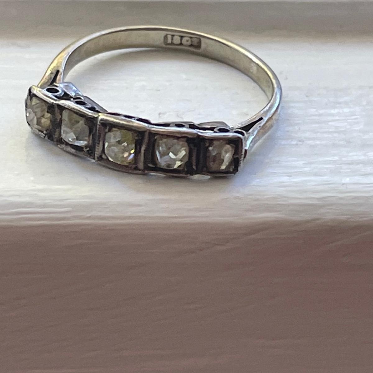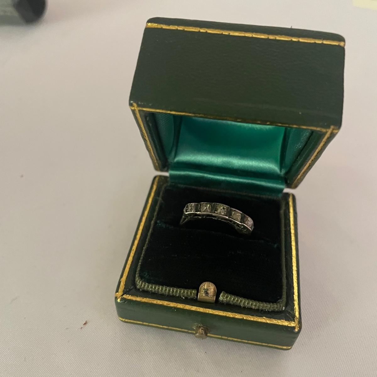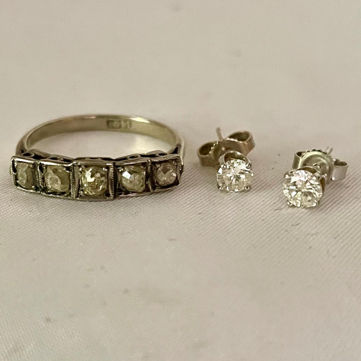 This eternity style ring is stamped 18 CT and its band of 5 diamonds tested positive as diamonds on our tester. It comes in a green leather like box labeled N. Bloom & Sons. We cannot confirm if this is the original box for the ring. A pair of 14K Diamond stud earrings are also included in this lot and these stones also tested positive as diamonds.