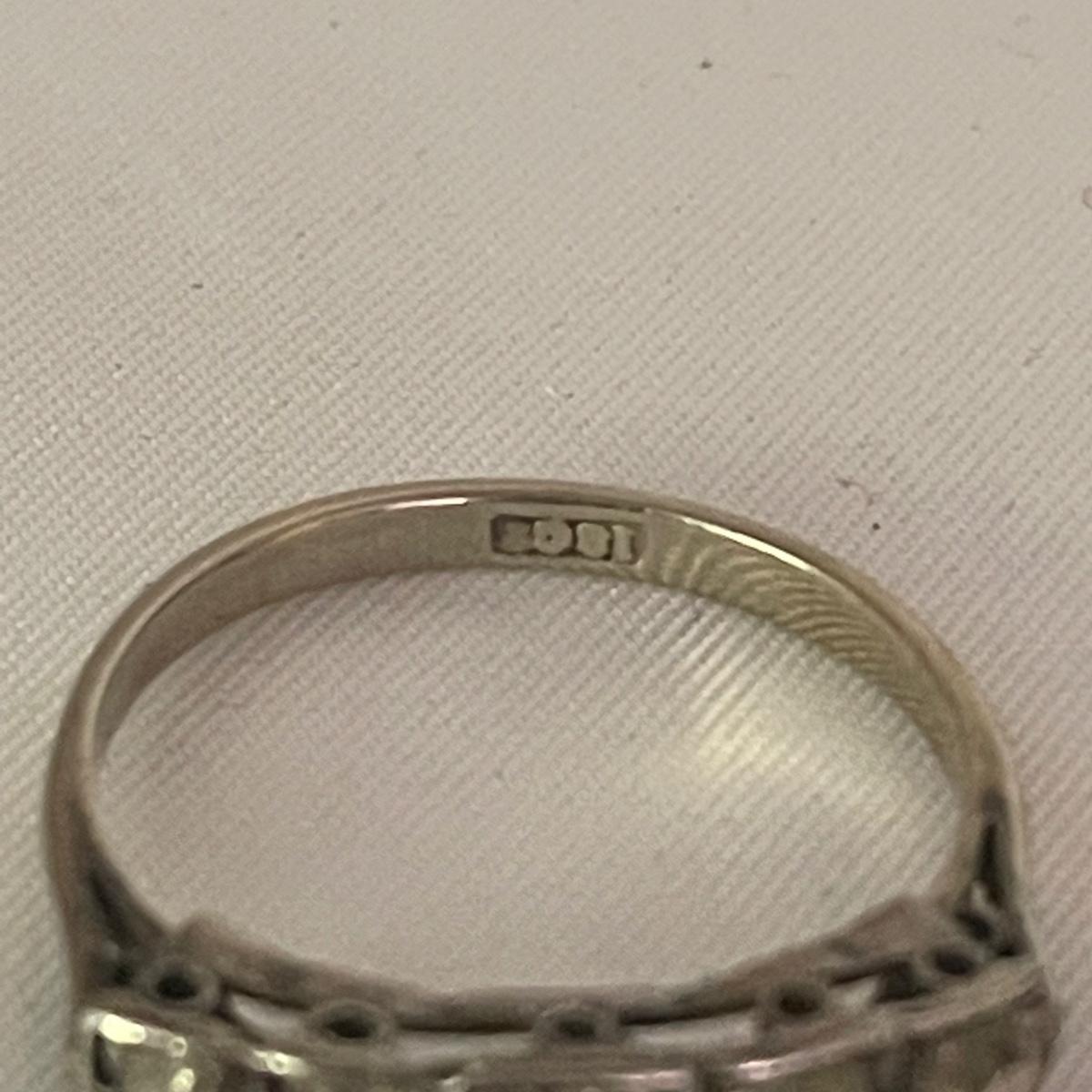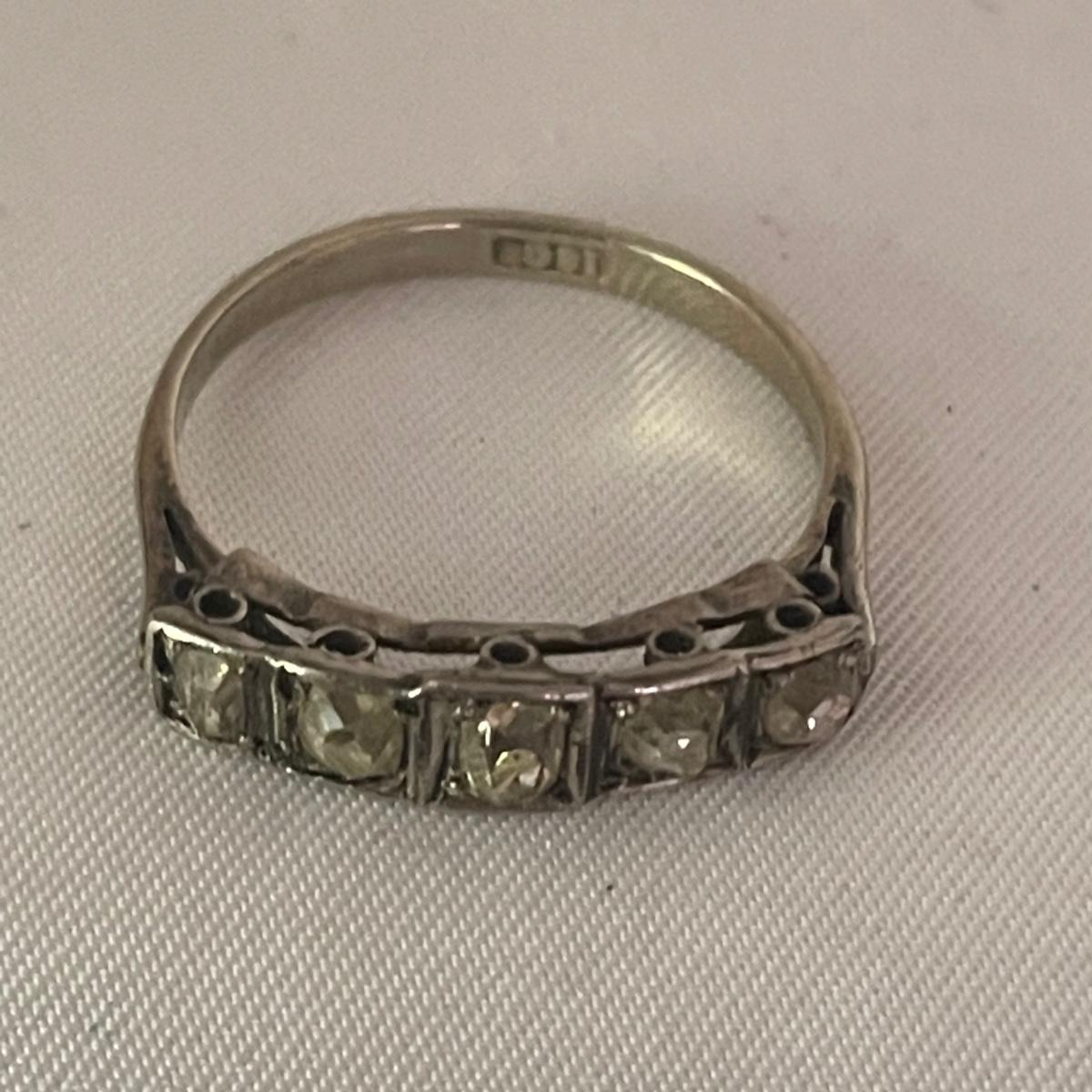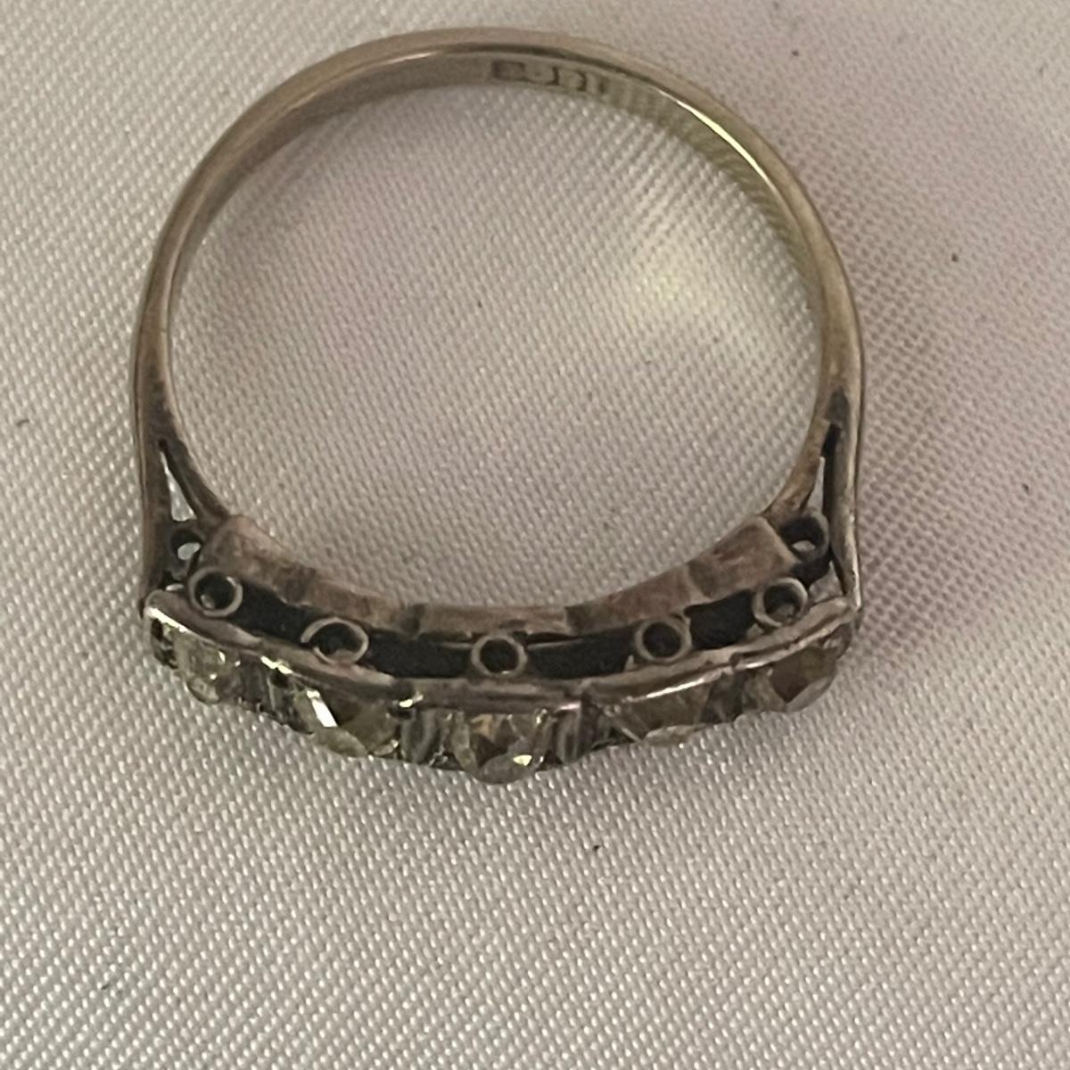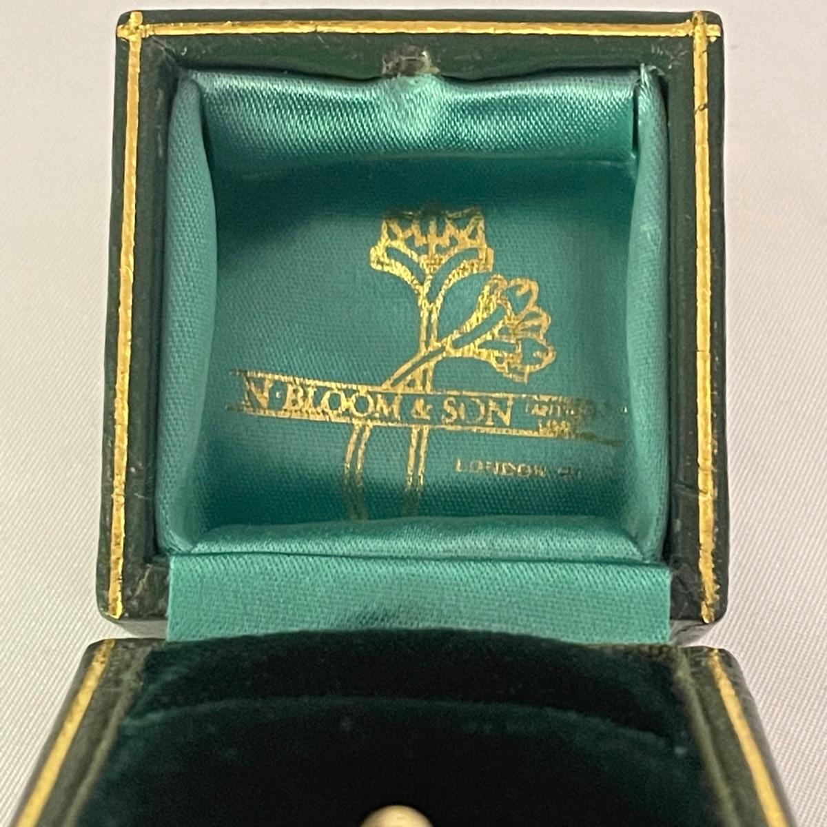 This eternity style ring is stamped 18 CT and its band of 5 diamonds tested positive as diamonds on our tester. It comes in a green leather like box labeled N. Bloom & Sons. We cannot confirm if this is the original box for the ring. A pair of 14K Diamond stud earrings are also included in this lot and these stones also tested positive as diamonds.
