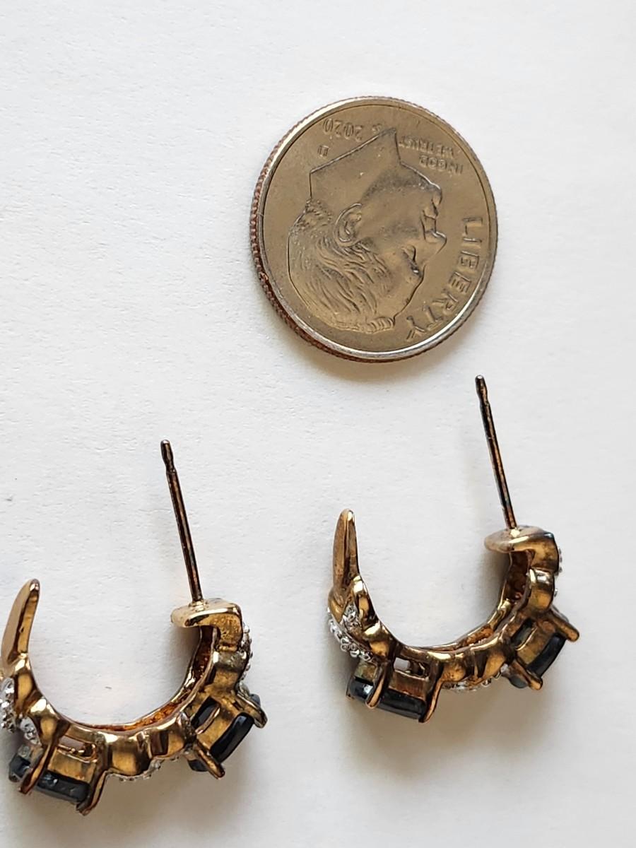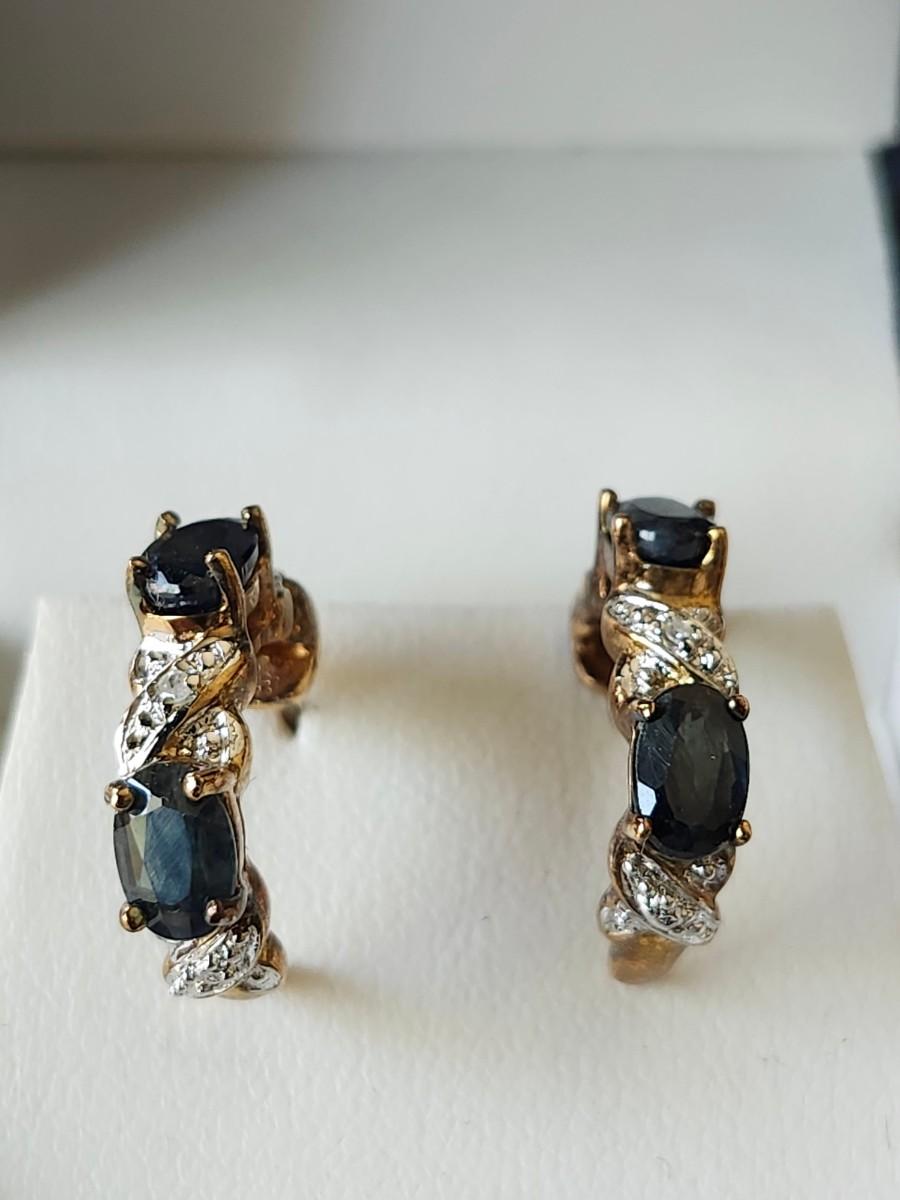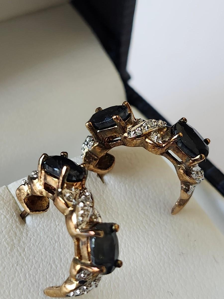925 with 10K gold plate. 3/4 inch demi hoop, double sapphire with cross diamond.