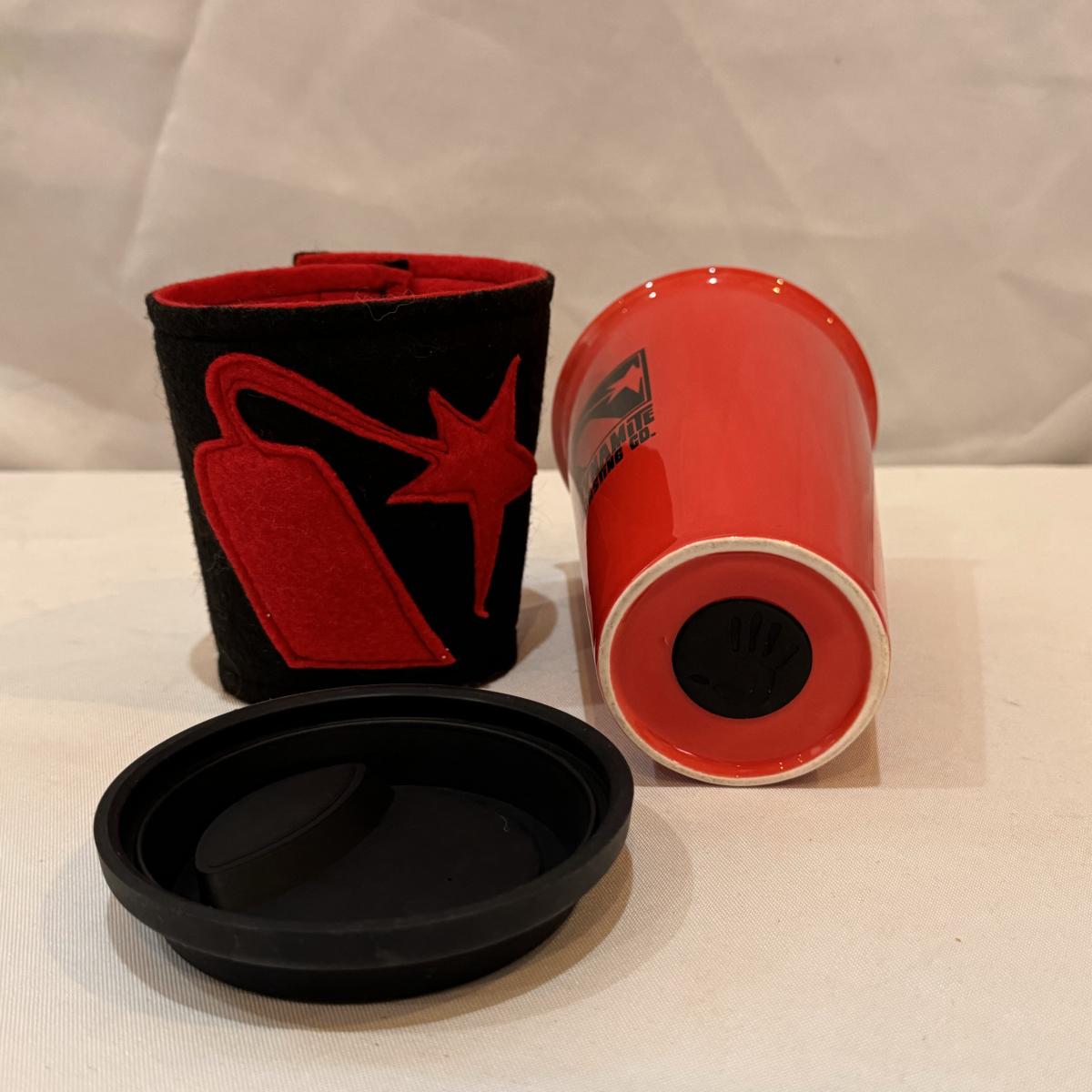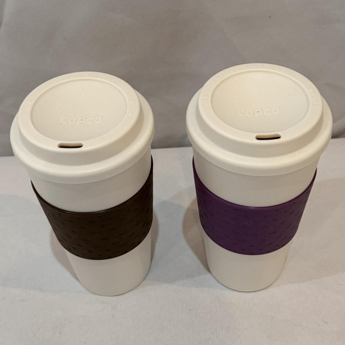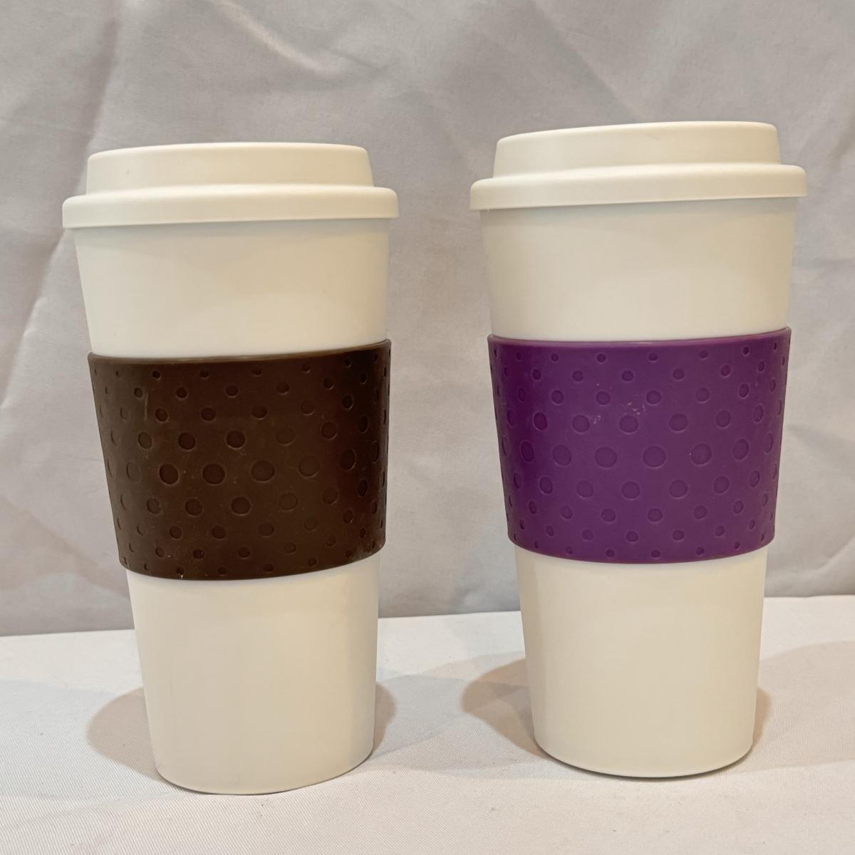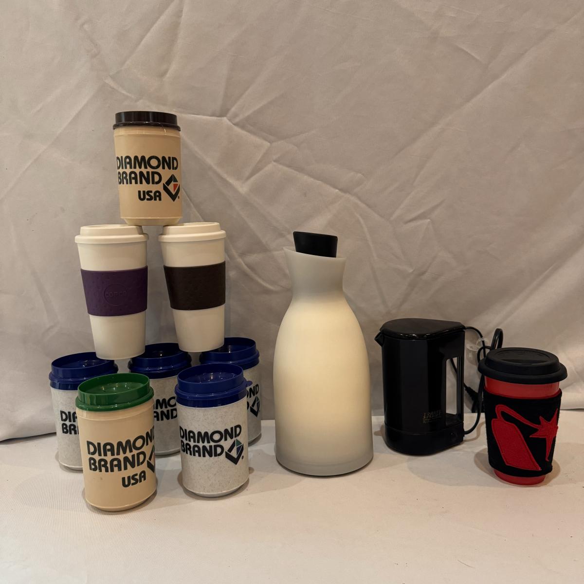 This lot includes six Diamond Brand travel coffee mugs with handles and lids, two Copco coffee mugs with lids and silicone sleeves, one coffee tumbler from Dynamite Roasting Co with a removable felt sleeve, one Travel Smart beverage heater, and one white vacuum flask. The Travel Smart beverage heater powered on when plugged in. The vacuum flask measures 5.25” x 12”H. Shipping available.