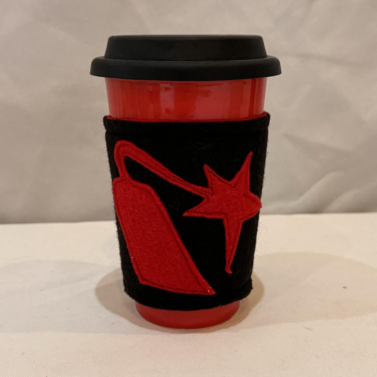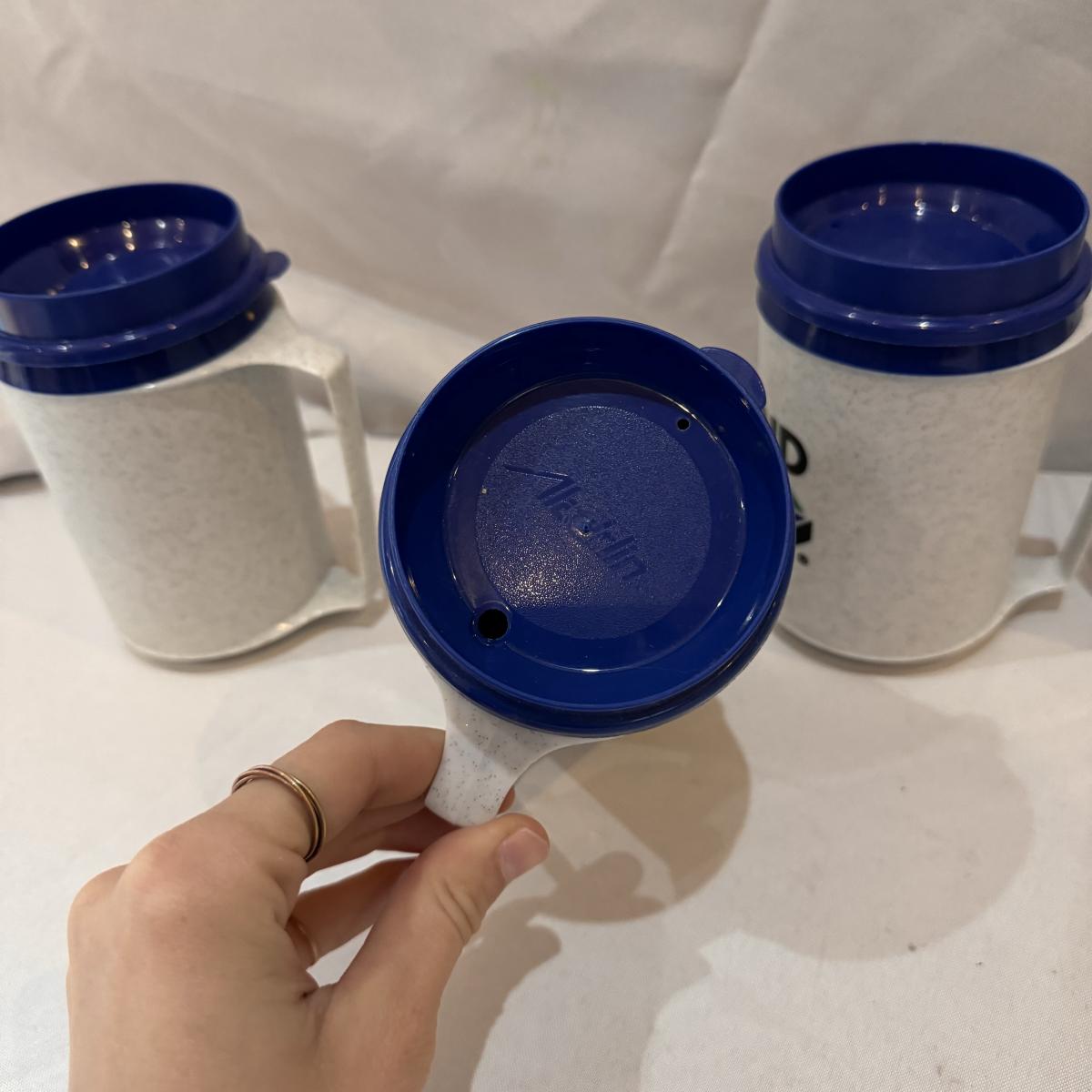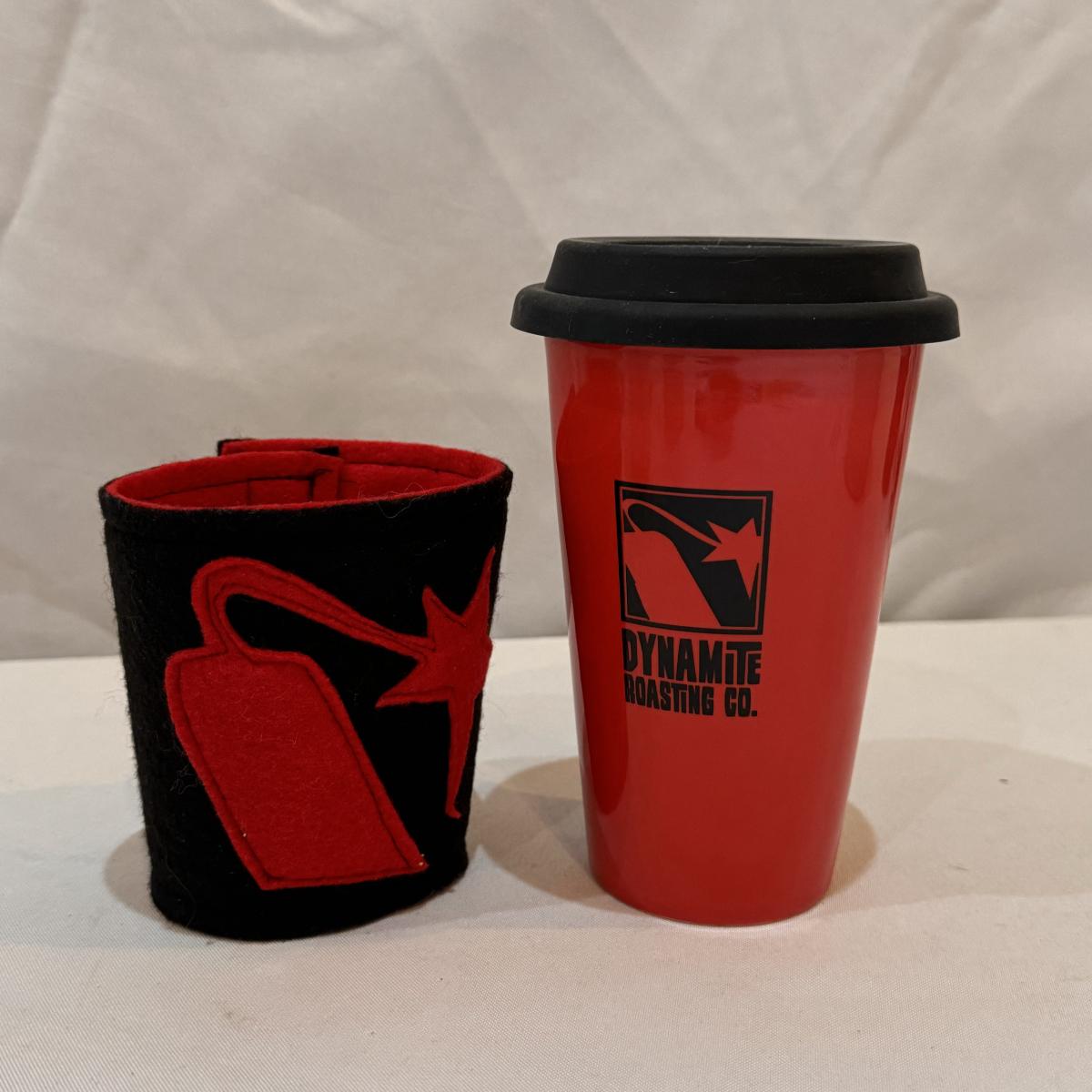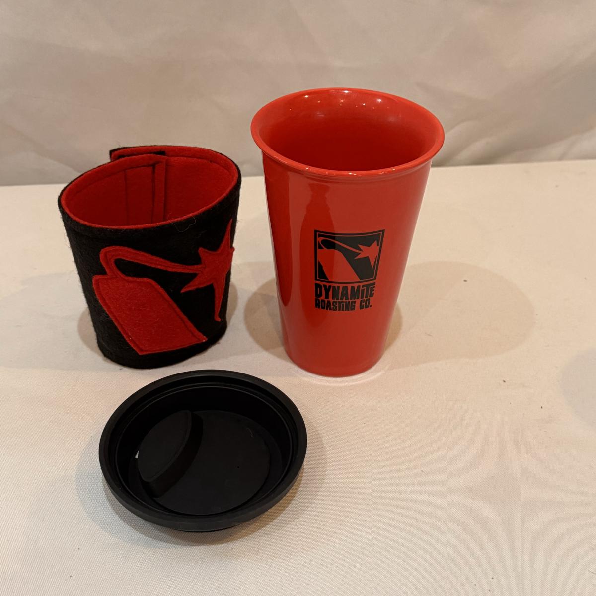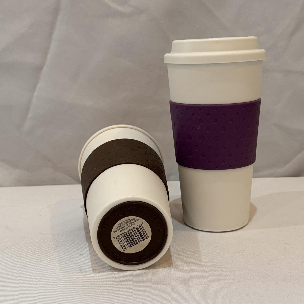 This lot includes six Diamond Brand travel coffee mugs with handles and lids, two Copco coffee mugs with lids and silicone sleeves, one coffee tumbler from Dynamite Roasting Co with a removable felt sleeve, one Travel Smart beverage heater, and one white vacuum flask. The Travel Smart beverage heater powered on when plugged in. The vacuum flask measures 5.25” x 12”H. Shipping available.