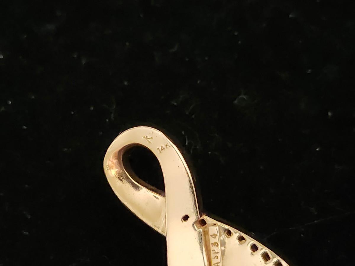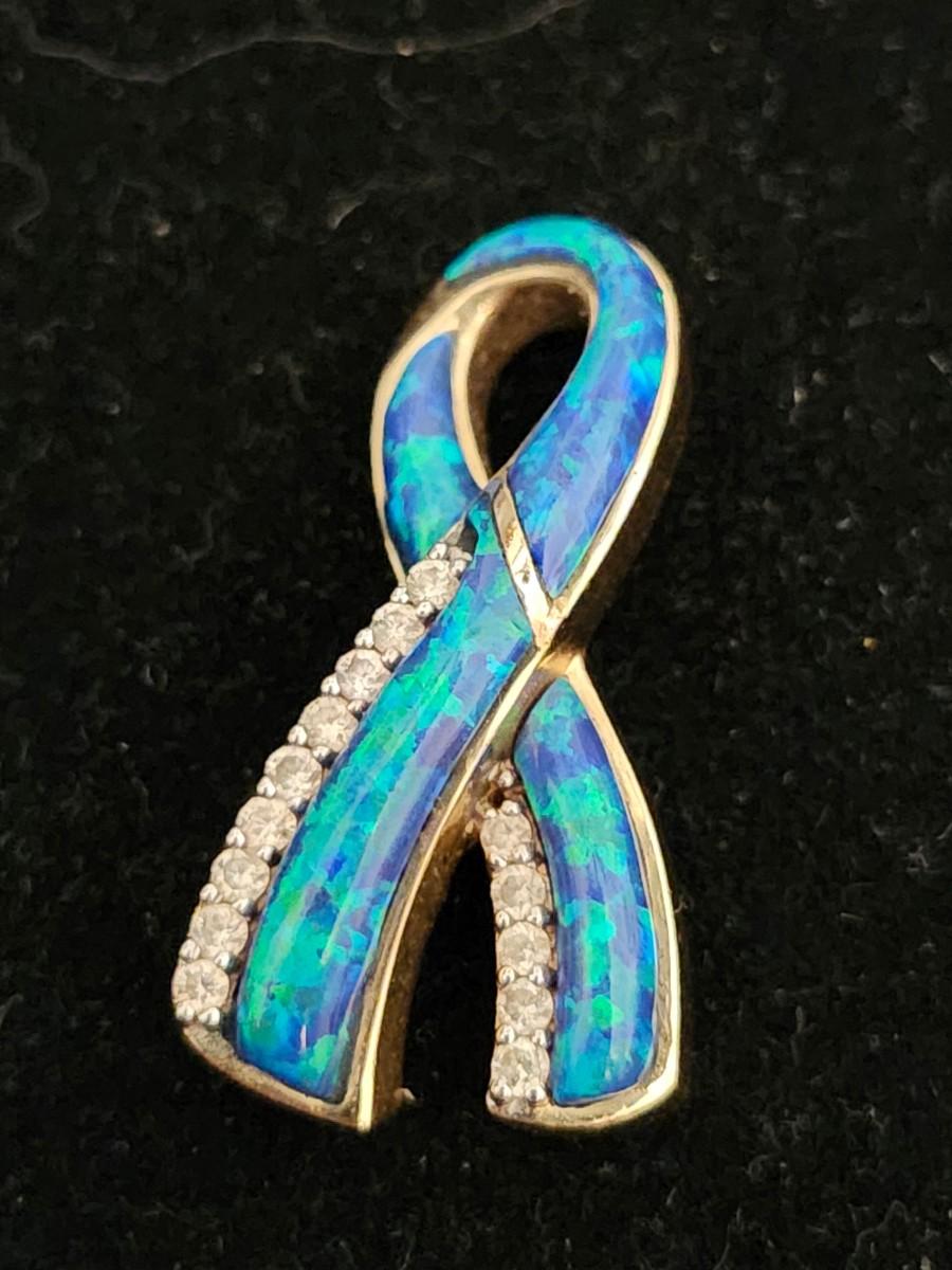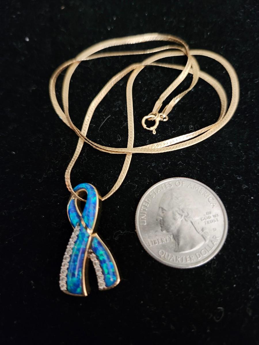 This is such a beautiful necklace! The diamonds and opal are set in a 14K gold setting, and the 20 inch chain is 14K gold also. The pendant alone is retailing at over $1500.