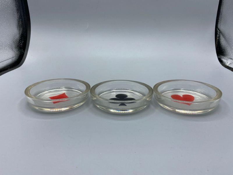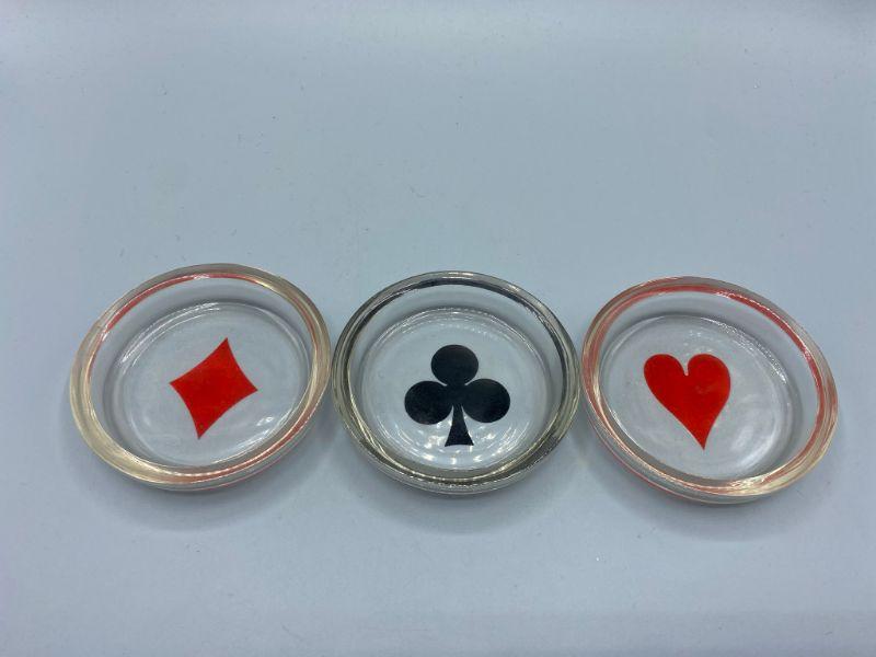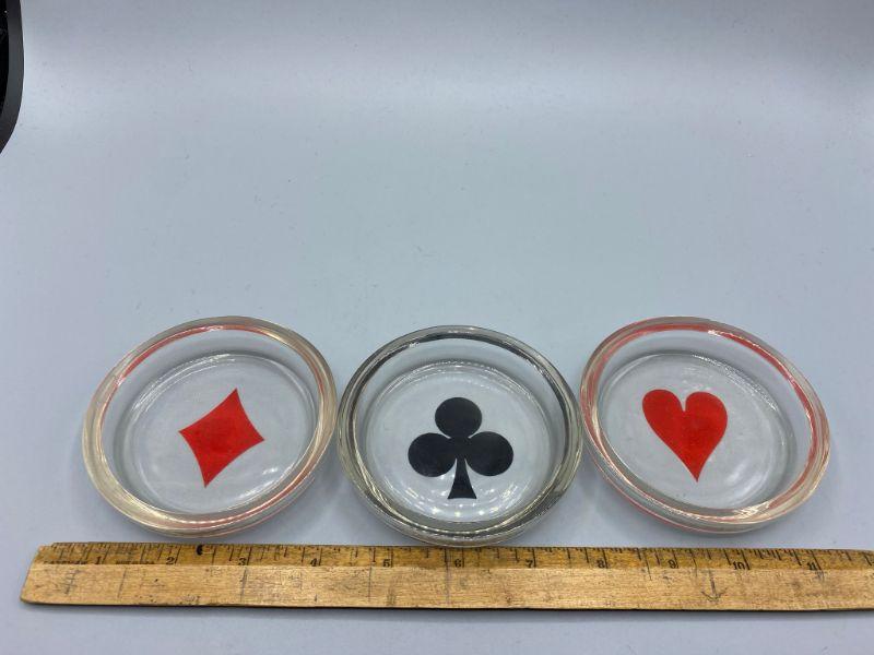 Add a little detail to your next poker night with these vintage ash trays. Diamond, club, and heart, spade is missing. Great for use as coasters. Good condition. About 3" size.
