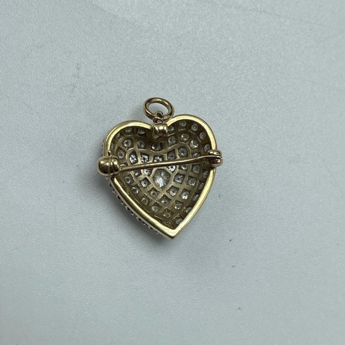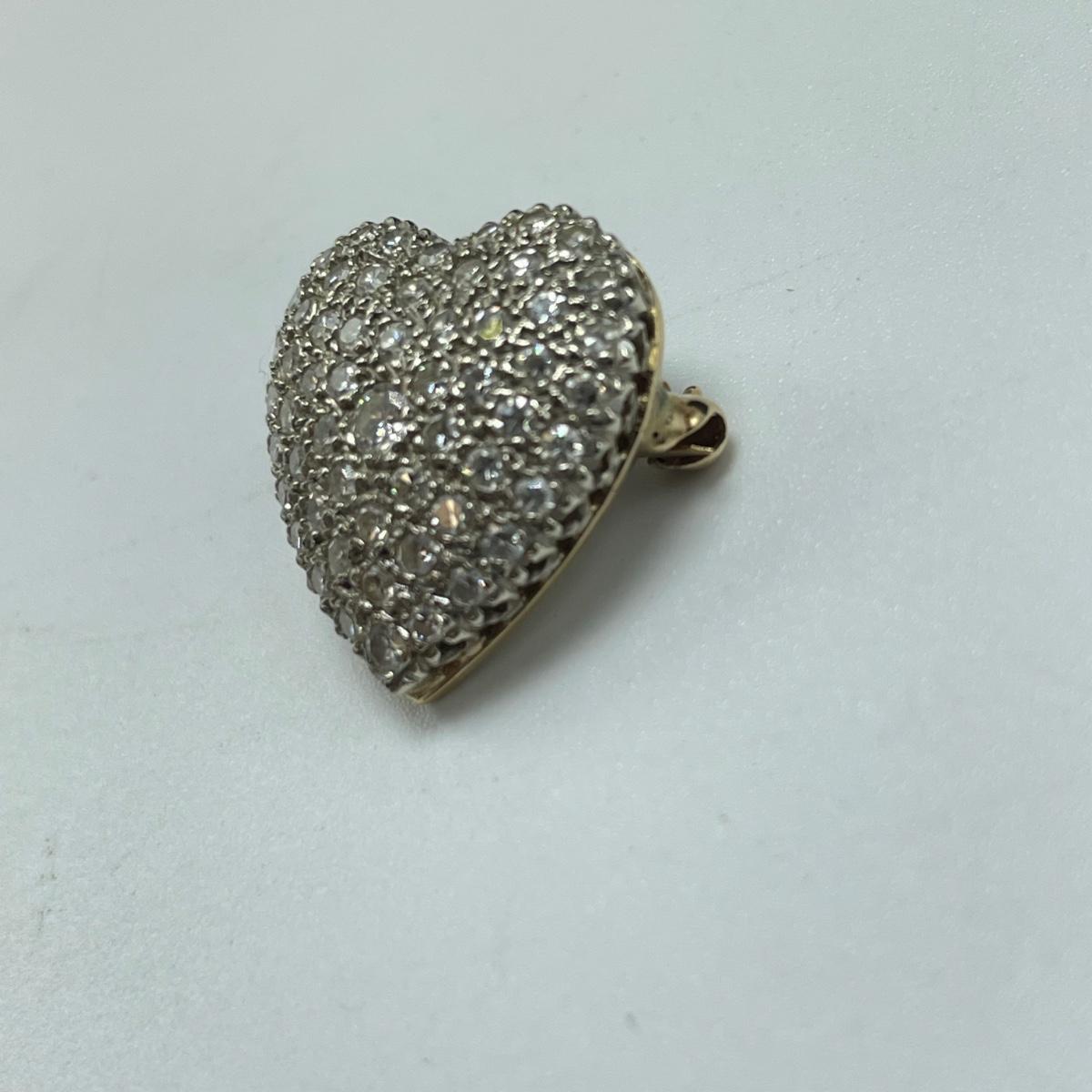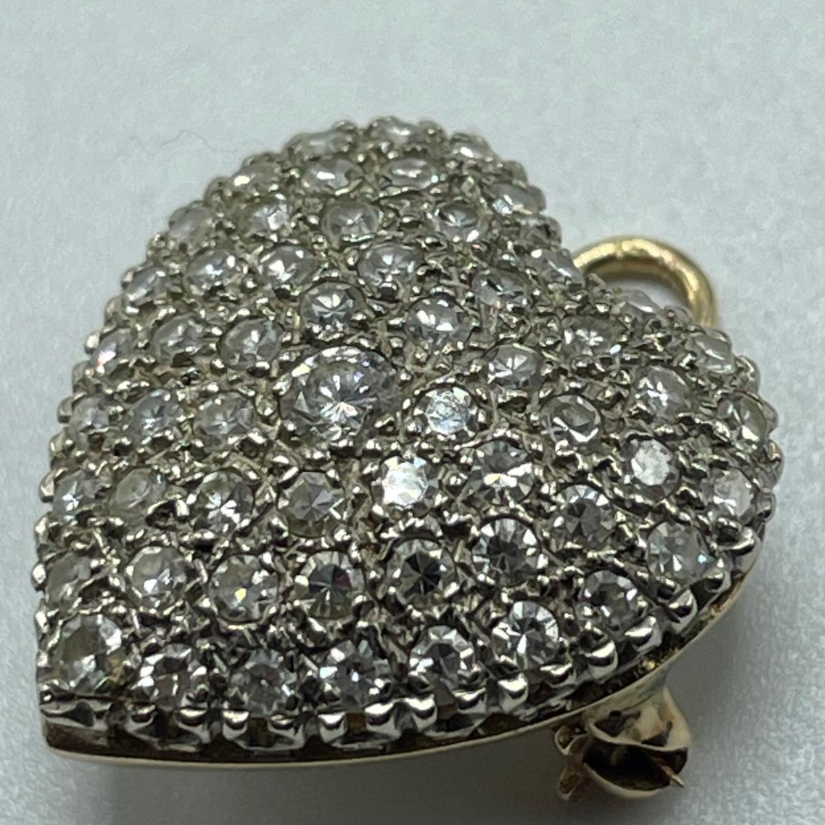 Sparkling .75” heart pendant-brooch. The larger center gem tested as a diamond, the smaller gems were inconclusive on our tester. The pendant clasp could possibly have a smudged 14K marker, but we cannot verify, see images. Pendant is not attracted to magnets. We cannot guarantee the authenticity of the gemstones. All sales are final. No returns or refunds. Please bid accordingly.