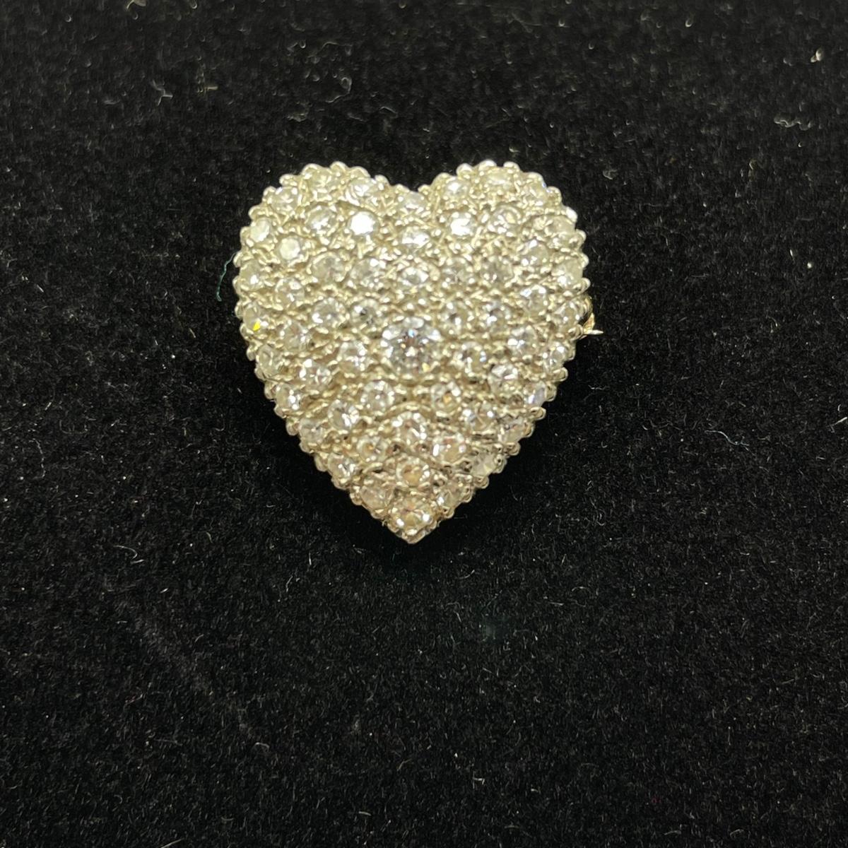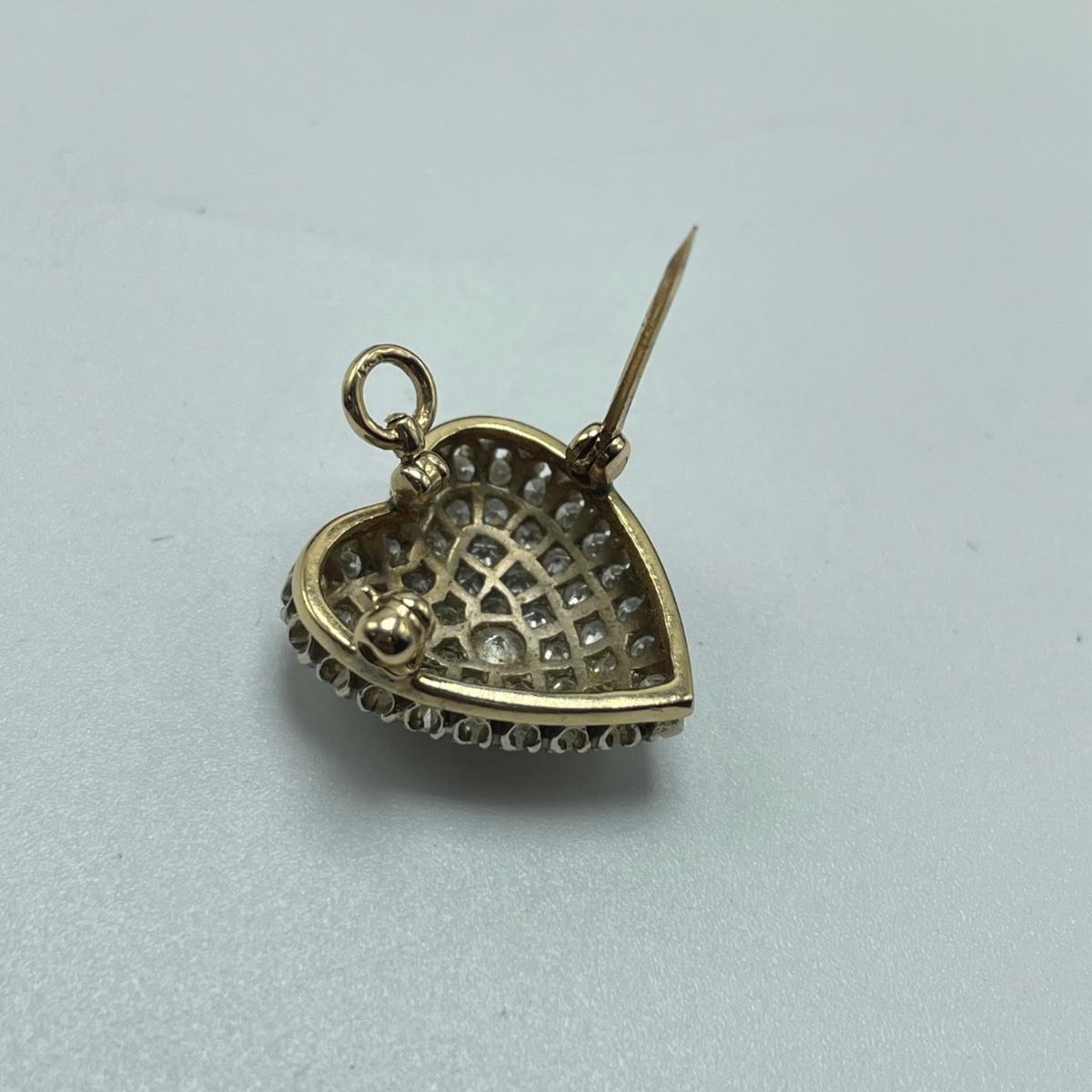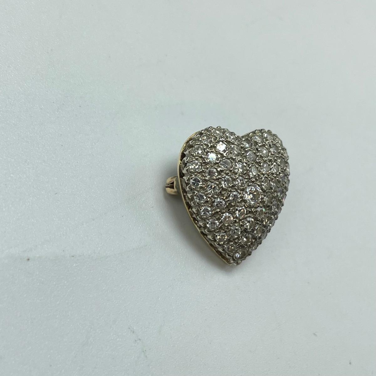 Sparkling .75” heart pendant-brooch. The larger center gem tested as a diamond, the smaller gems were inconclusive on our tester. The pendant clasp could possibly have a smudged 14K marker, but we cannot verify, see images. Pendant is not attracted to magnets. We cannot guarantee the authenticity of the gemstones. All sales are final. No returns or refunds. Please bid accordingly.