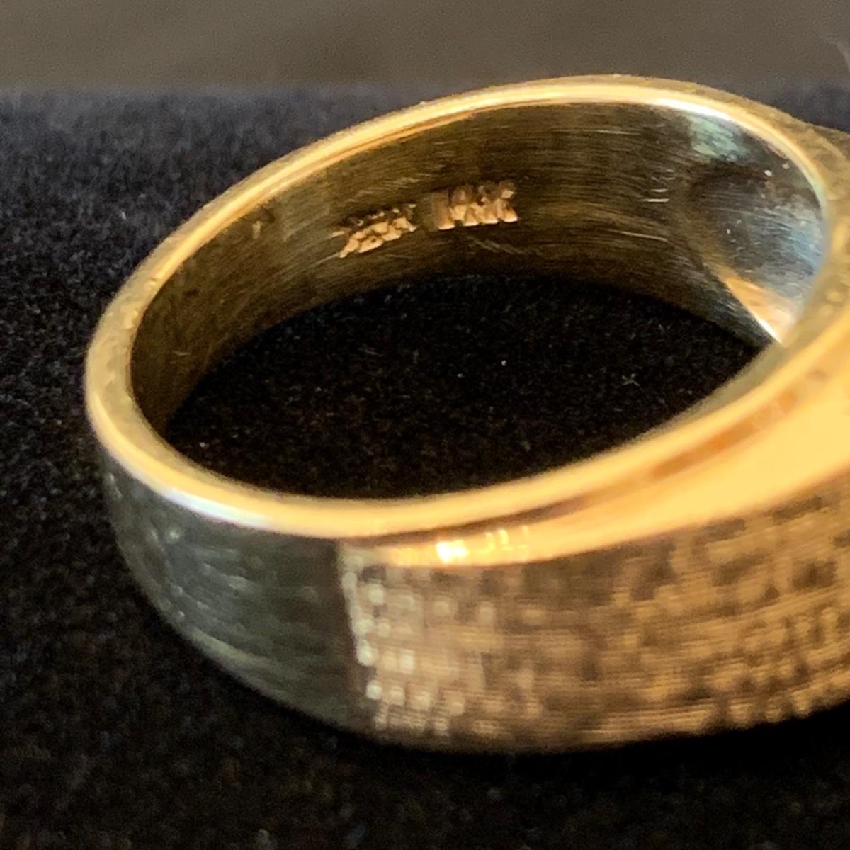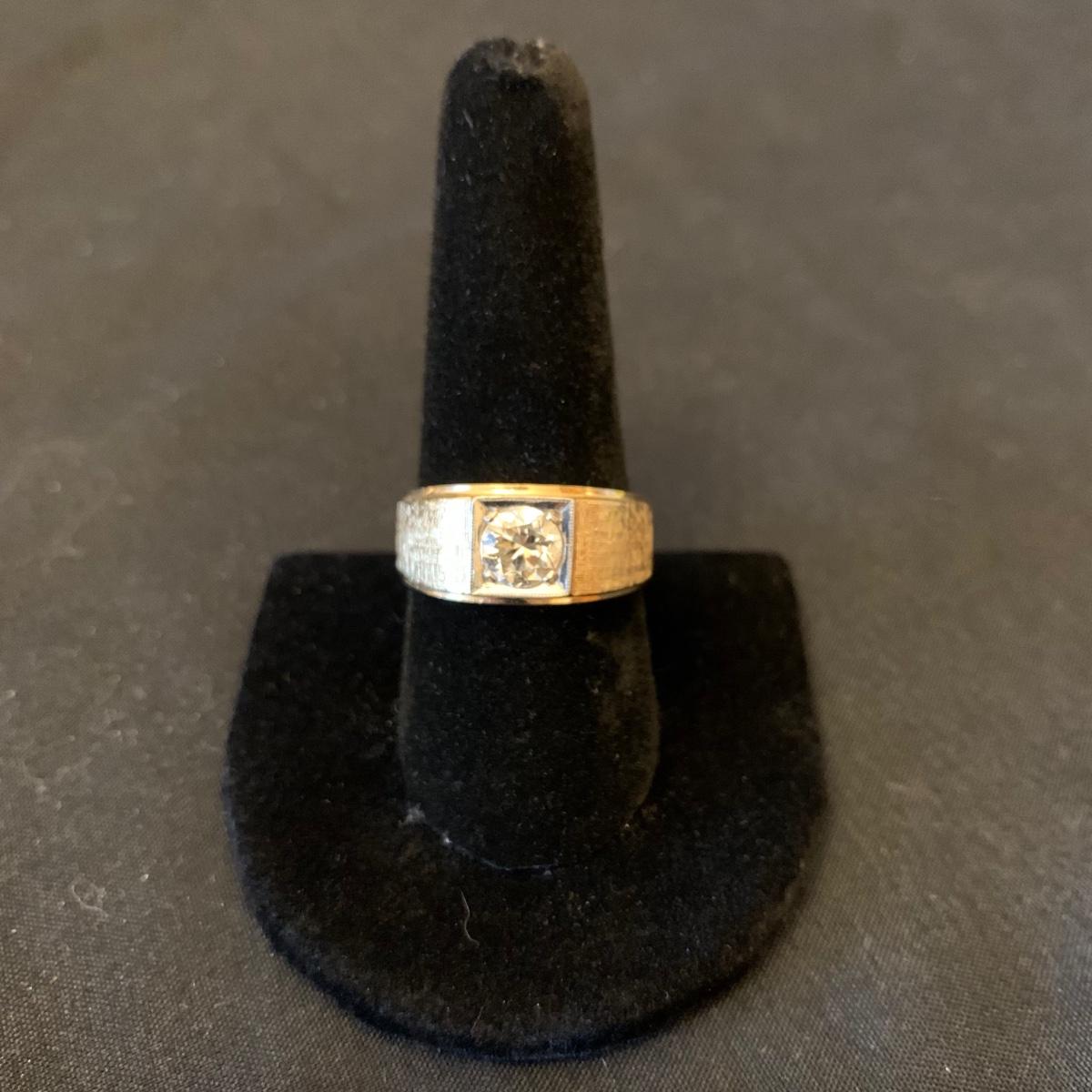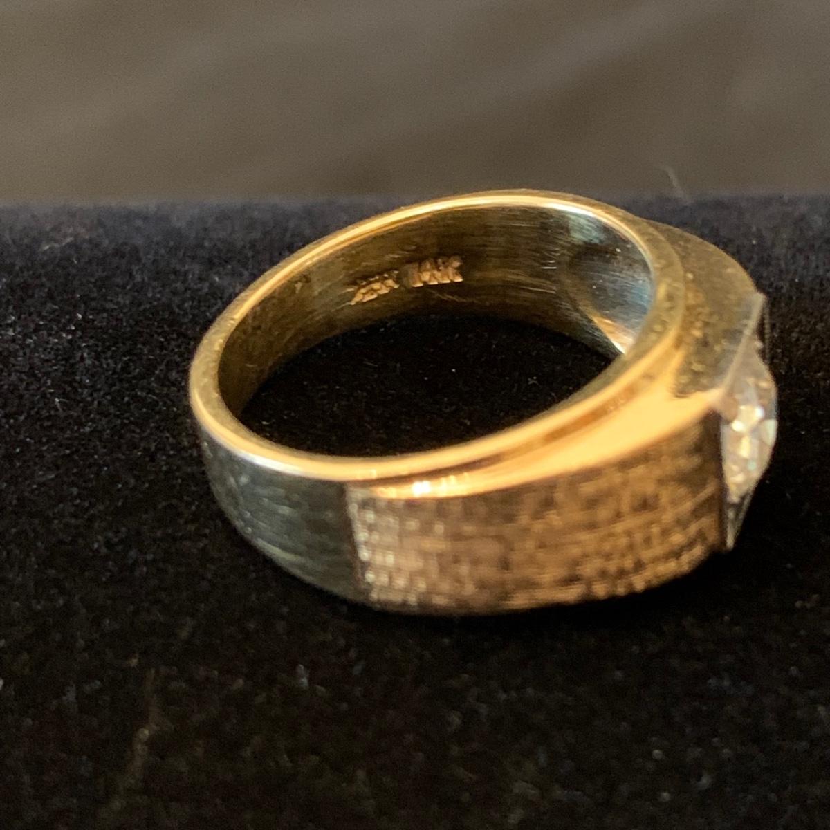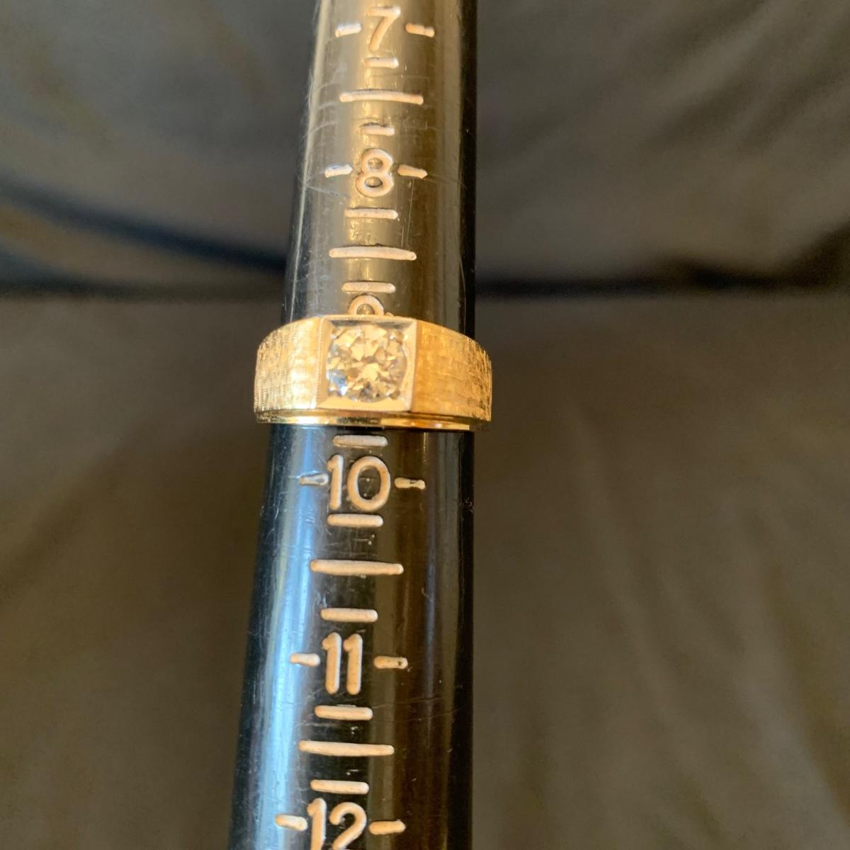 Gold diamond ring stamped 14K. The gemstone tested positive as a diamond on our diamond tester but we can not guarantee. The gold band is textured. Please see photos for size and condition.