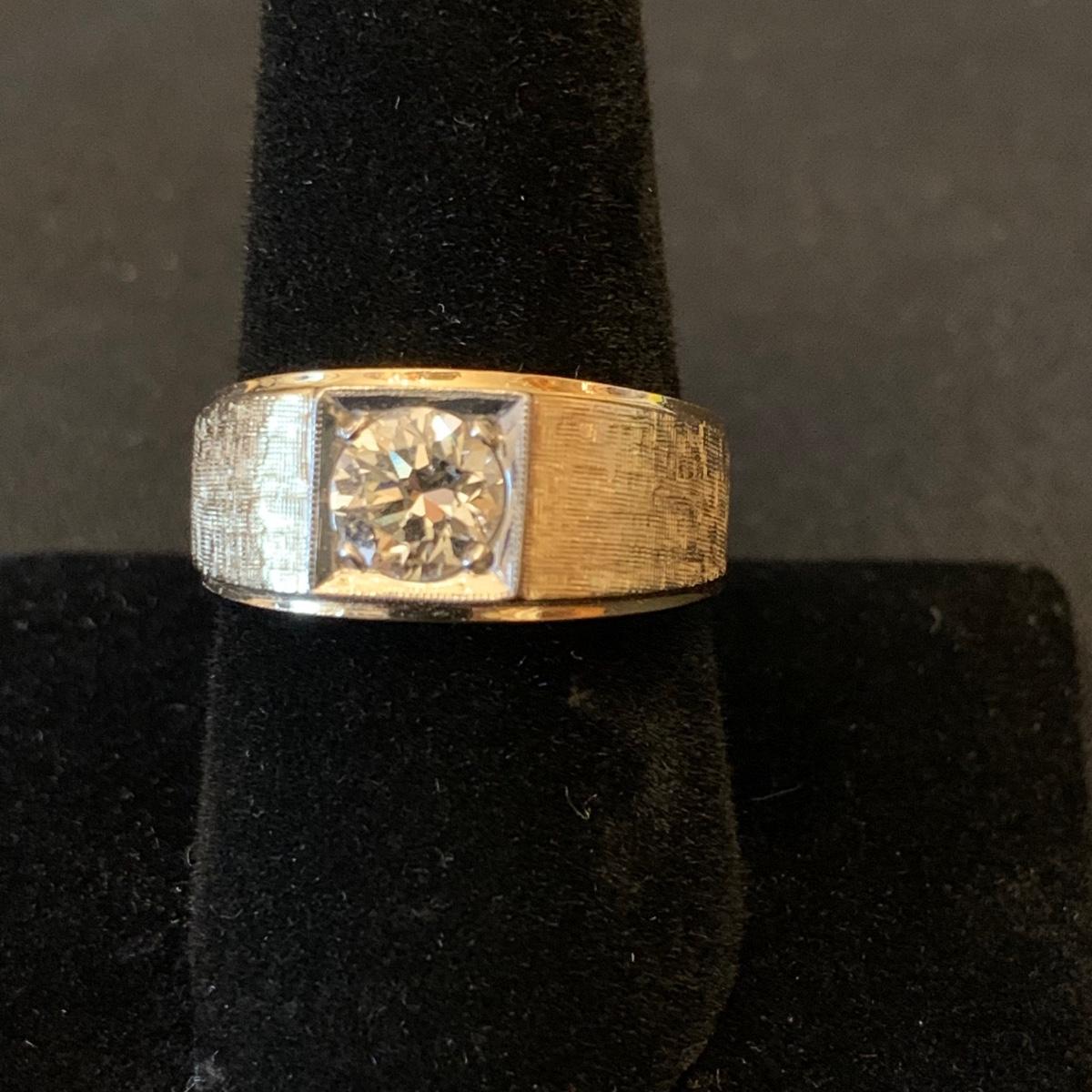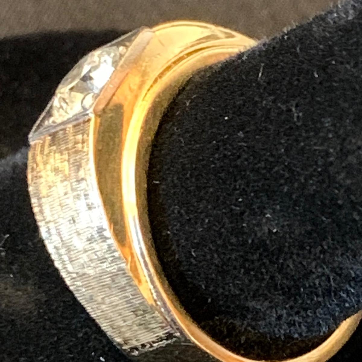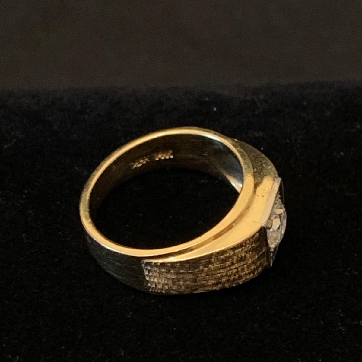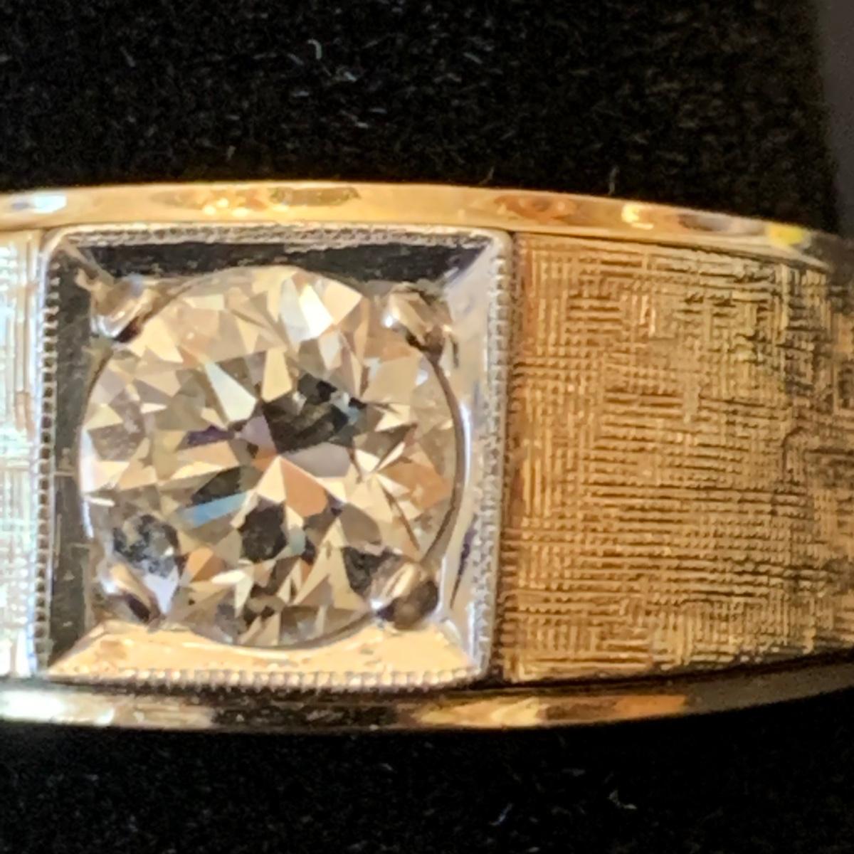 Gold diamond ring stamped 14K. The gemstone tested positive as a diamond on our diamond tester but we can not guarantee. The gold band is textured. Please see photos for size and condition.