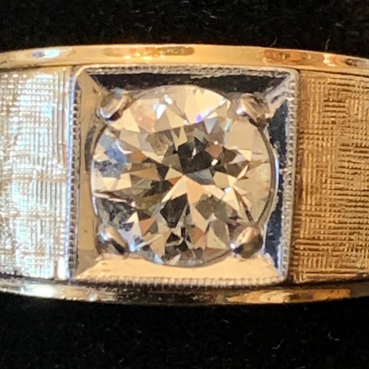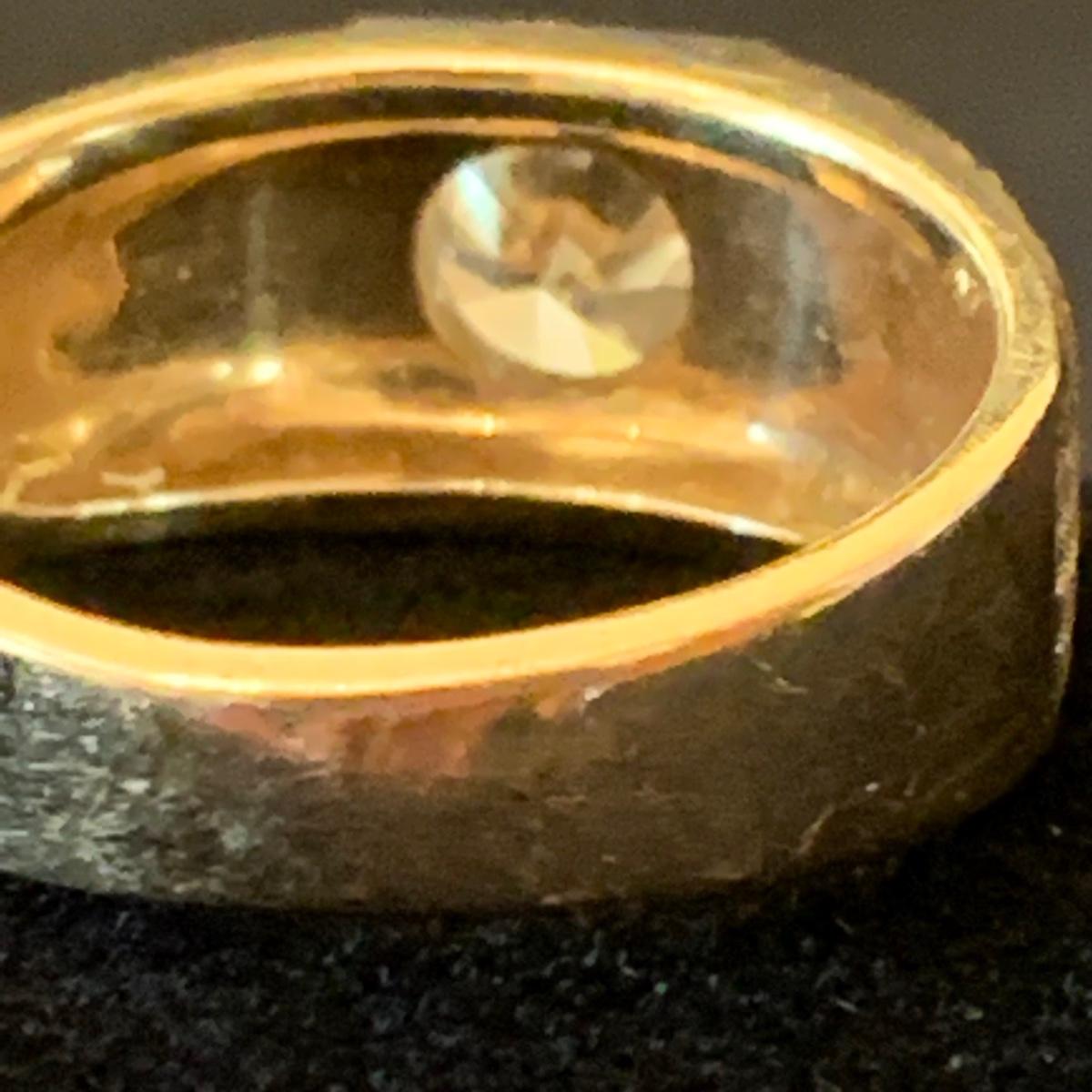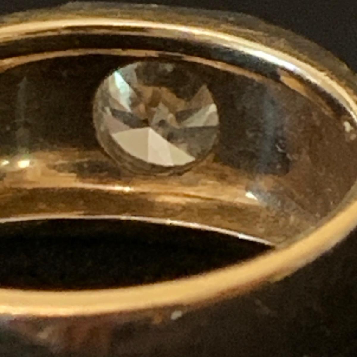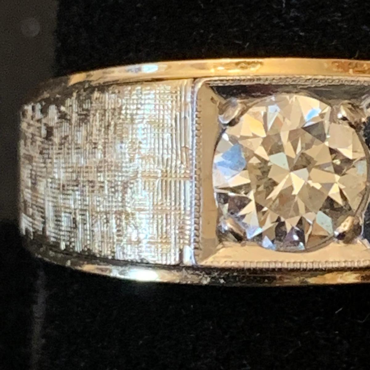 Gold diamond ring stamped 14K. The gemstone tested positive as a diamond on our diamond tester but we can not guarantee. The gold band is textured. Please see photos for size and condition.