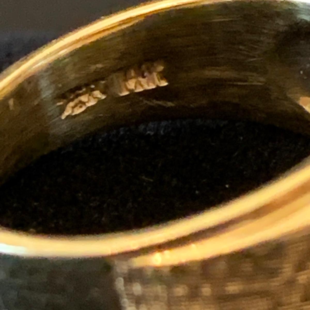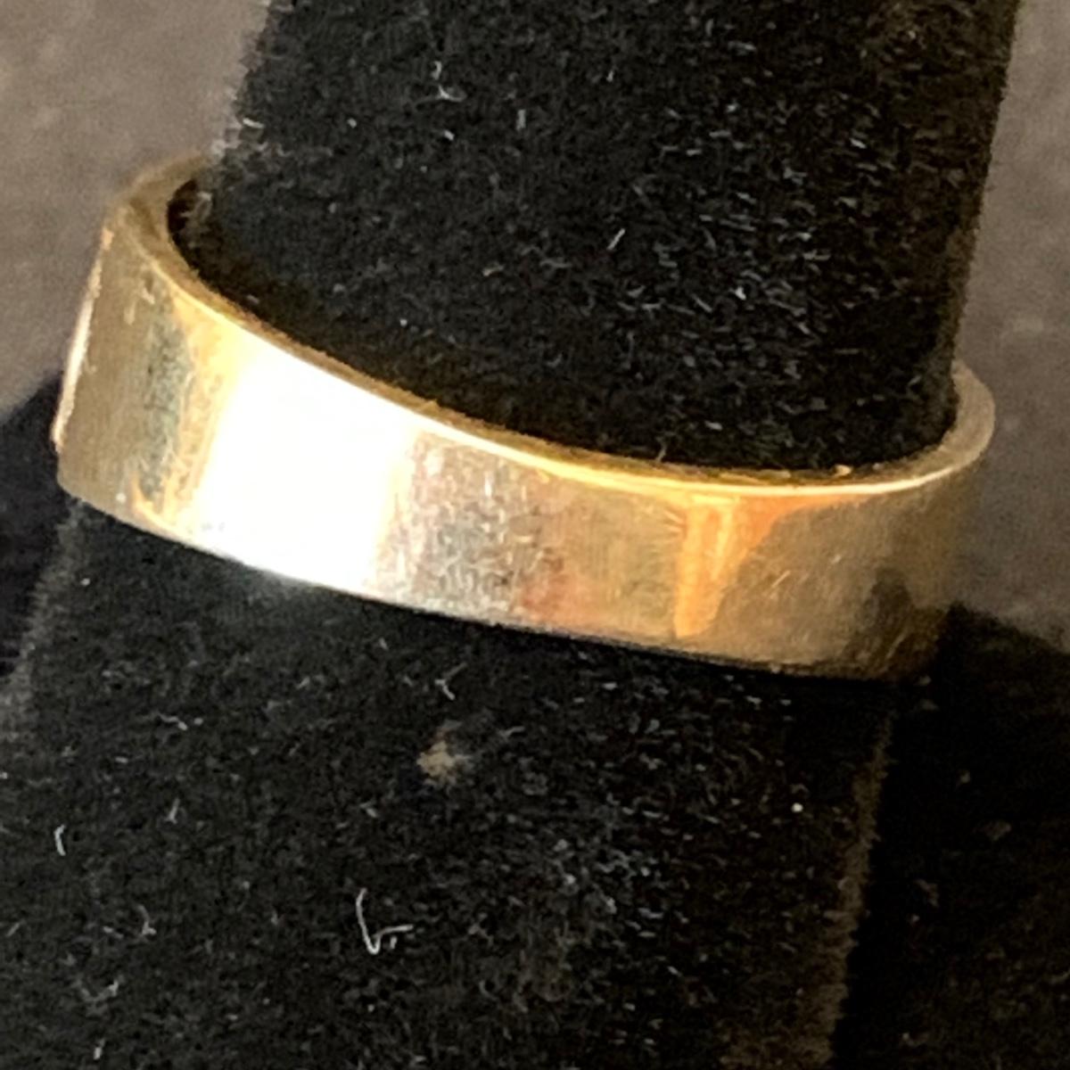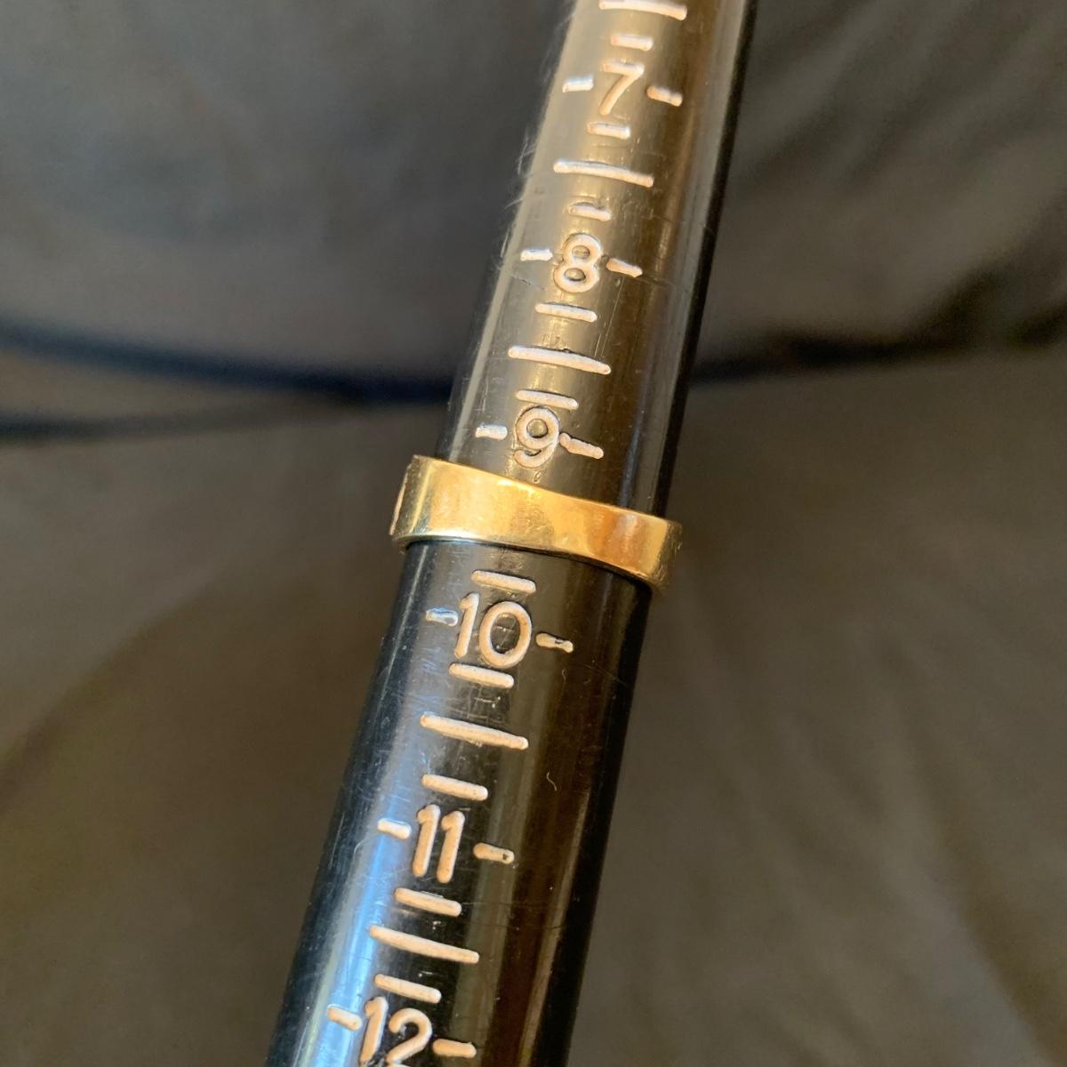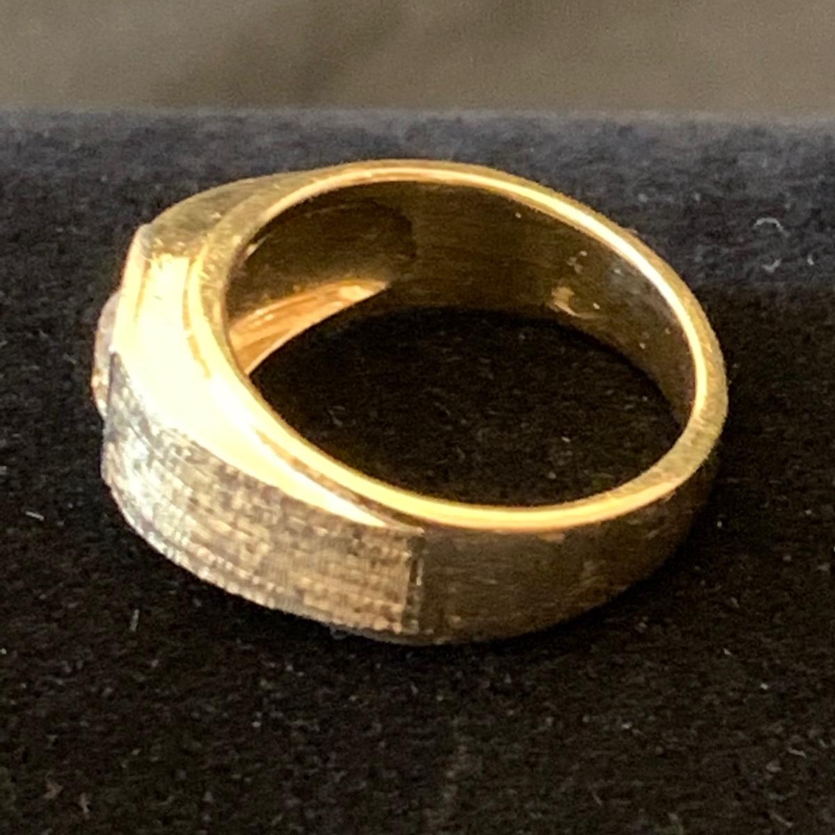 Gold diamond ring stamped 14K. The gemstone tested positive as a diamond on our diamond tester but we can not guarantee. The gold band is textured. Please see photos for size and condition.