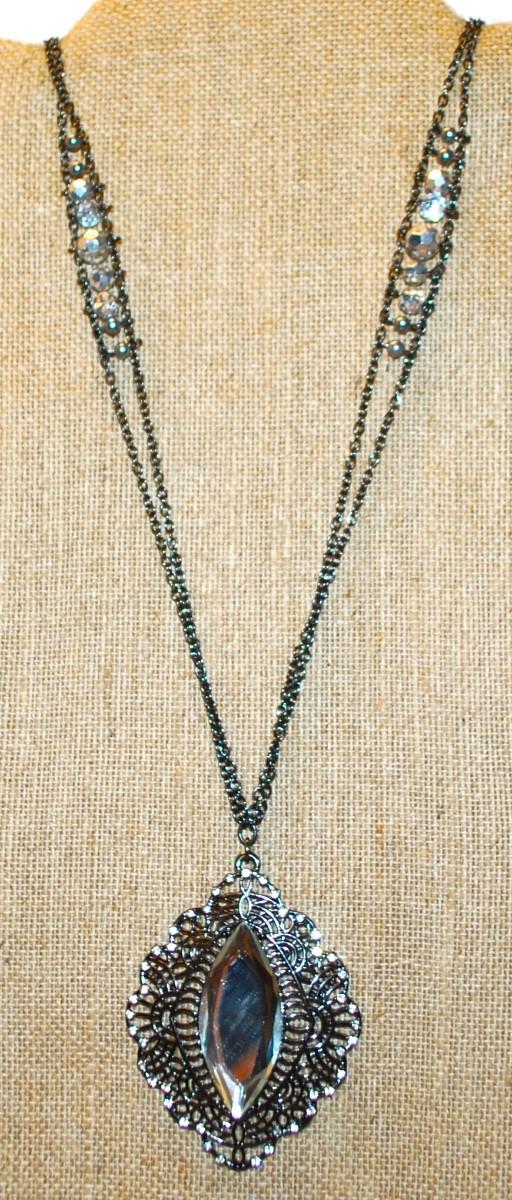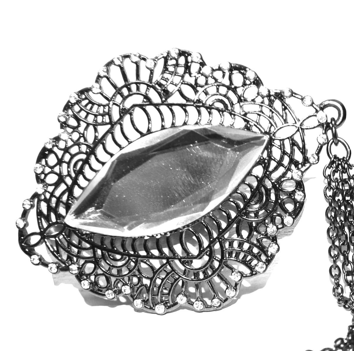 Diamond Shape Clear Acrylic PENDANT (3" x 2") on Black Designed Clear Stones Perimeter-NOTE the Unique UPPER CHAIN ACCENTS 32" L