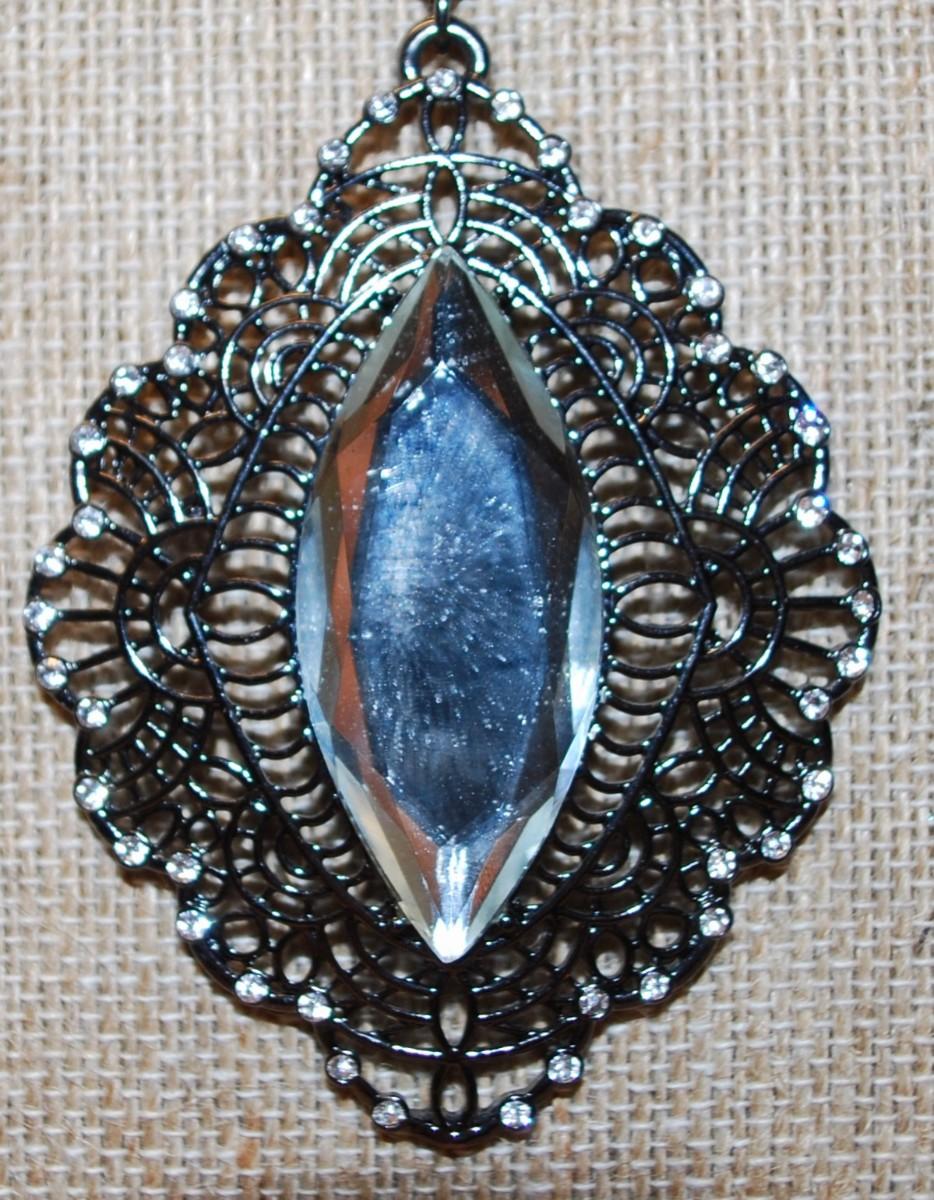 Diamond Shape Clear Acrylic PENDANT (3" x 2") on Black Designed Clear Stones Perimeter