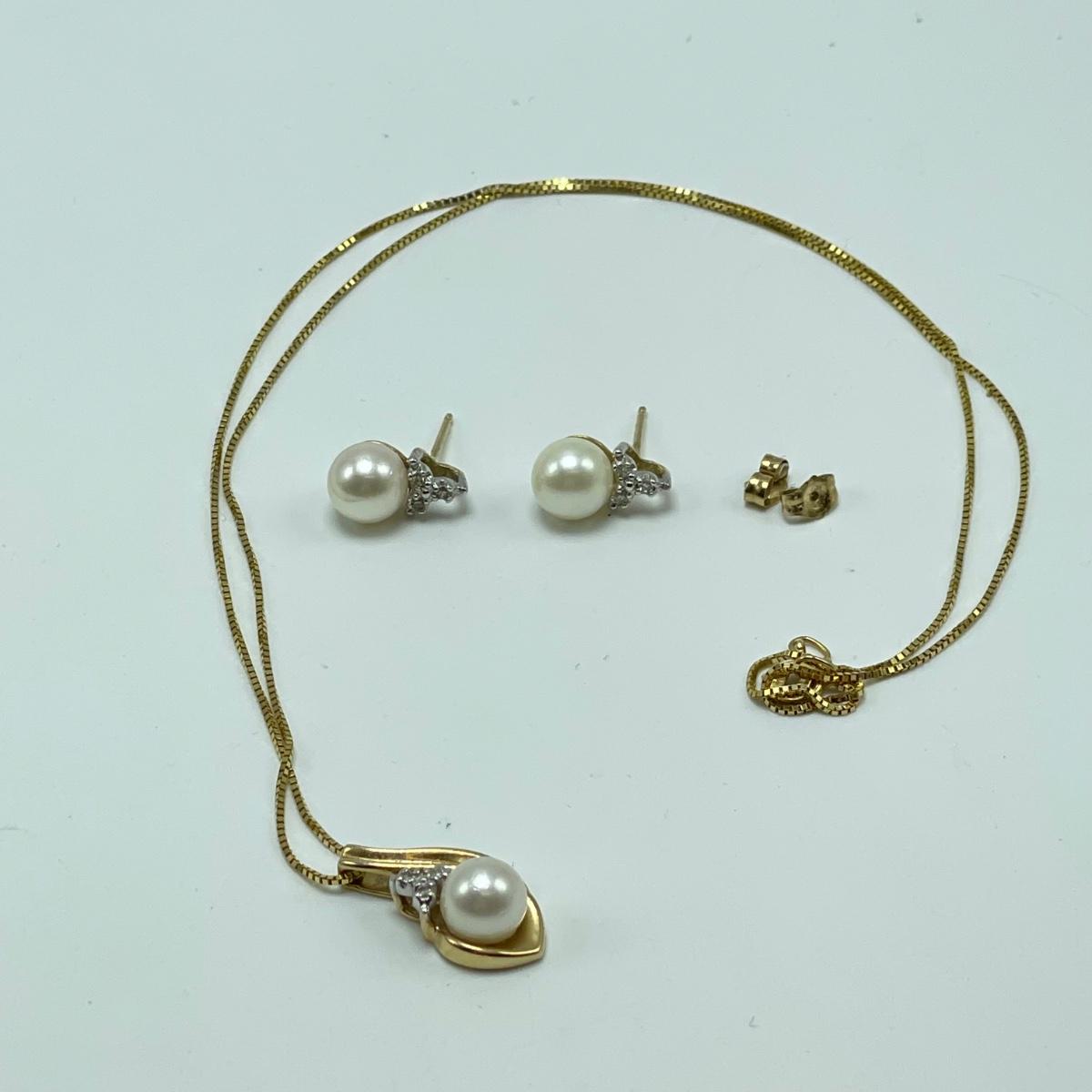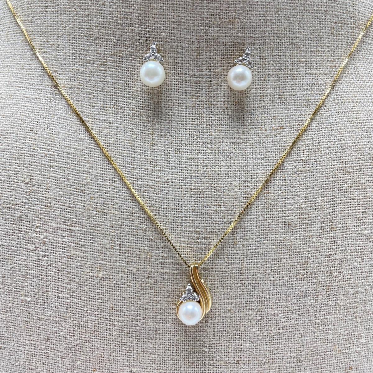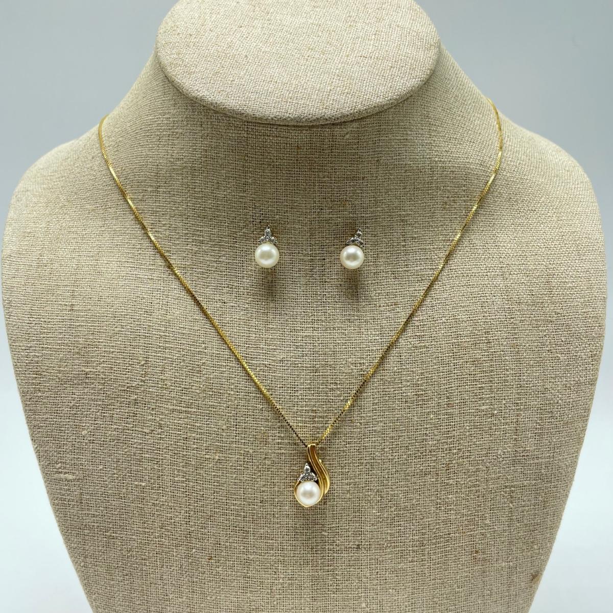 Stunning set of earrings for pierced ears with centerpieces that appear to be pearls and accent stones that tested positive for diamonds. Pendant, 18” chain and earrings are all stamped 14K. See images for other markings. Shipping available. All sales are final. No returns or refunds. Please bid accordingly.