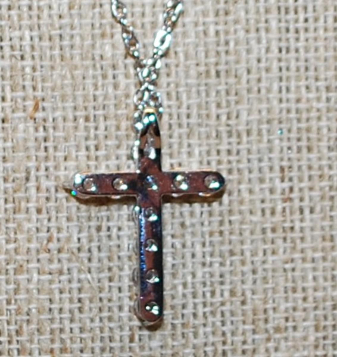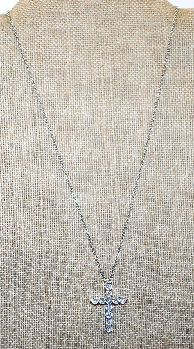 Diamond-Style Clear Stones CROSS with 7 Down & 5 Across Setting 1" x ¾" on a Silver Tone Necklace Chain 16" L