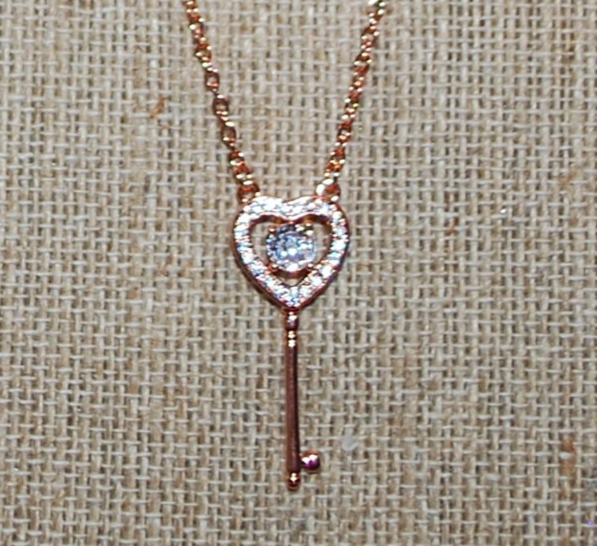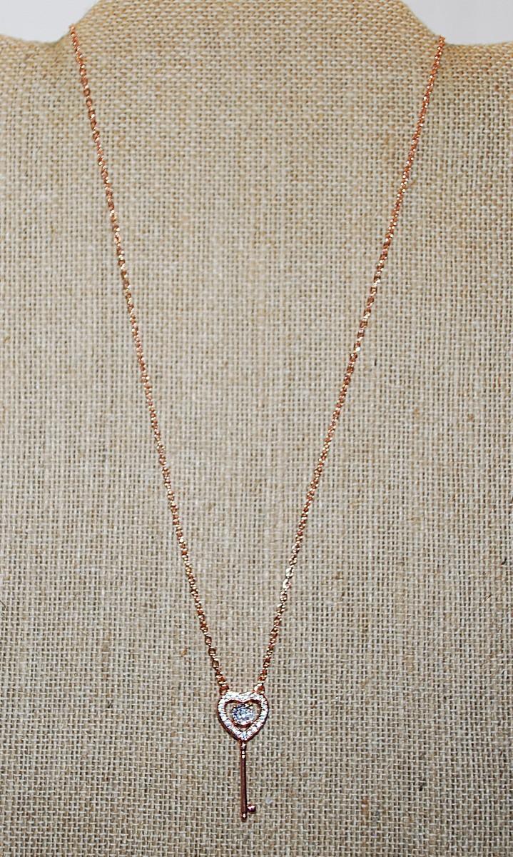 Diamond-Style ROSE GOLD Heart Shaped KEY PENDANT 1¼" x ½" on a Rose Gold Necklace Chain 17" L