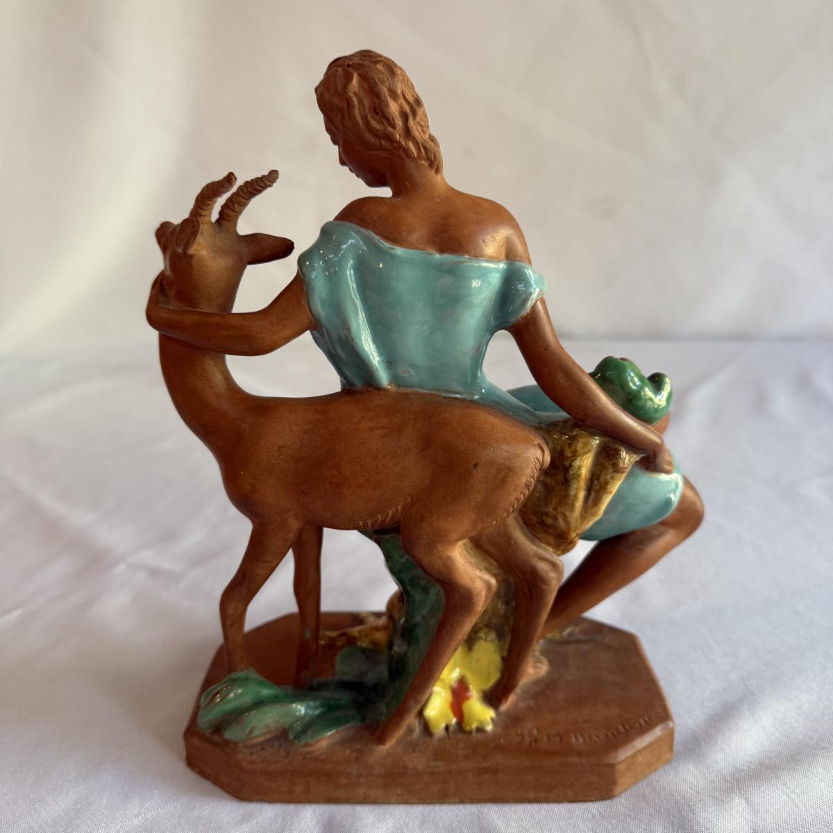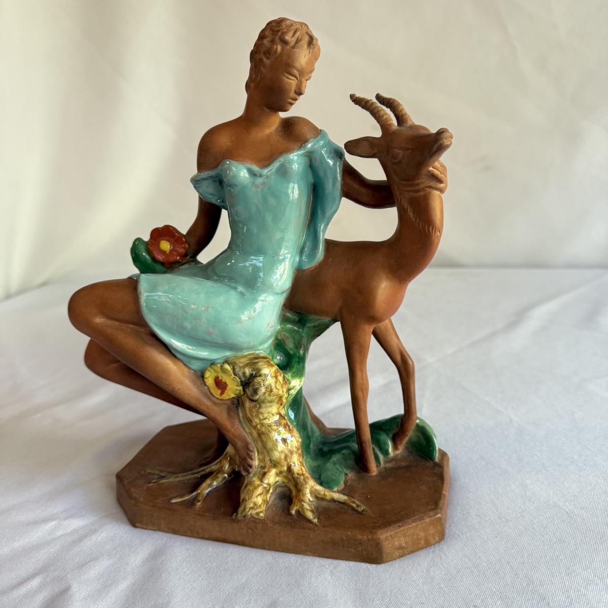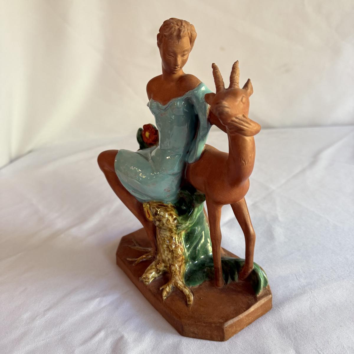 This lot contains a lovely sculpture depicting Goddess Diana of the hunt with a deer. This piece is made out of partially glazed terracotta. This item measures 7” x 4” x 10”H. Shipping available.