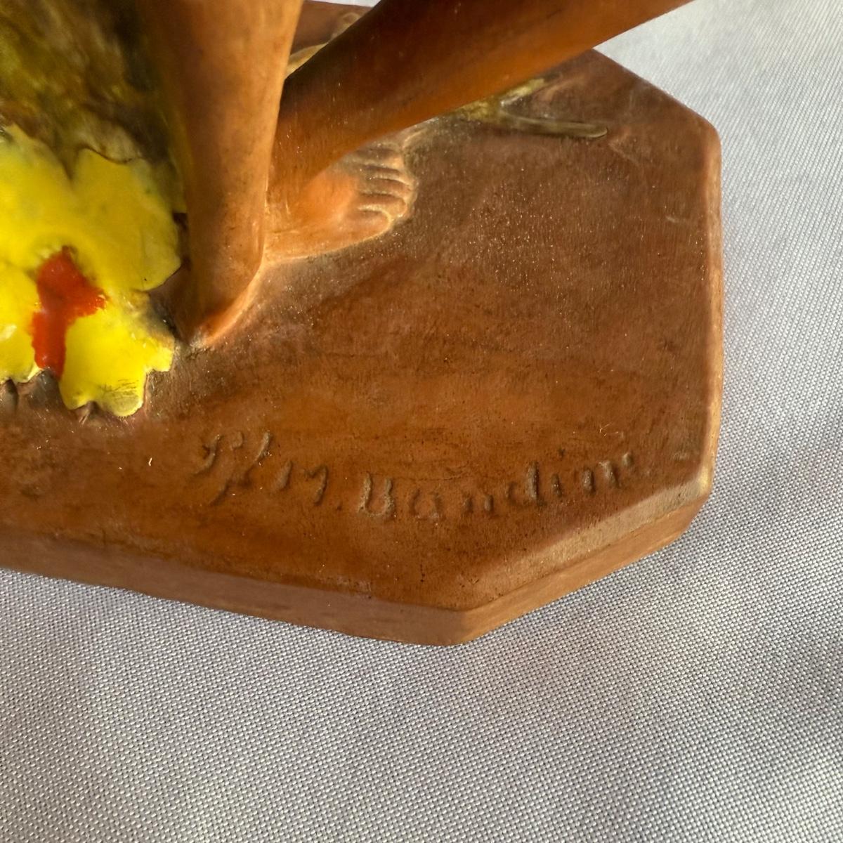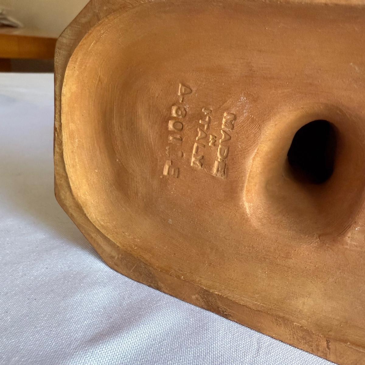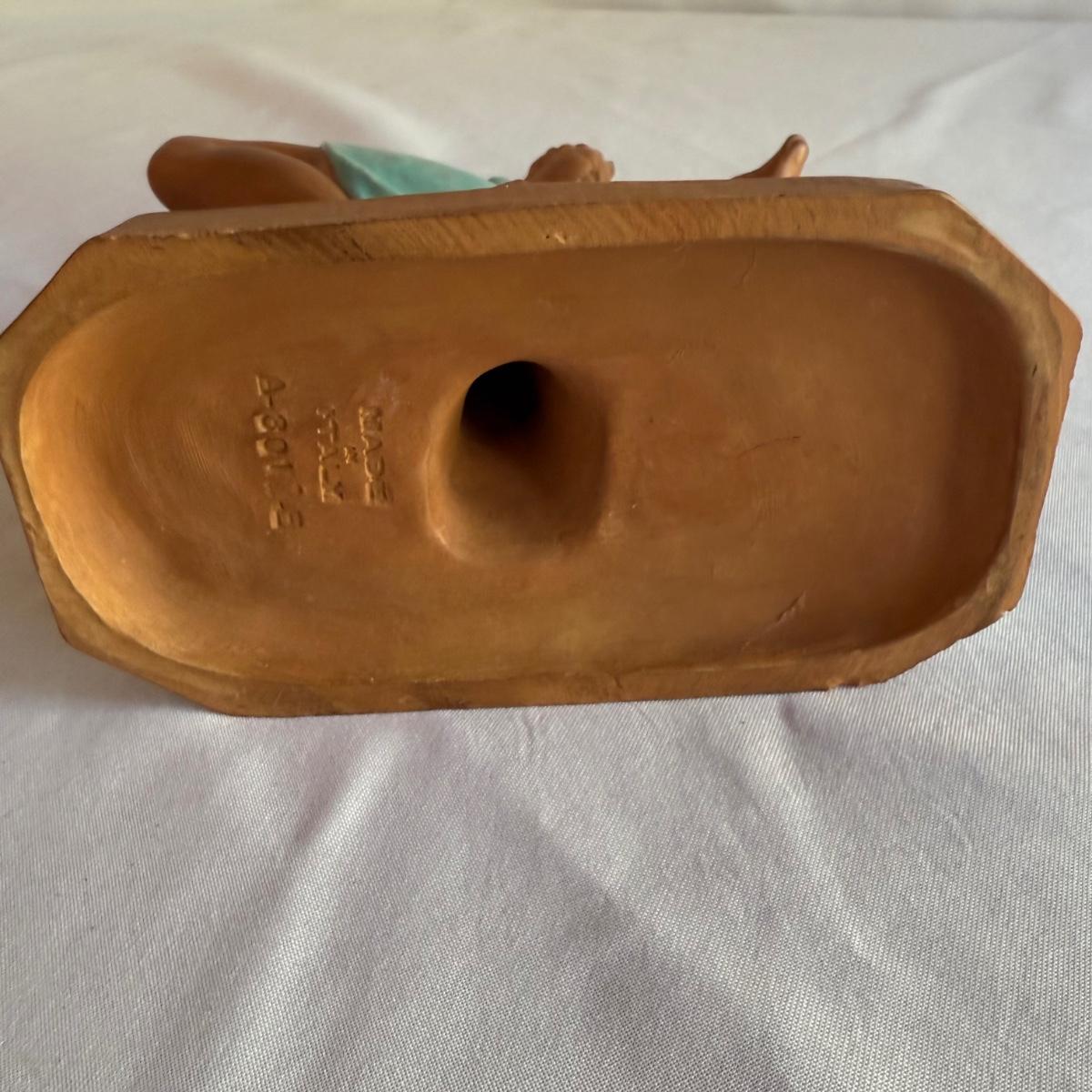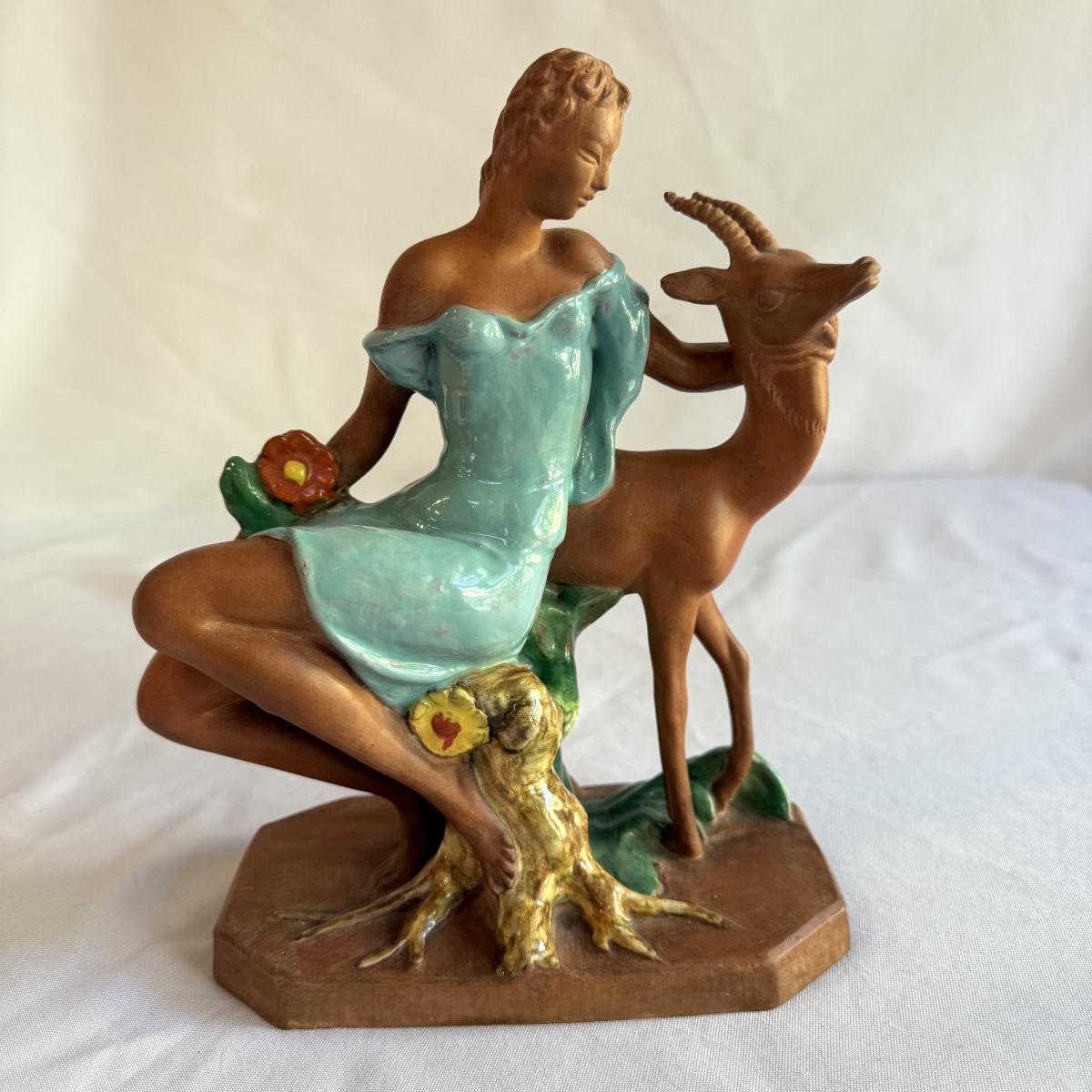 This lot contains a lovely sculpture depicting Goddess Diana of the hunt with a deer. This piece is made out of partially glazed terracotta. This item measures 7” x 4” x 10”H. Shipping available.