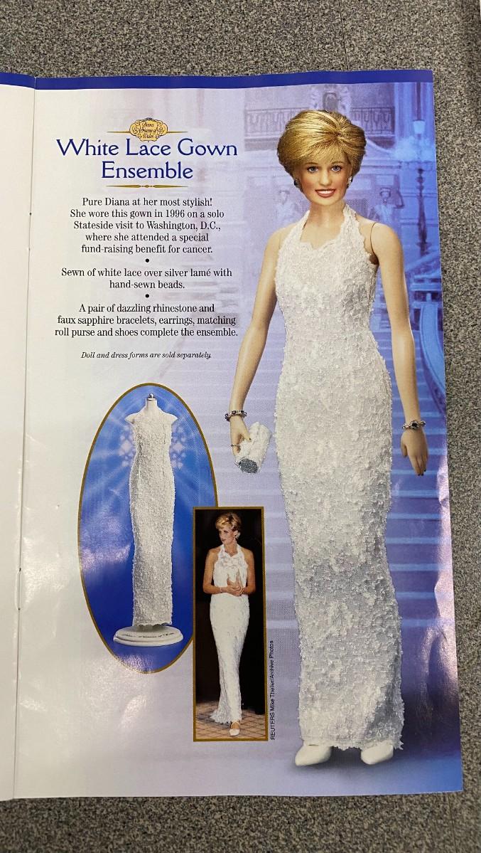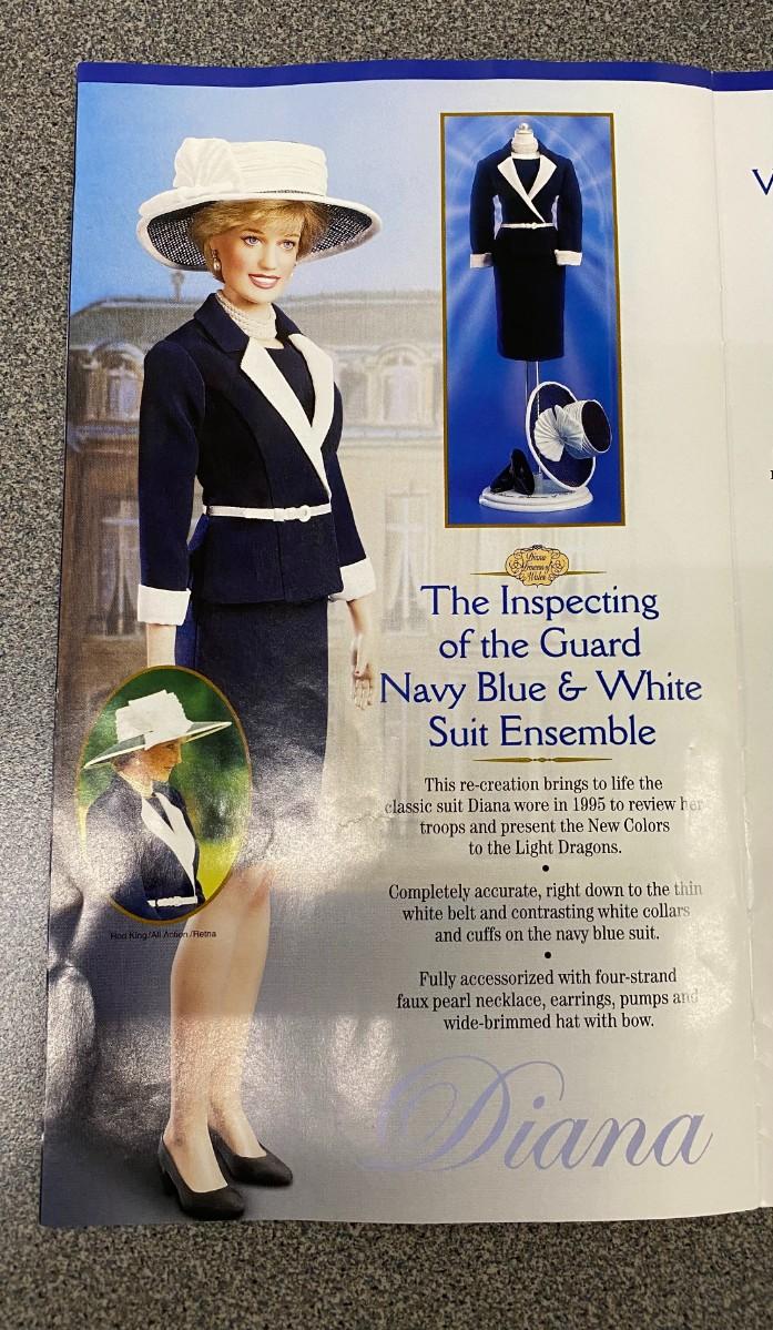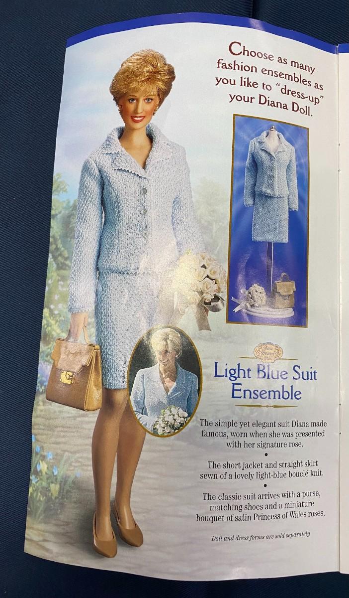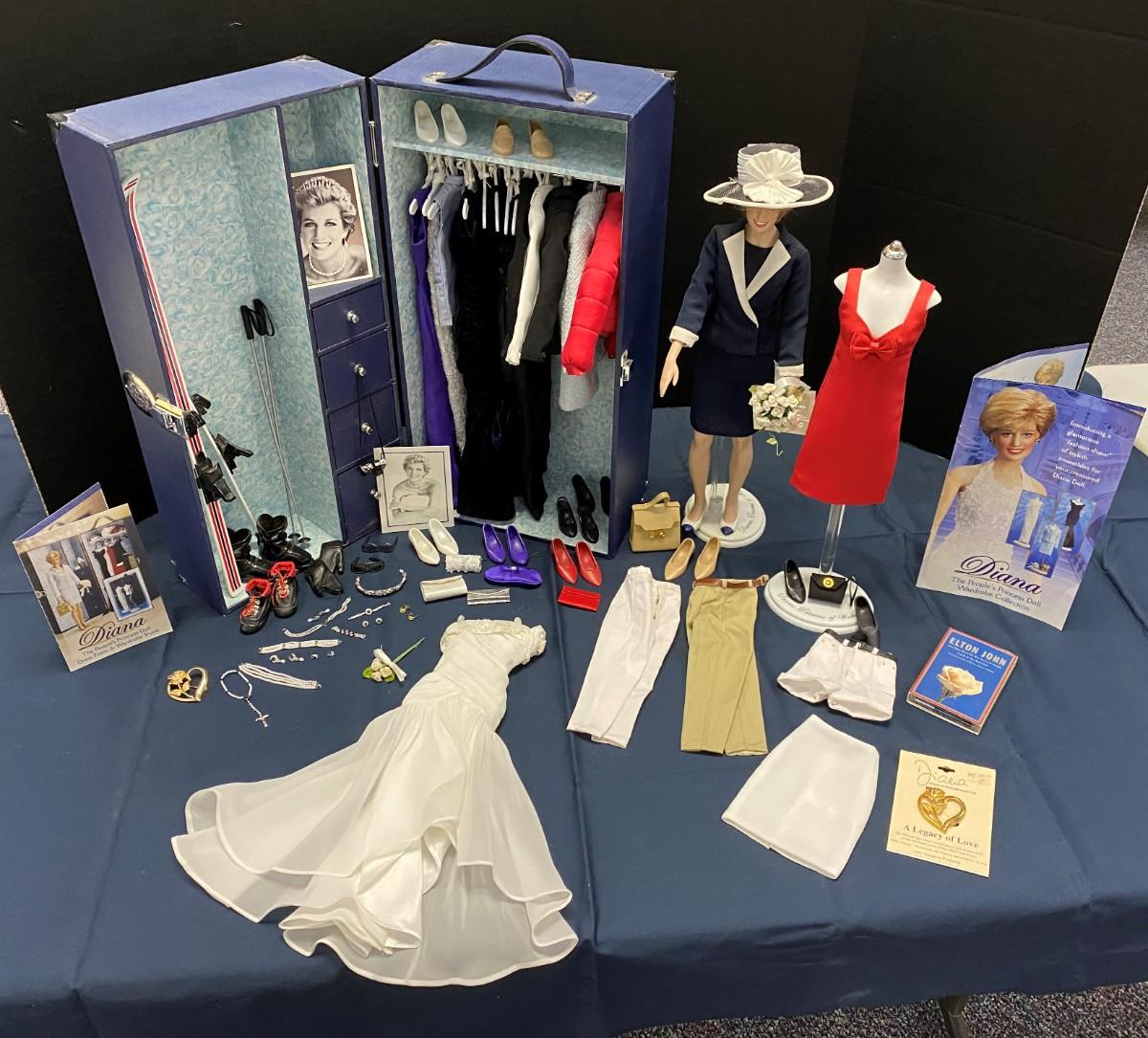 6 Ensembles plus: Ski Outfit, Purple Ball Gown, Black ball gown, Light Blue suit, Midnight blue velvet ball gown, Red dress with dow, Casual Khaki ensemble, Inspecting the Guard, White Lace GOwn Ensemble, jewelry, purses, shoes, ski, and ski poles, boots and gloves, Elton JOhn Tape, and 2 Diana Legacy of Love Pins. Excellent Condition.