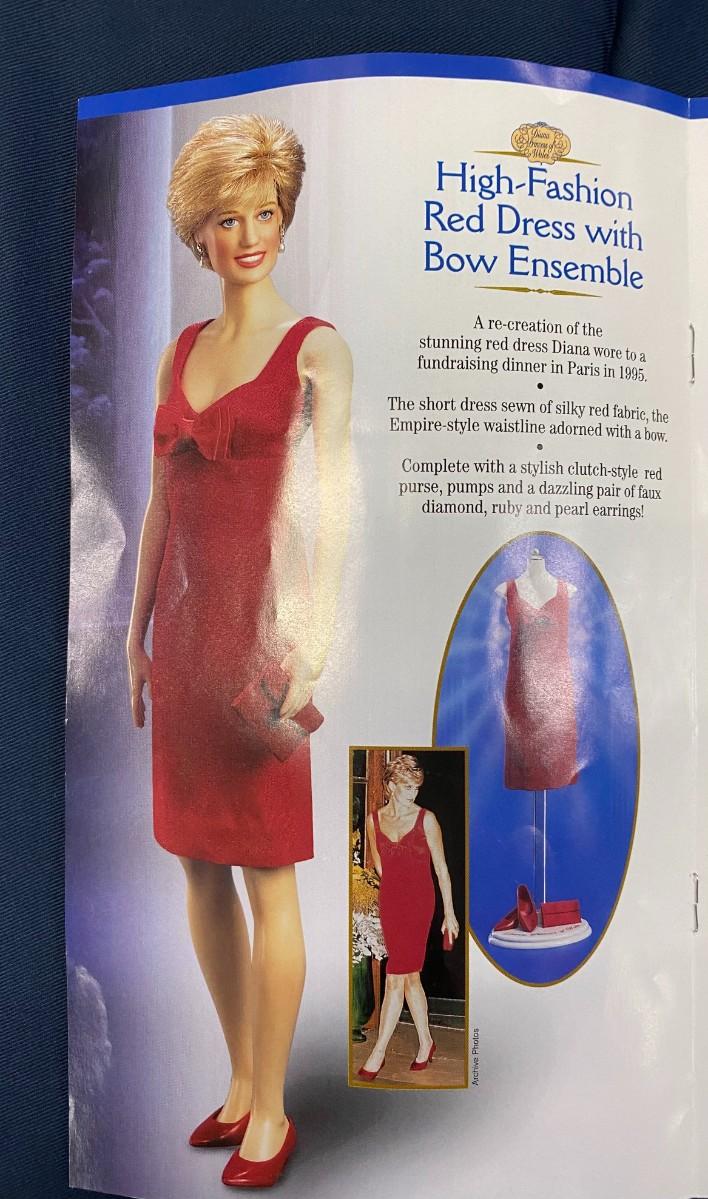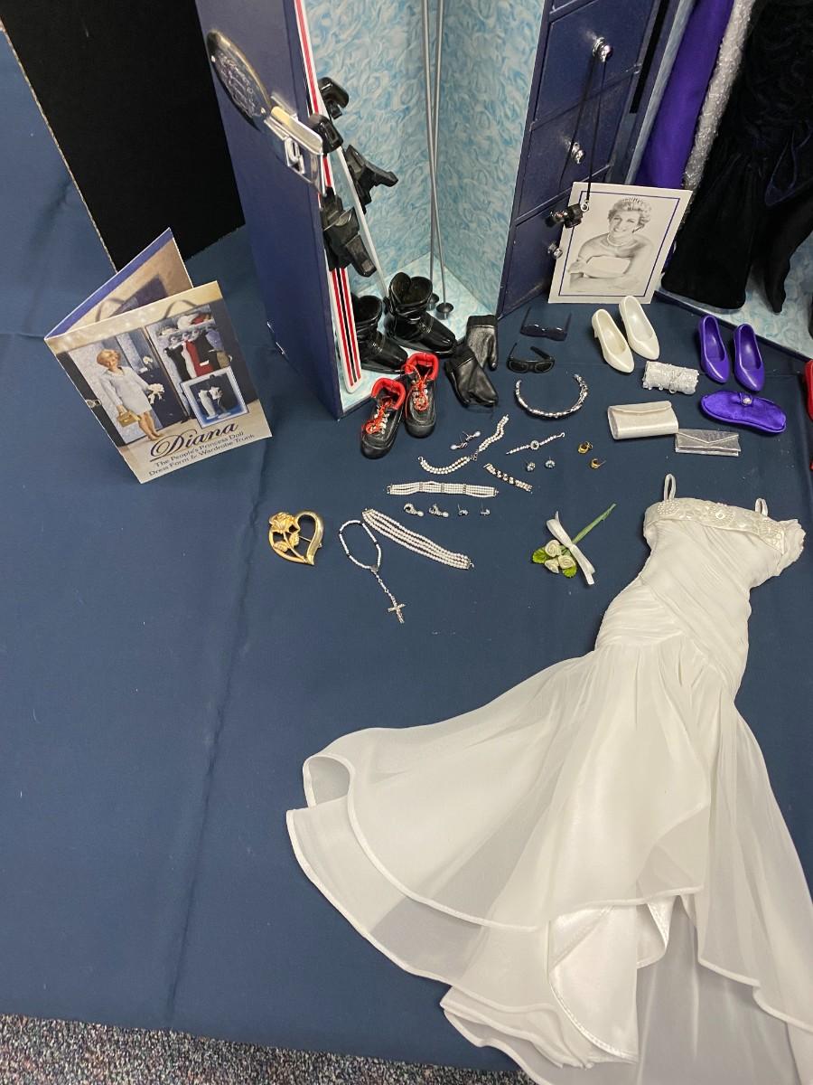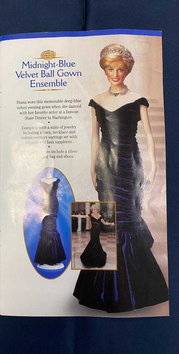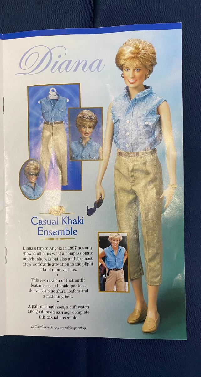 6 Ensembles plus: Ski Outfit, Purple Ball Gown, Black ball gown, Light Blue suit, Midnight blue velvet ball gown, Red dress with dow, Casual Khaki ensemble, Inspecting the Guard, White Lace GOwn Ensemble, jewelry, purses, shoes, ski, and ski poles, boots and gloves, Elton JOhn Tape, and 2 Diana Legacy of Love Pins. Excellent Condition.