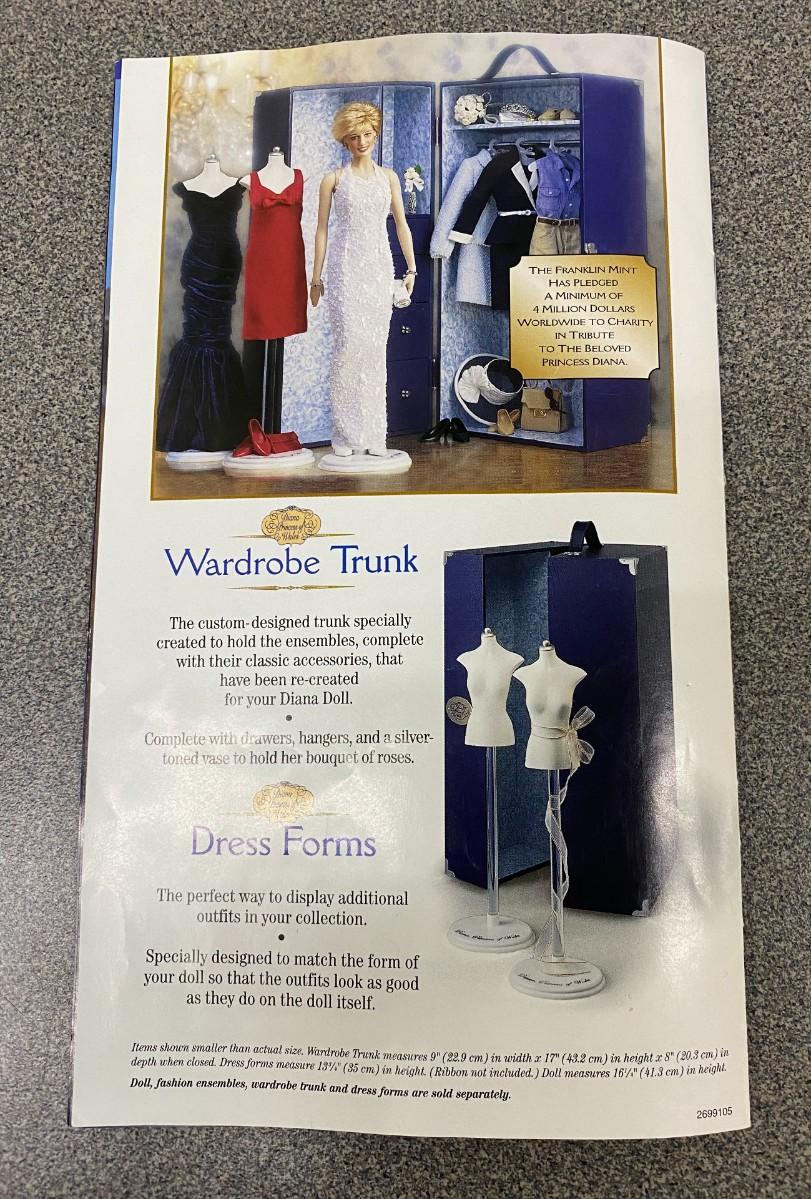 This custom-designed trunk was specially created to hold the ensembles, complete with their classic accessories, that have been recreated for this Diana doll. The Franklin Mint.