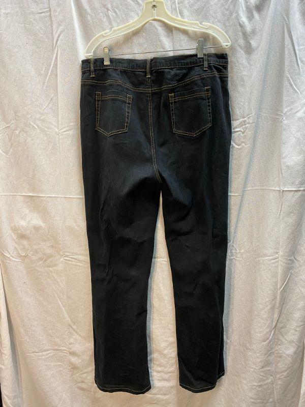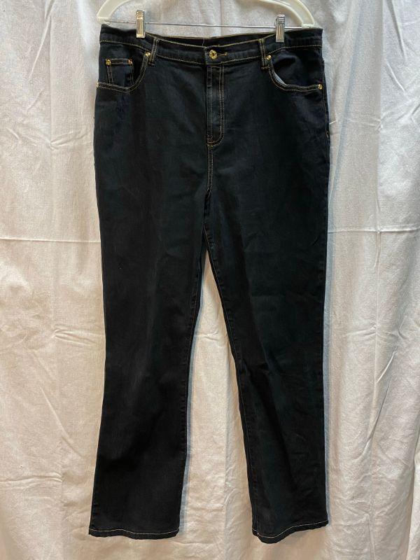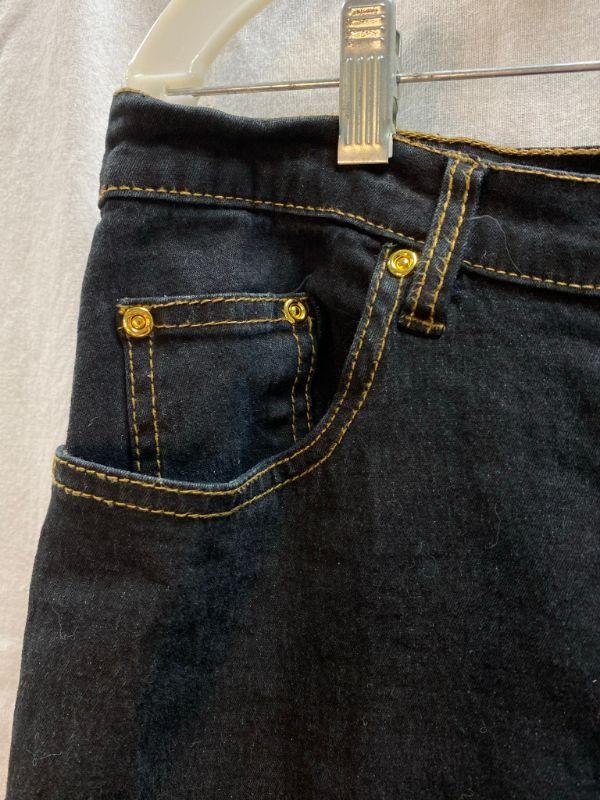Diane Gilman DG2 Jeans. Dark blue rinse with gold stitching. Look to be boot cut possibly. Size 16T. Good condition. Seem to have some stretch for comfort.