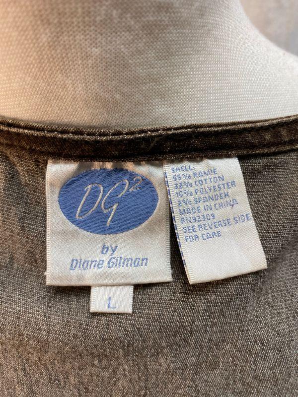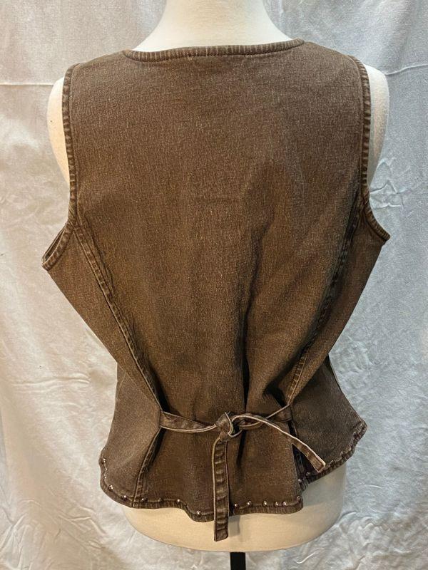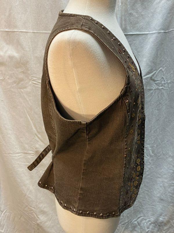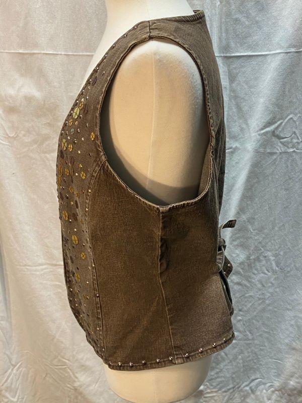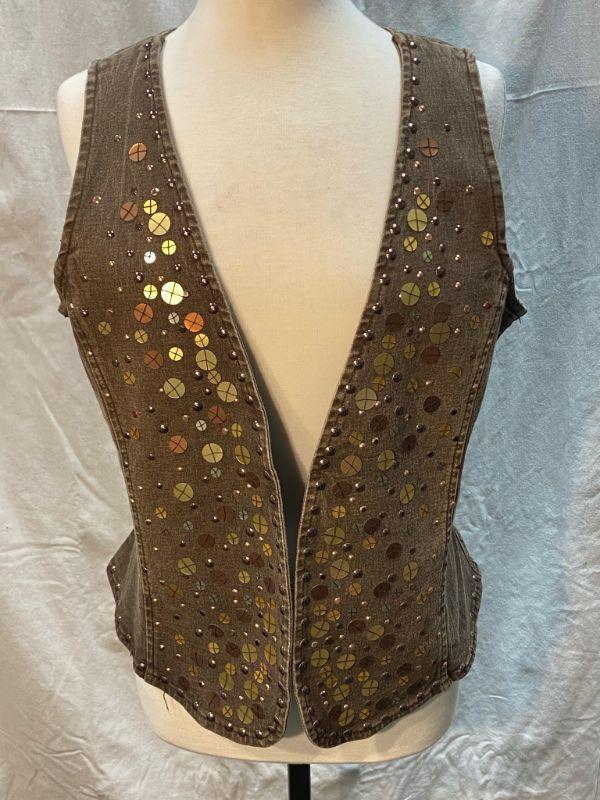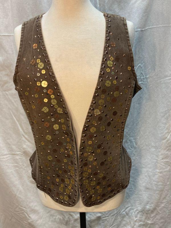 Diane Gilman DG2 denim vest. Sequin embellishments. Denim is a bronze brown color. Hook and eye closure. Size large. Good condition.