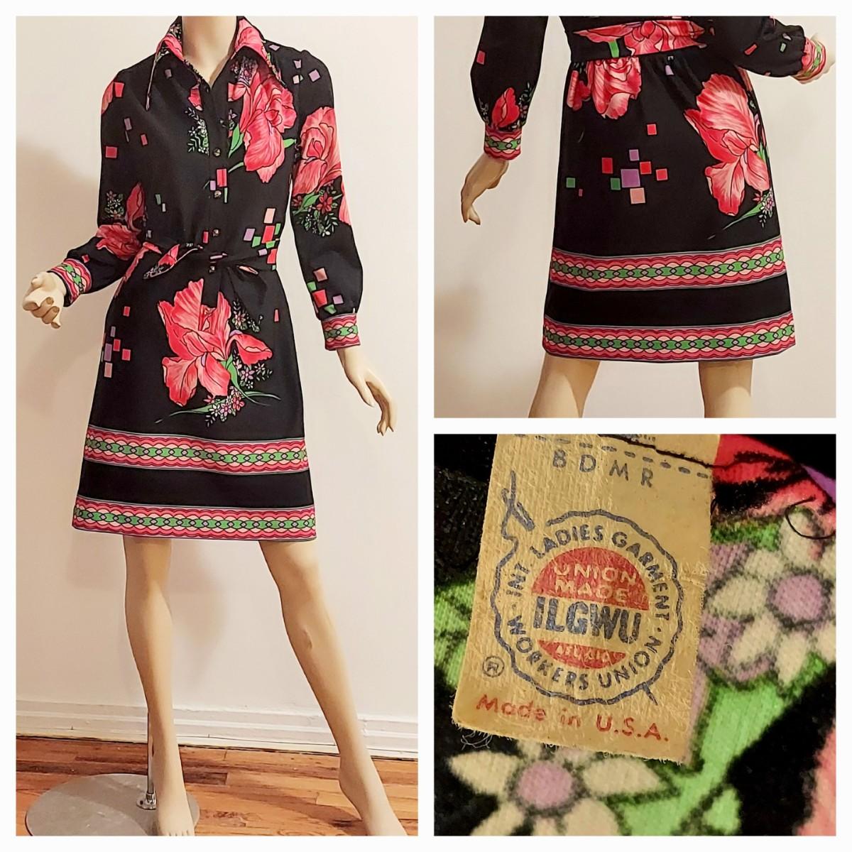 2nd 1970s Flower Power ILGWU dress that is Hand Screened with beauty Floral prints Covered Button.and Sash.