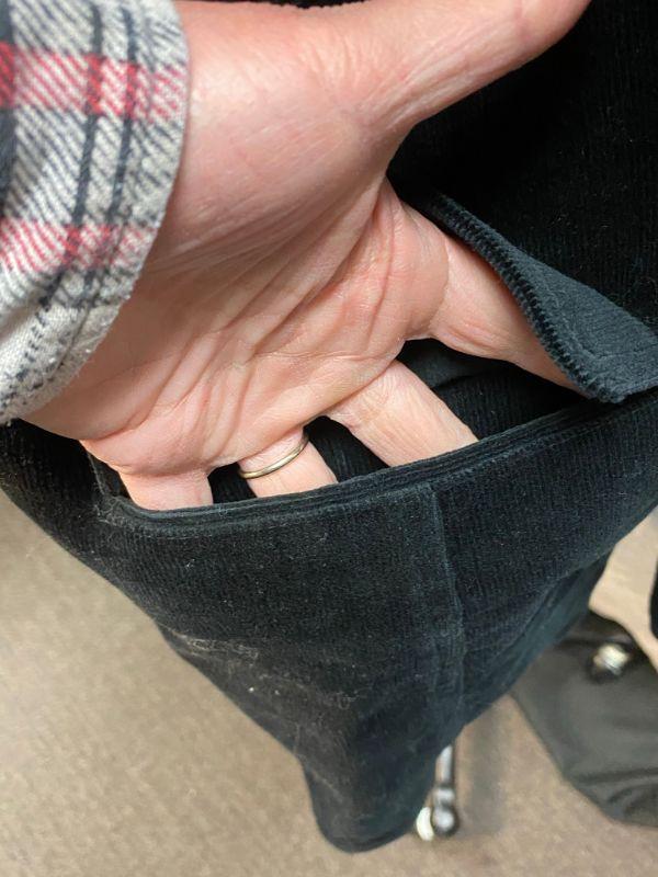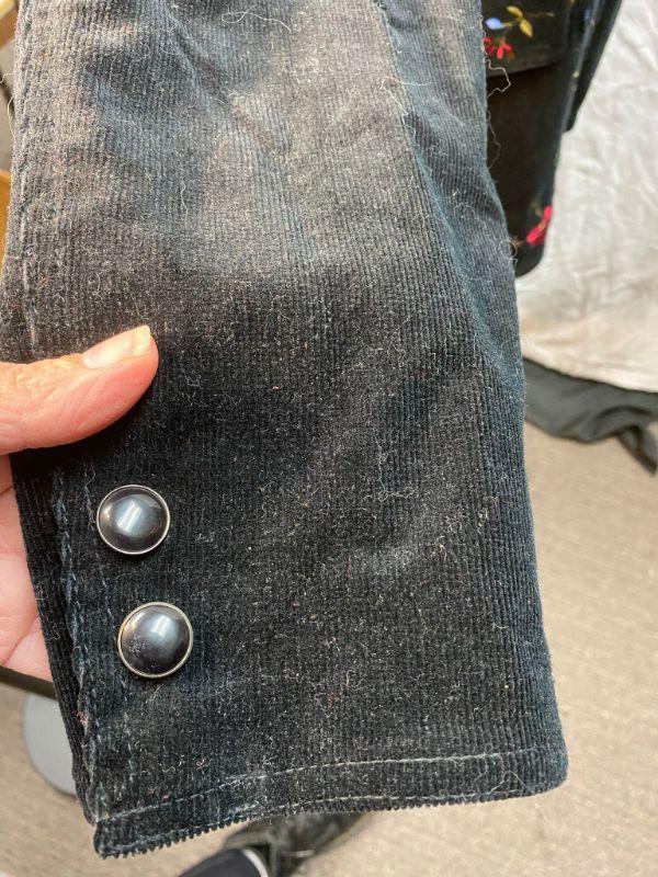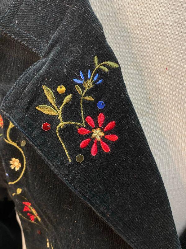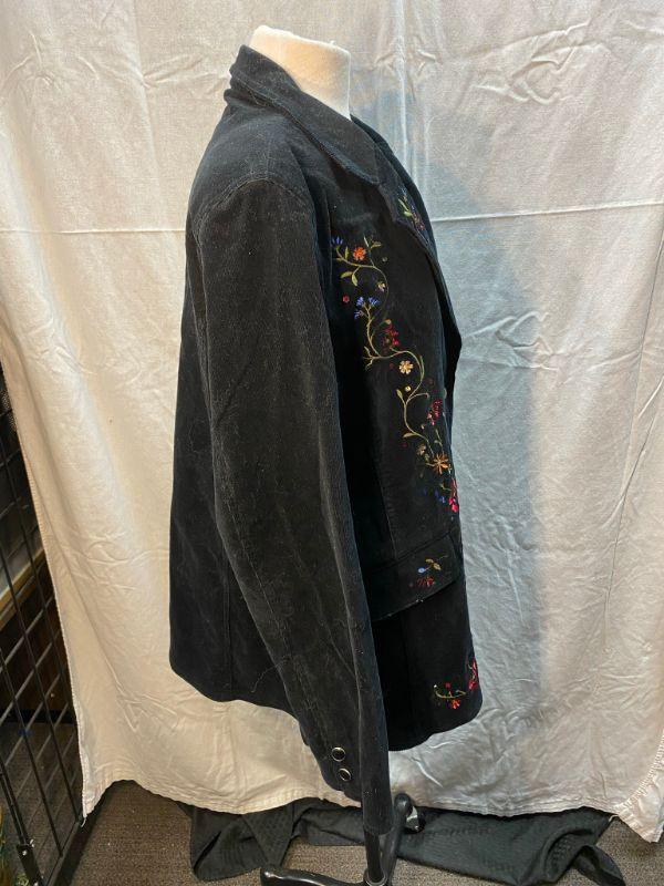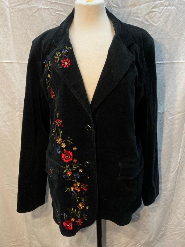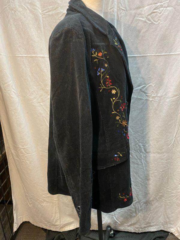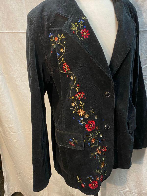 Diane's Essentials black stretch corduroy jacket. Colorful floral embroidered down the right side. Button front with pockets. Size large.
