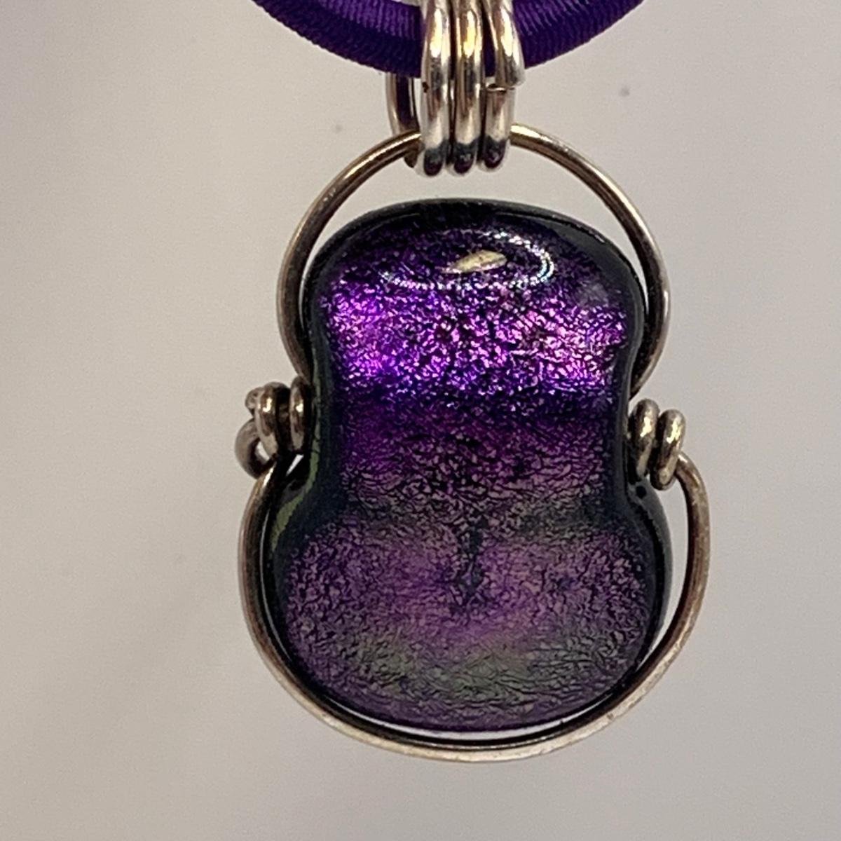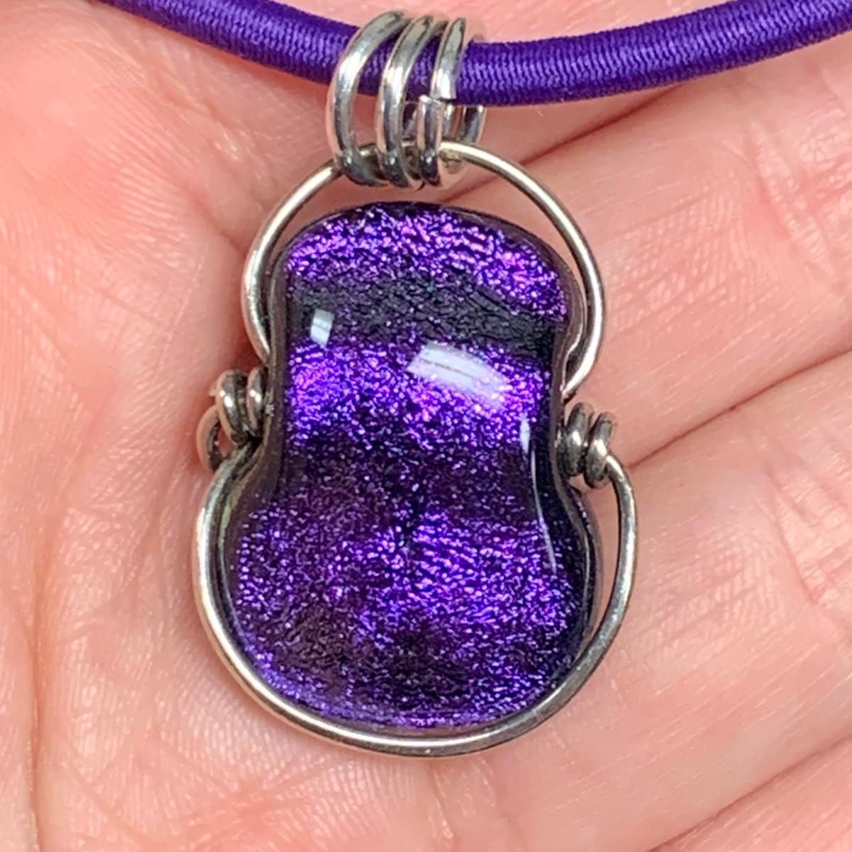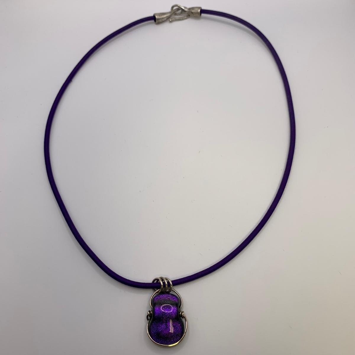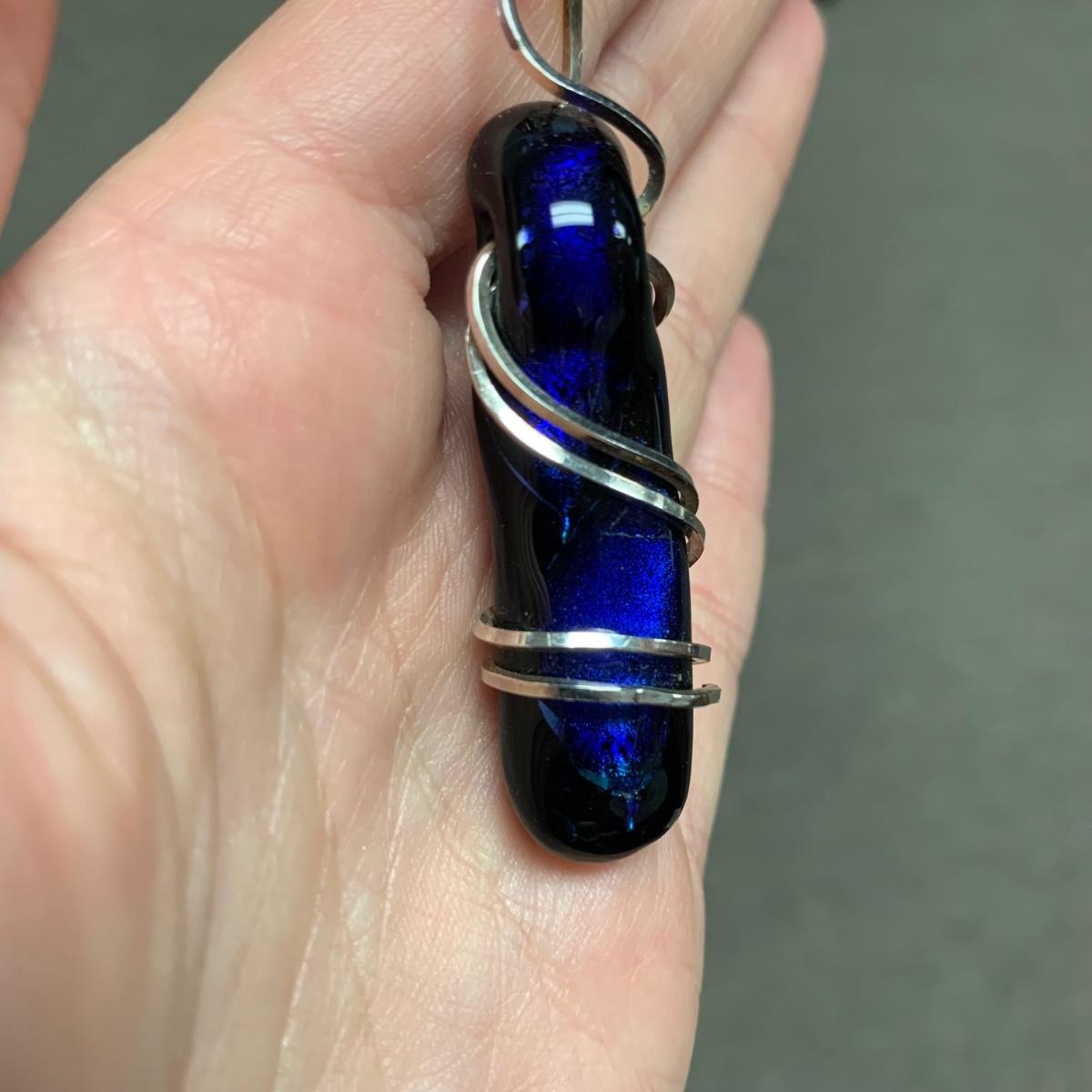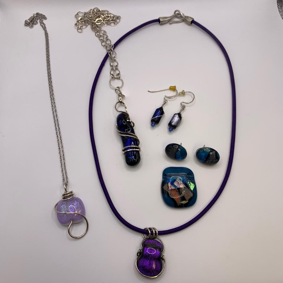 A collection of beautiful sparkling dichroic glass jewelry. Included are three pendants on necklace chains, a pendant with matching stud earrings, and a pair of dangle earrings. The loose blue pendant (from the pendant/earring set) is approximately 1.25” x 1.5”. The necklace with the purple cord is elastic. The chain that the lavender pendant is on is stamped ‘Whiting Davis’ and is 18”.
