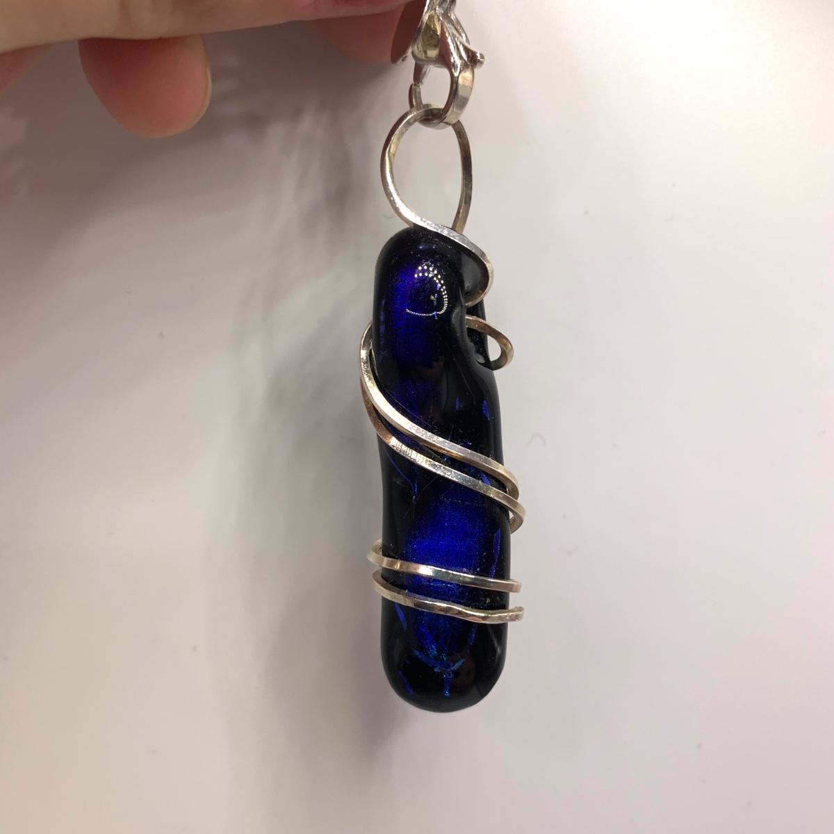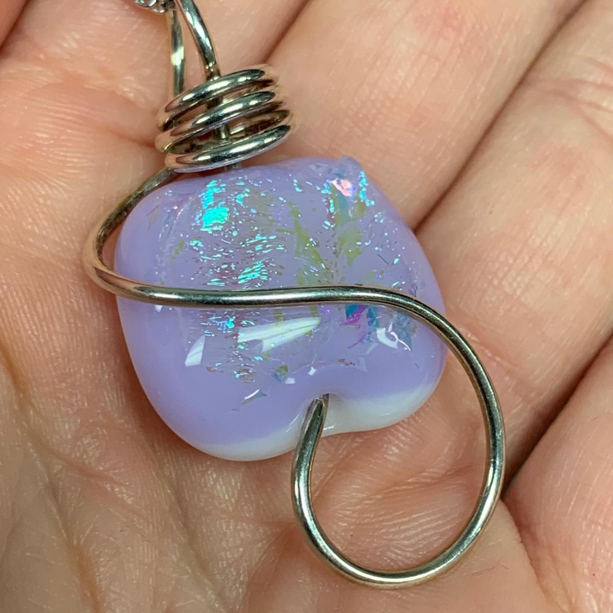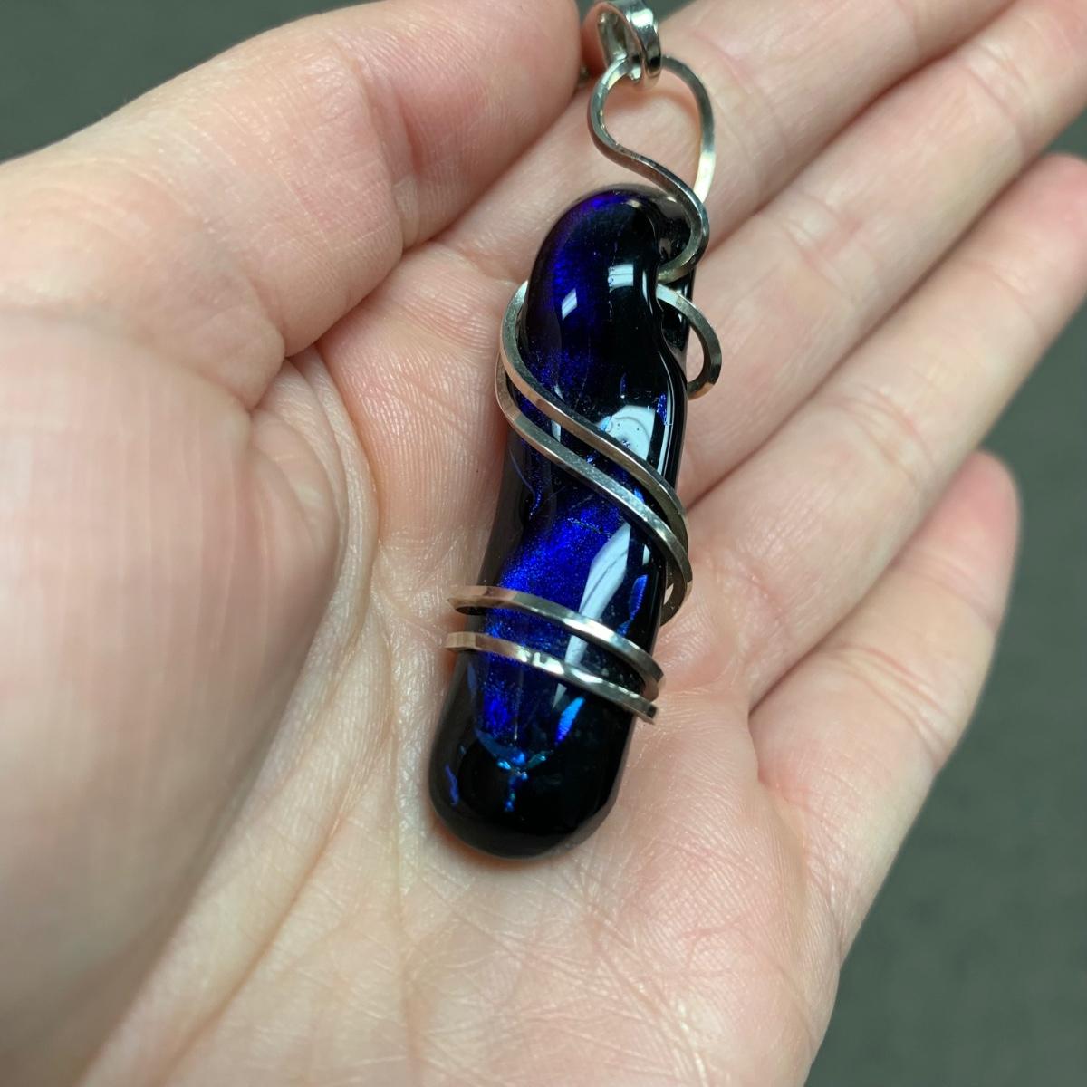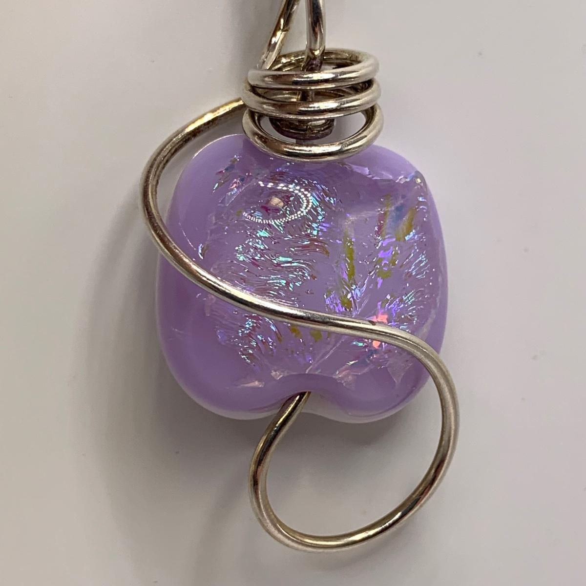 A collection of beautiful sparkling dichroic glass jewelry. Included are three pendants on necklace chains, a pendant with matching stud earrings, and a pair of dangle earrings. The loose blue pendant (from the pendant/earring set) is approximately 1.25” x 1.5”. The necklace with the purple cord is elastic. The chain that the lavender pendant is on is stamped ‘Whiting Davis’ and is 18”.