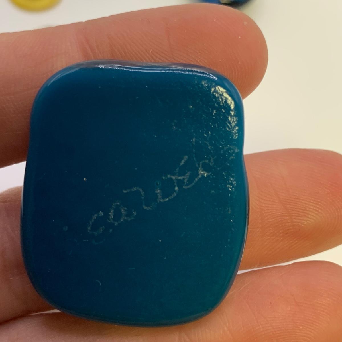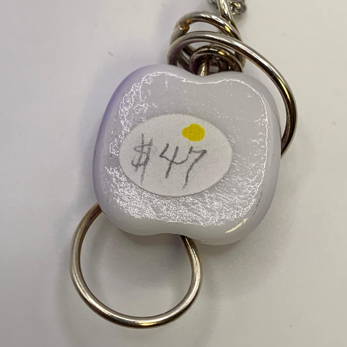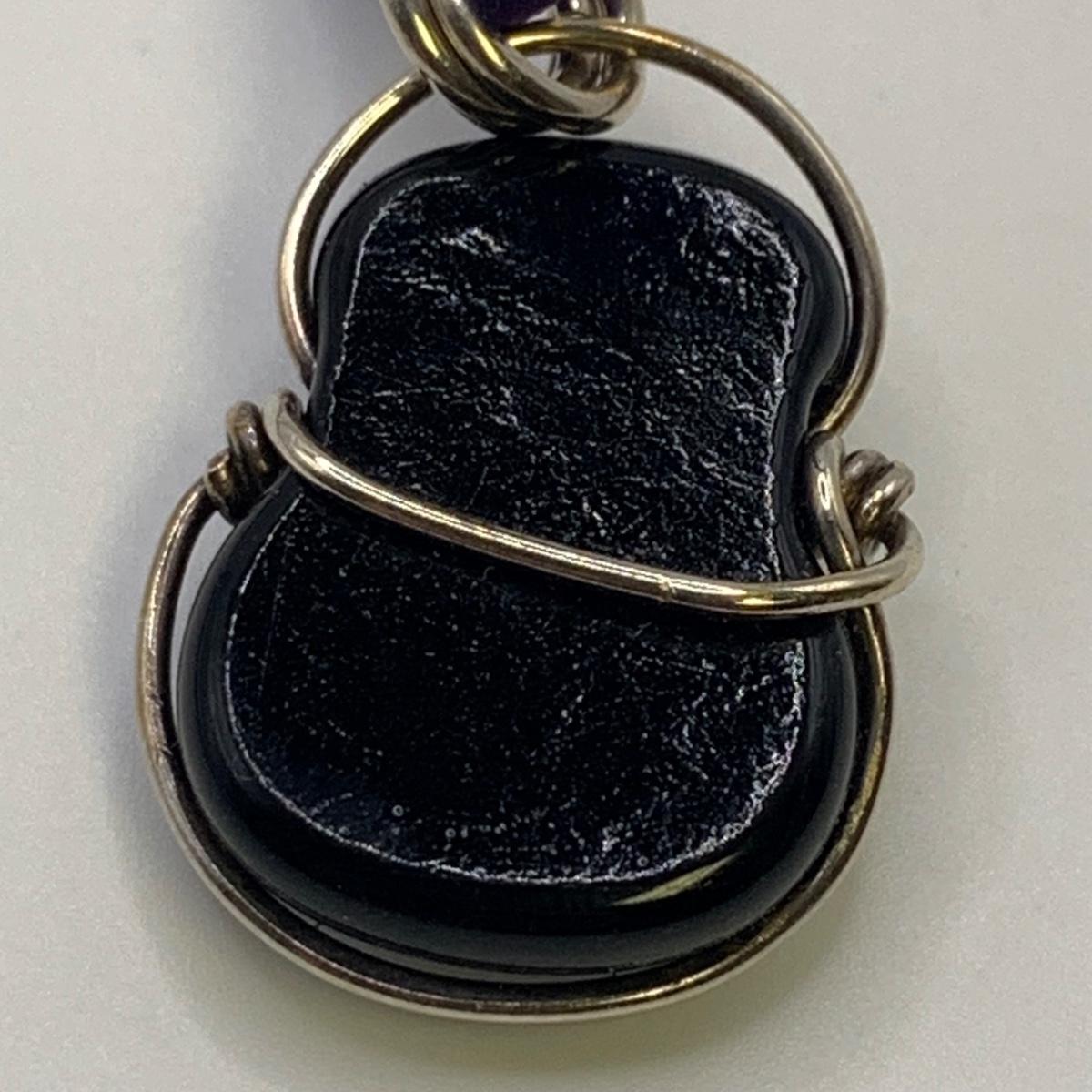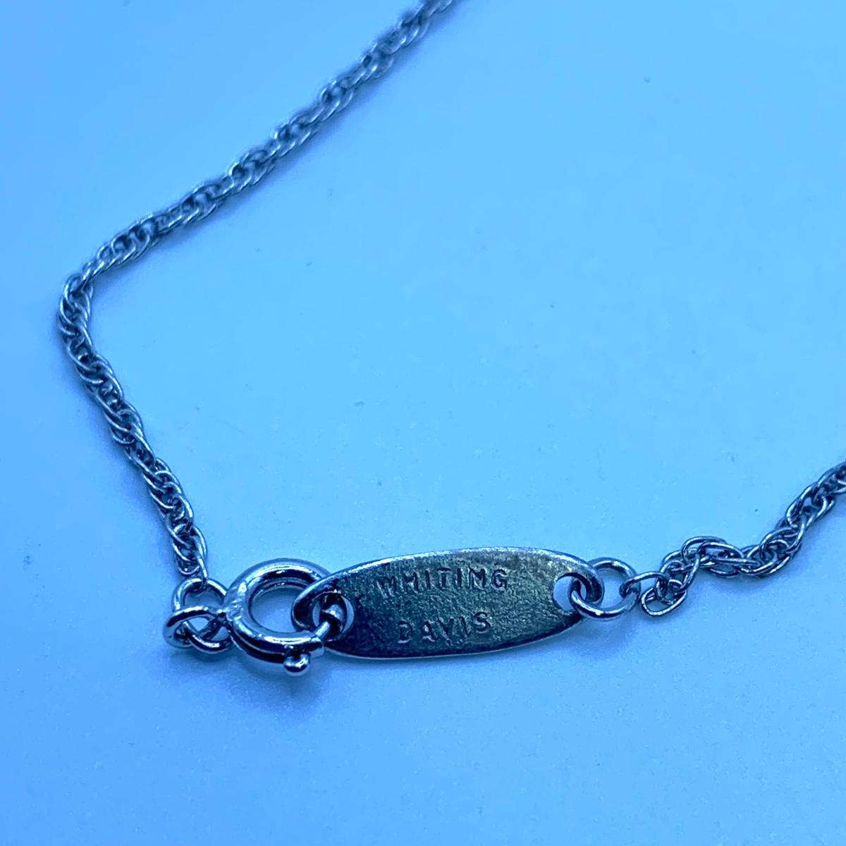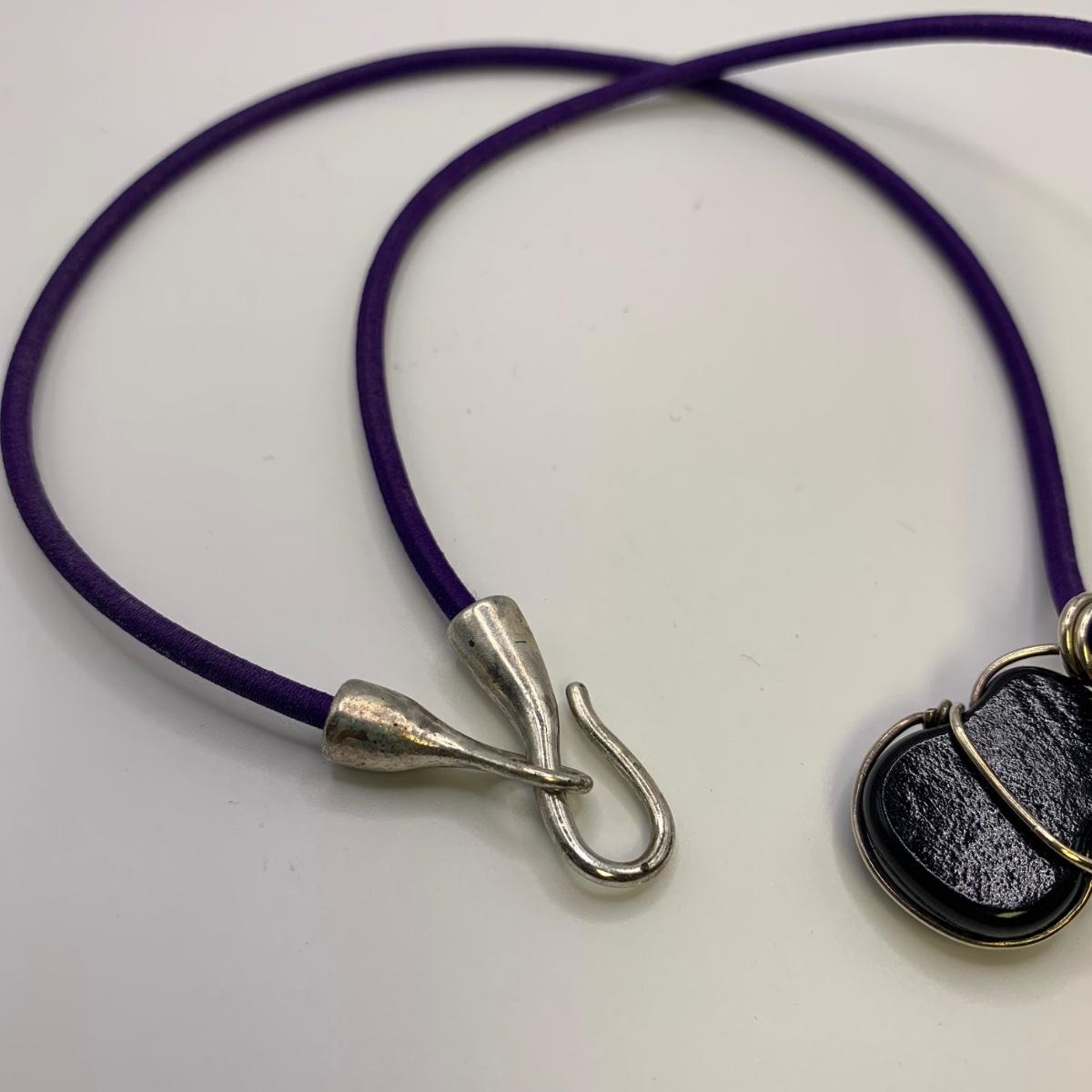 A collection of beautiful sparkling dichroic glass jewelry. Included are three pendants on necklace chains, a pendant with matching stud earrings, and a pair of dangle earrings. The loose blue pendant (from the pendant/earring set) is approximately 1.25” x 1.5”. The necklace with the purple cord is elastic. The chain that the lavender pendant is on is stamped ‘Whiting Davis’ and is 18”.