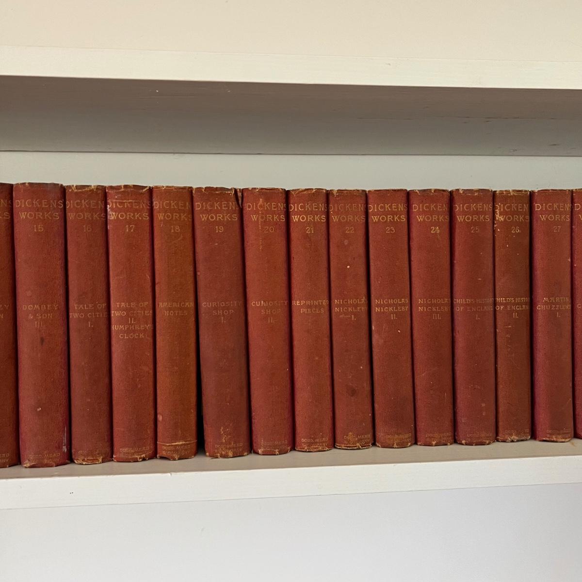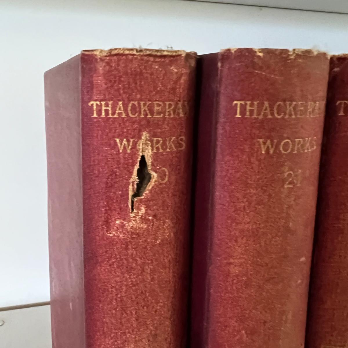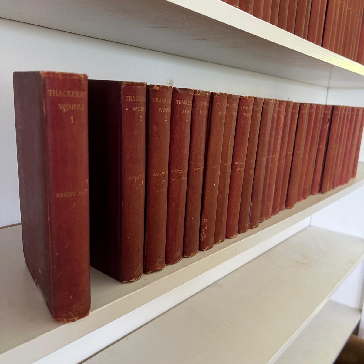 The Dickens Works are a 48 volume set, all books printed in 1891. The Thackeray’s Works are a 30 volume set (no dates found on this set) and please note that one book has a small tear in the cover of the spine.