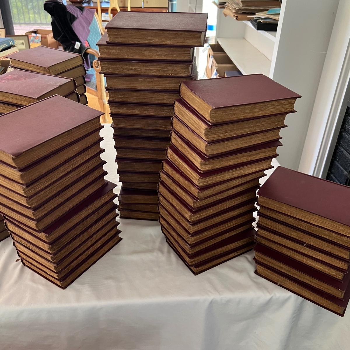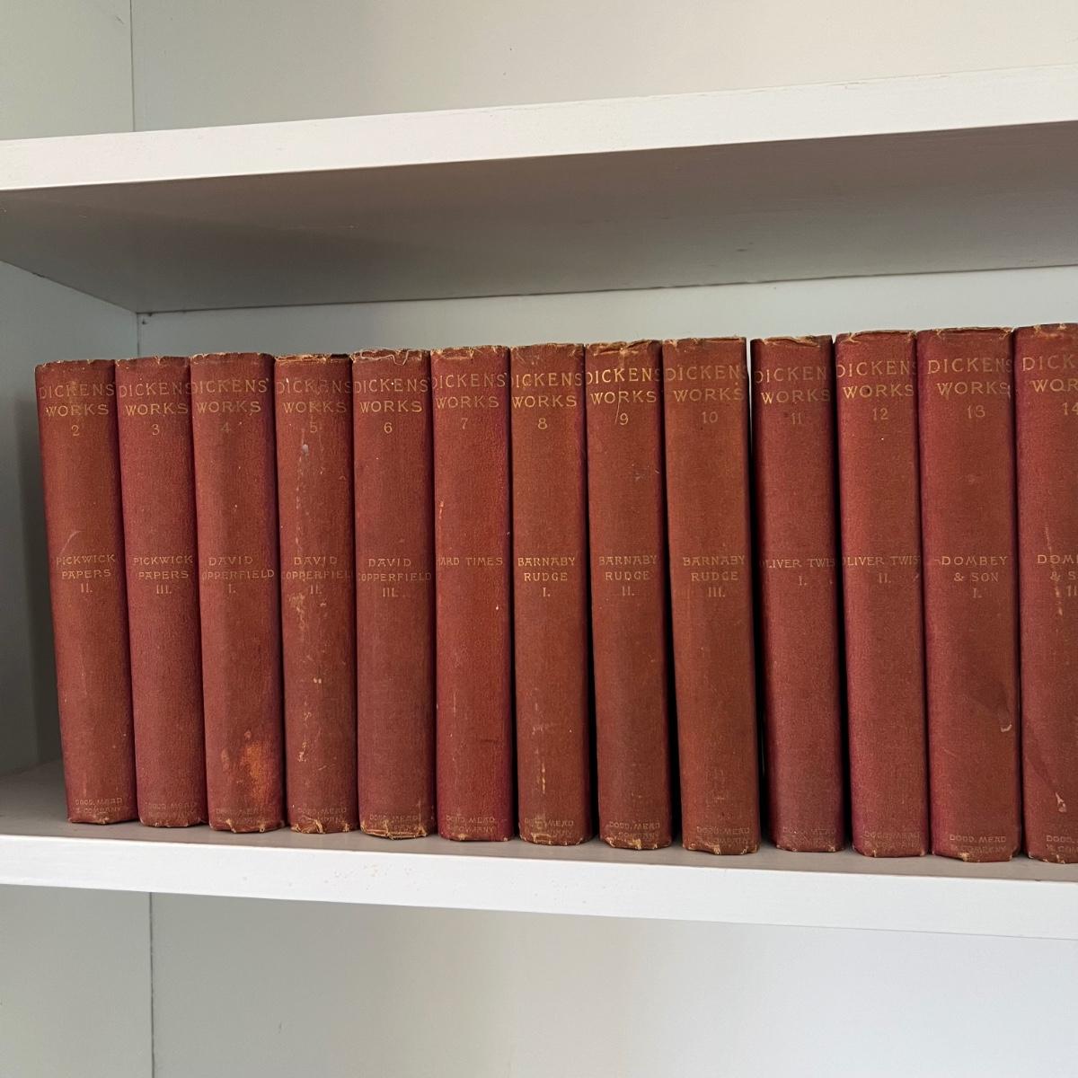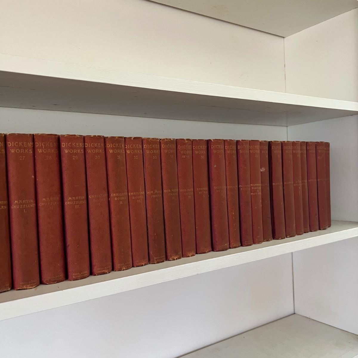 The Dickens Works are a 48 volume set, all books printed in 1891. The Thackeray’s Works are a 30 volume set (no dates found on this set) and please note that one book has a small tear in the cover of the spine.