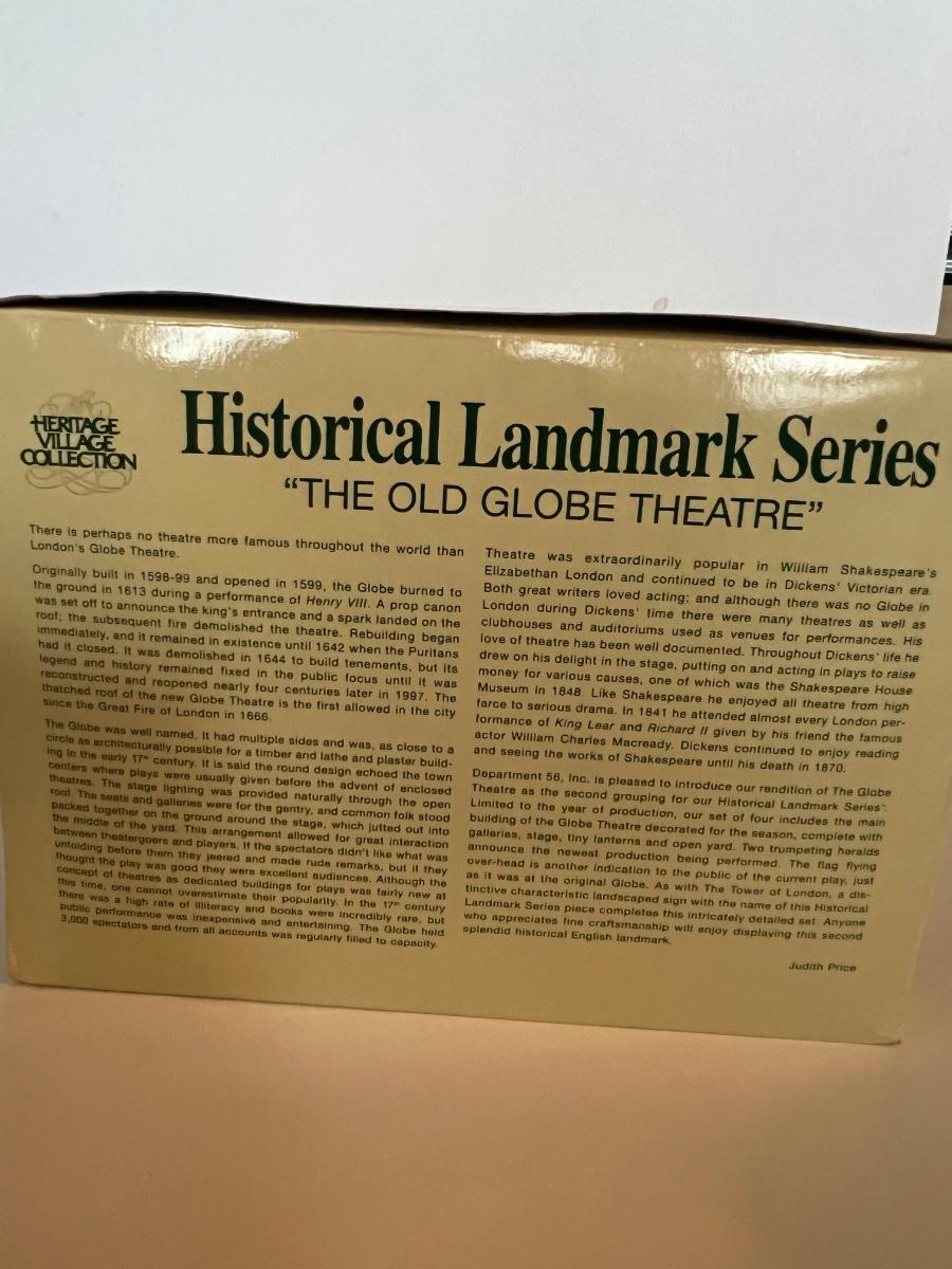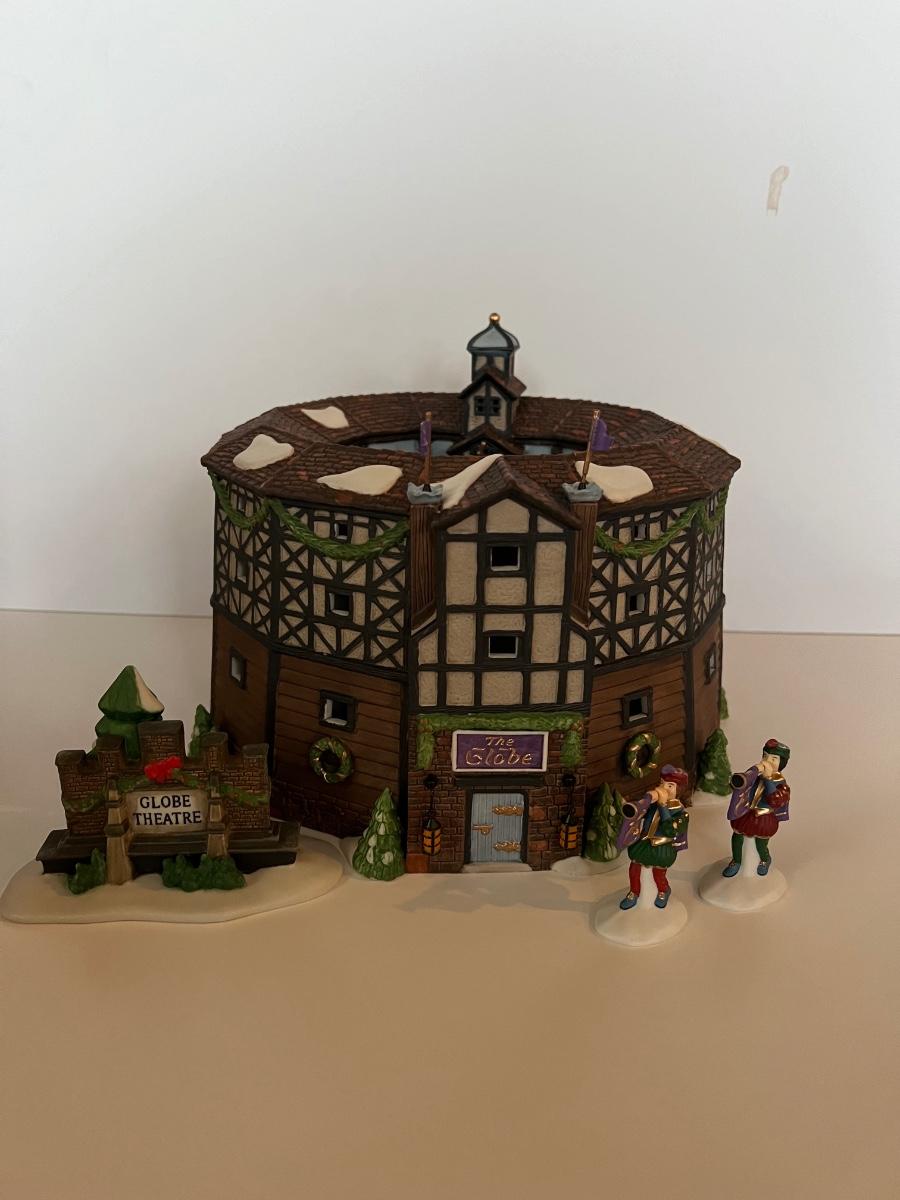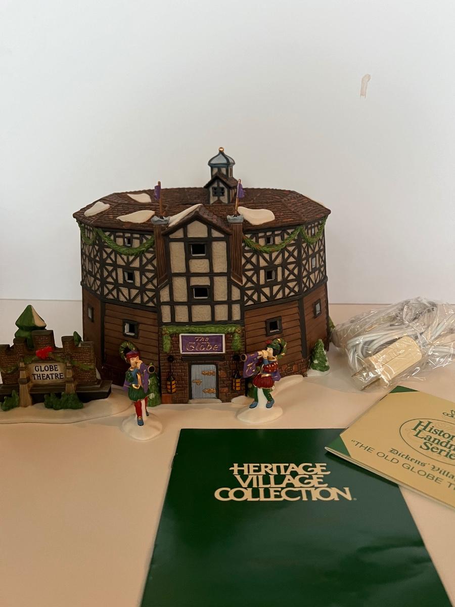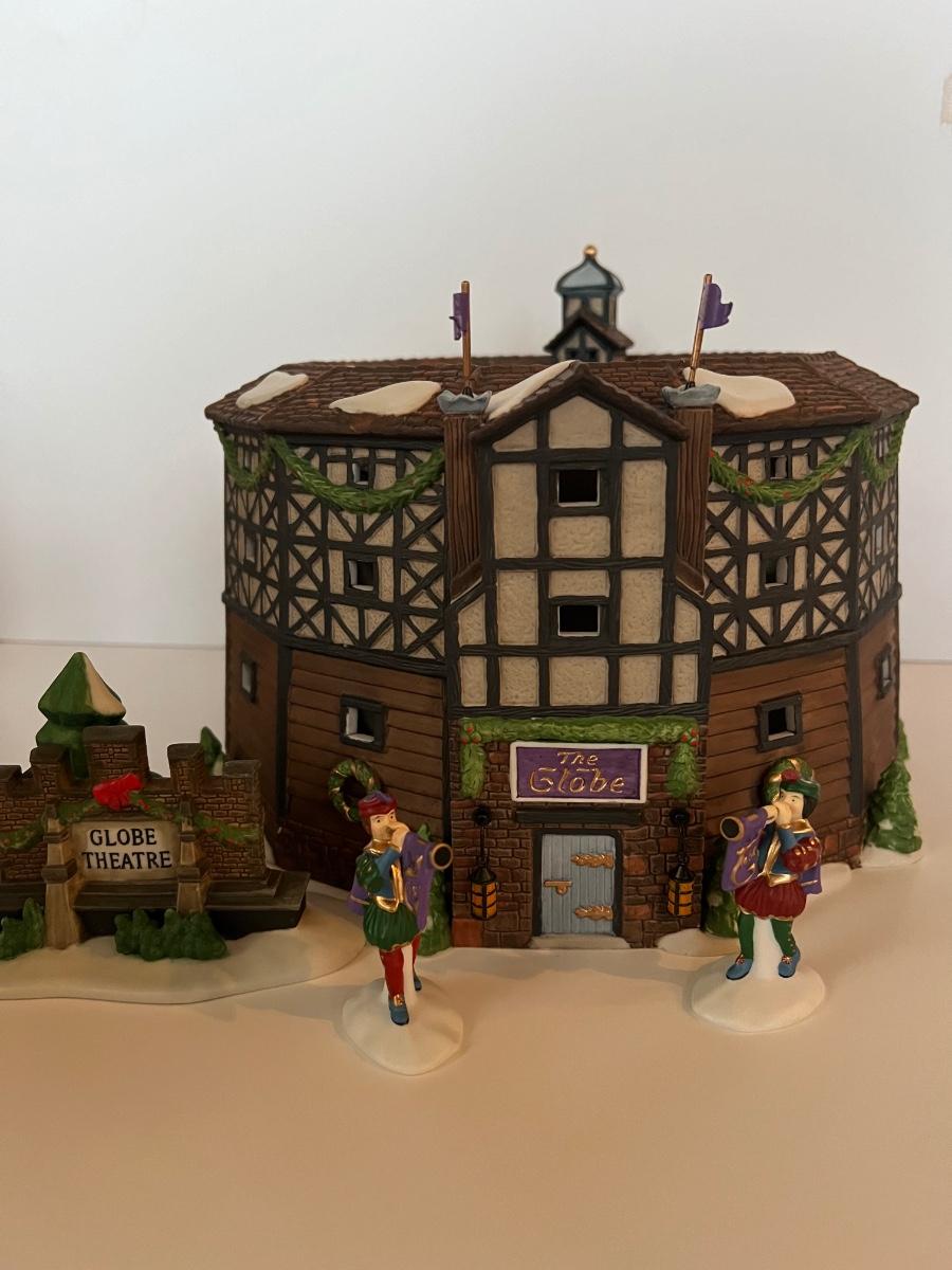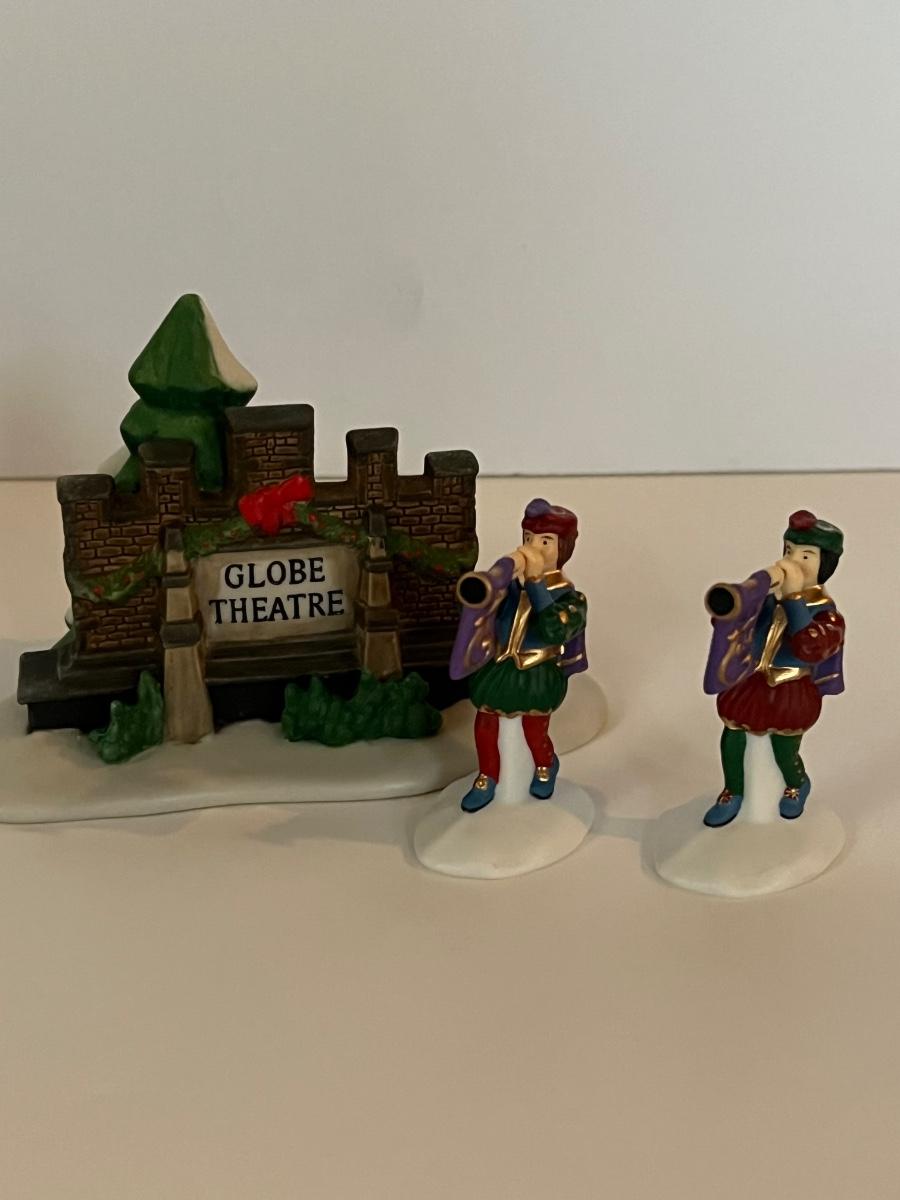 Historical Landmark Series with Old Globe Theatre sign and two heralders. Dickens Village, Department 56. New in box. 8” height x 9” doameter