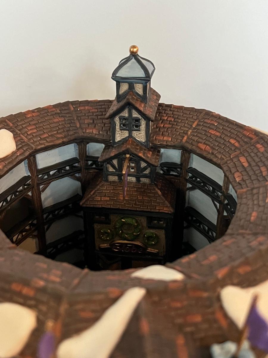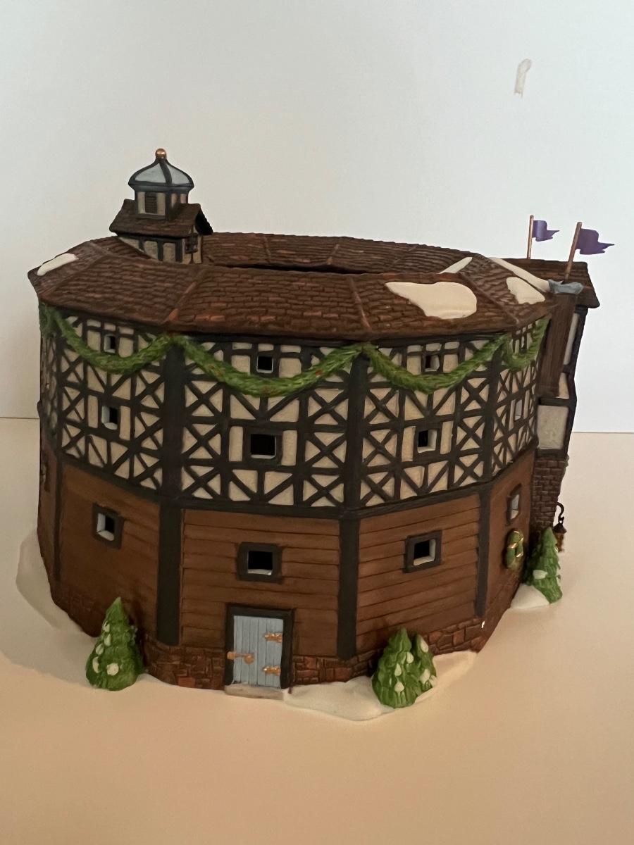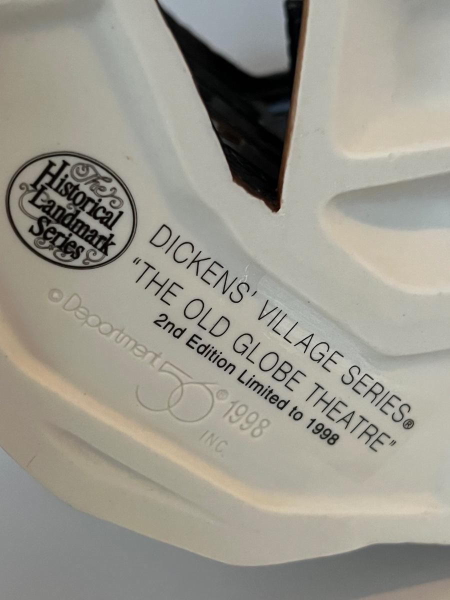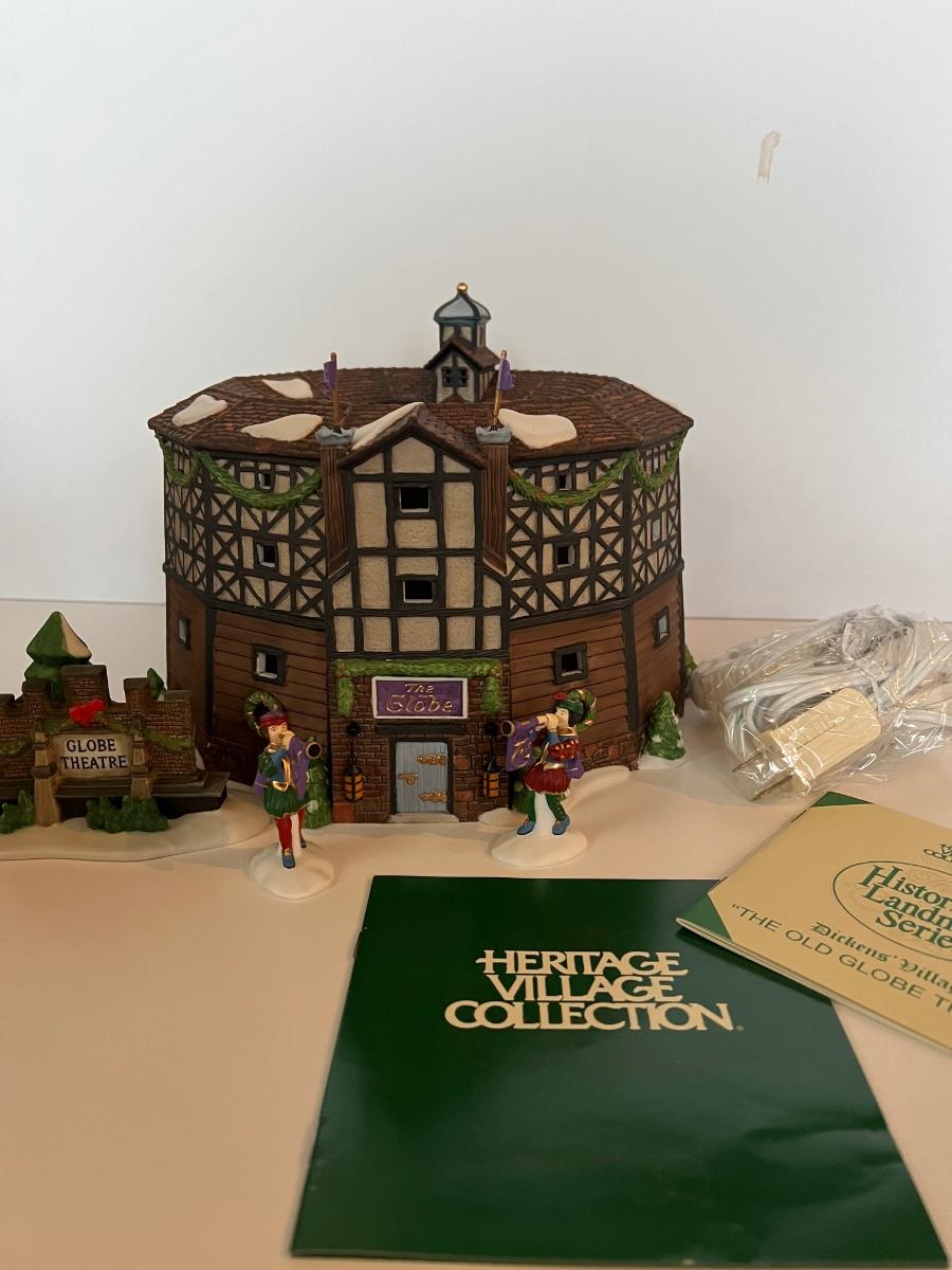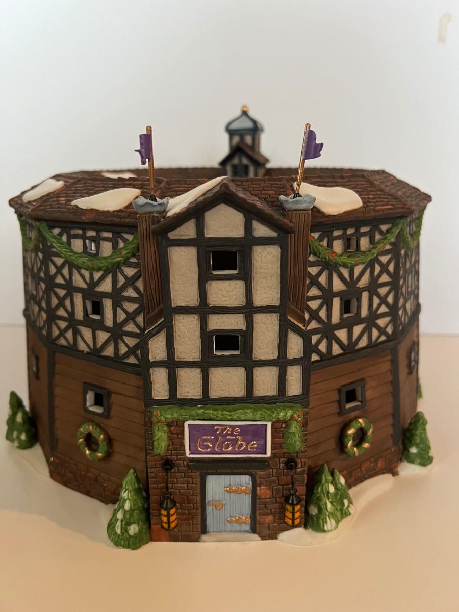 Historical Landmark Series with Old Globe Theatre sign and two heralders. Dickens Village, Department 56. New in box. 8” height x 9” doameter