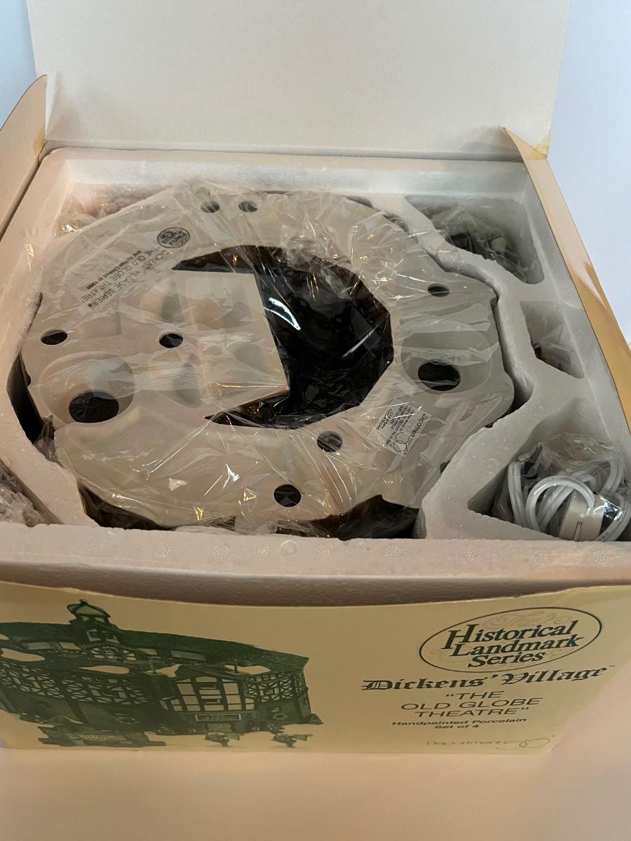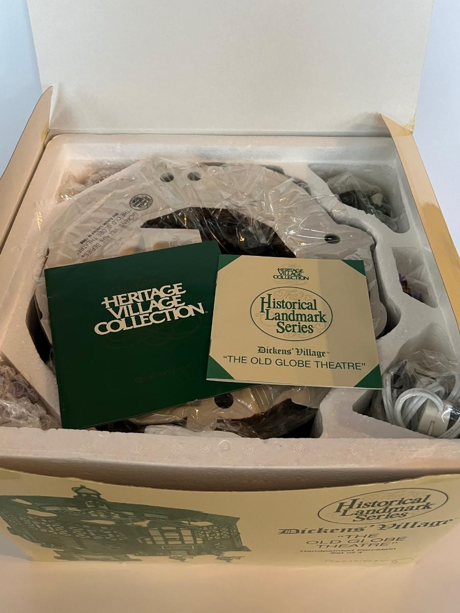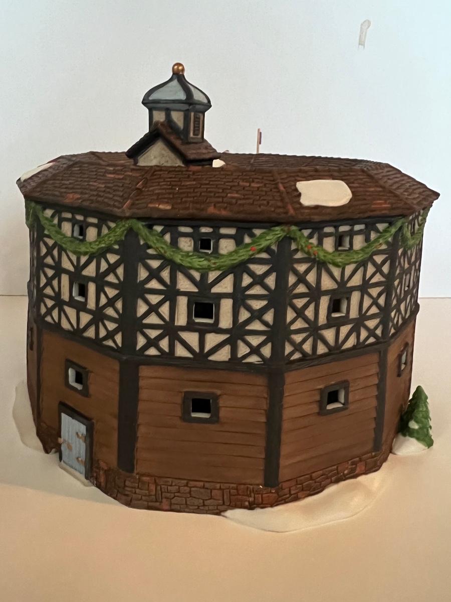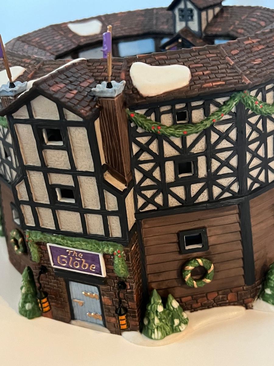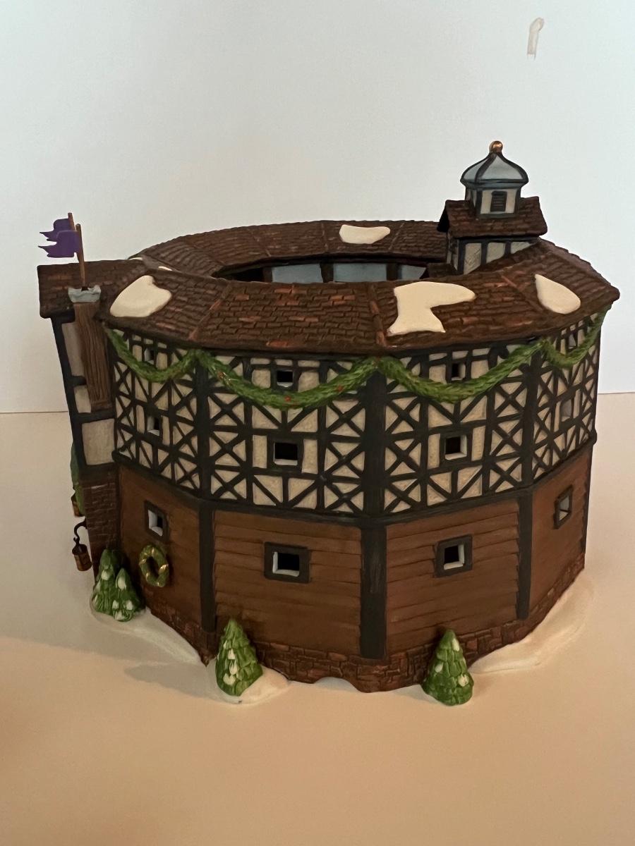 Historical Landmark Series with Old Globe Theatre sign and two heralders. Dickens Village, Department 56. New in box. 8” height x 9” doameter