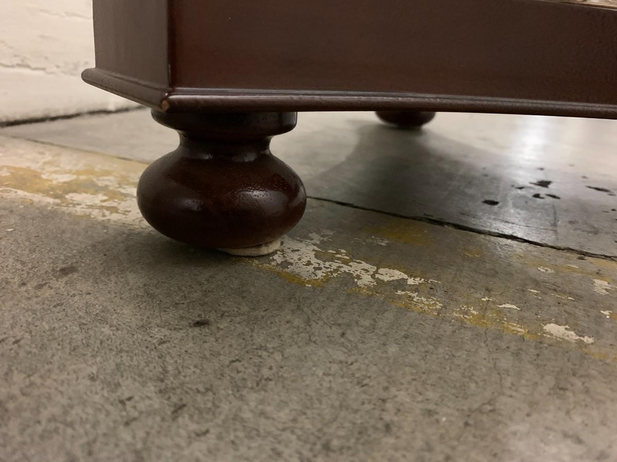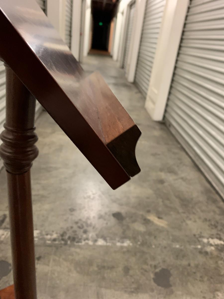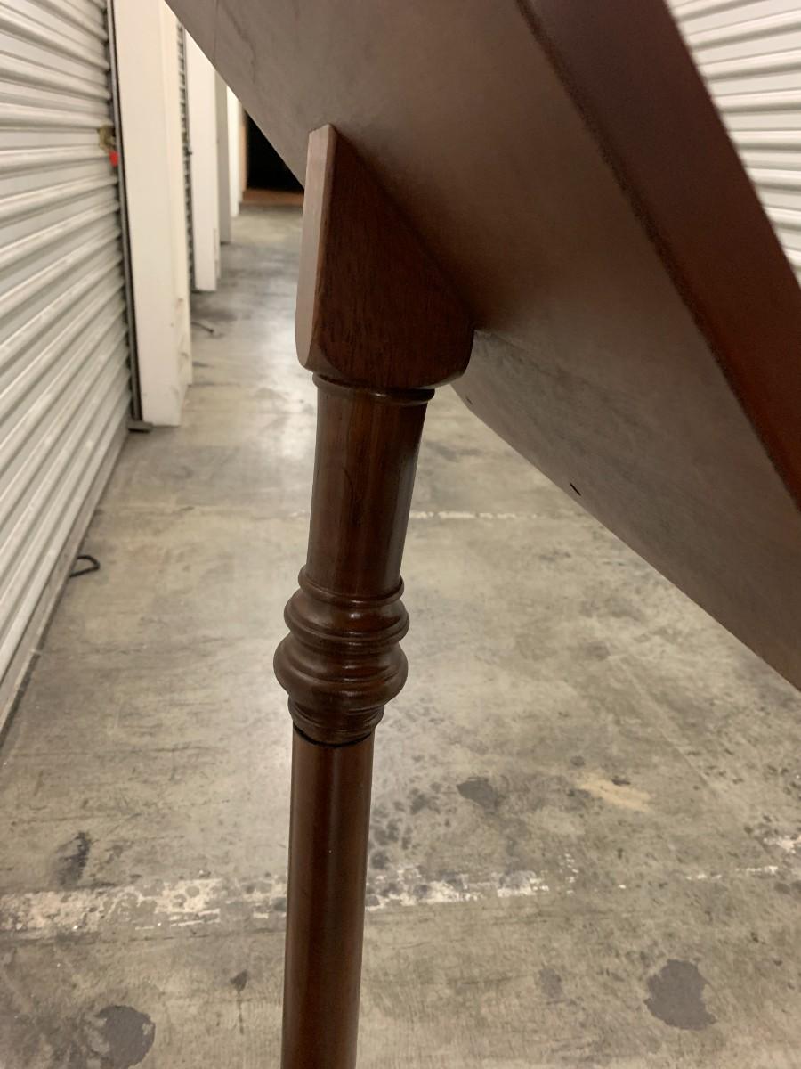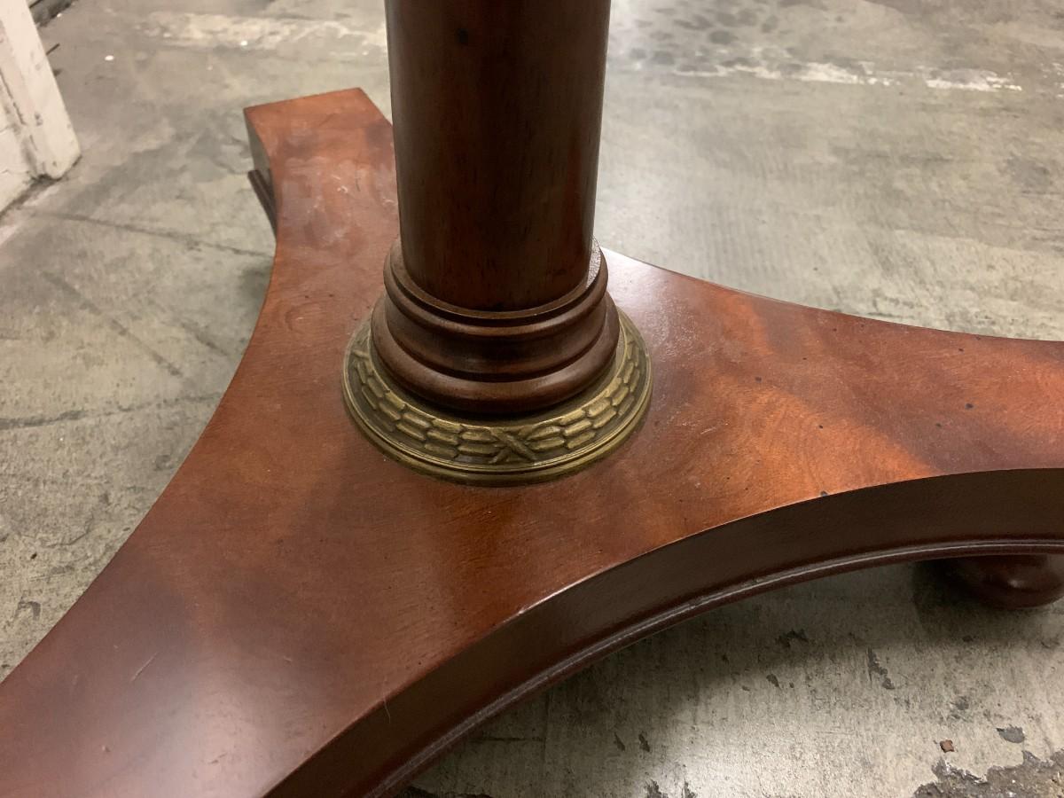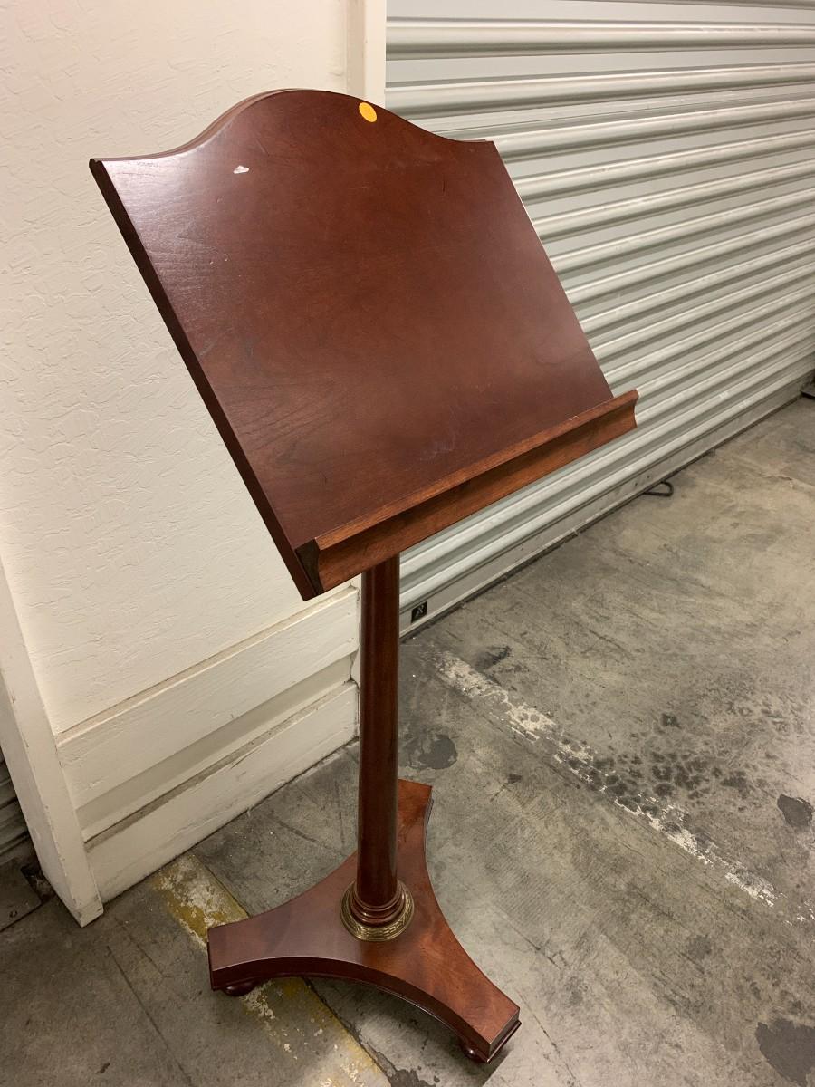 Elegant wood stand with grain finish. 48"h. Metal detail at base.