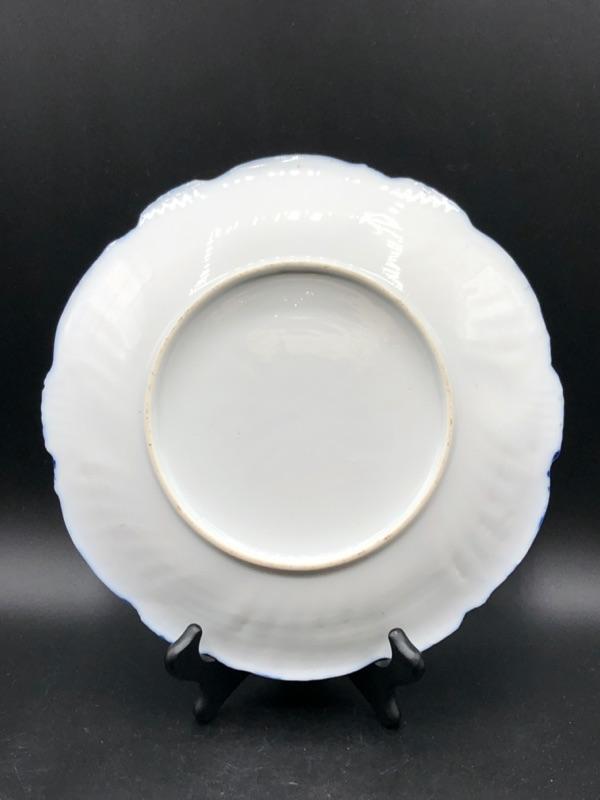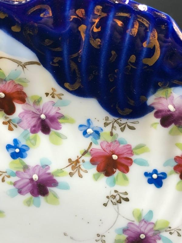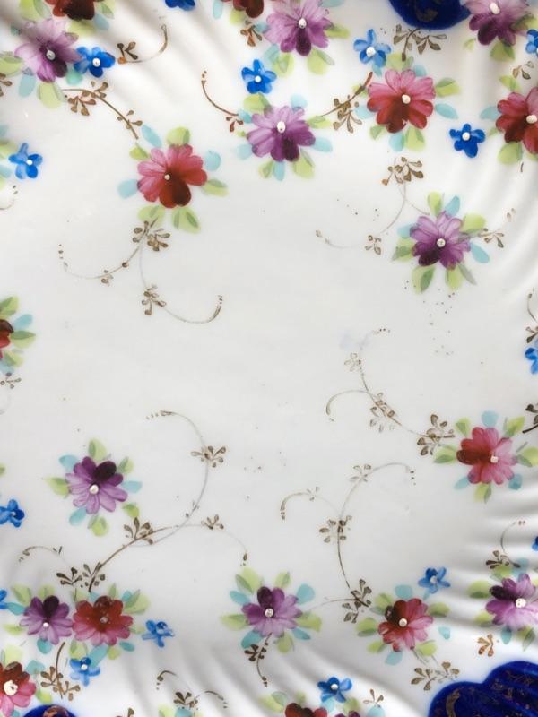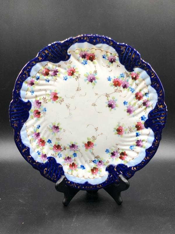 Vintage floral plate. Scalloped edge plate. Colorful flower print with cobalt blue and gold edge. Good Condition.