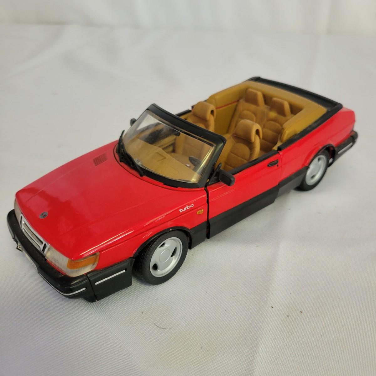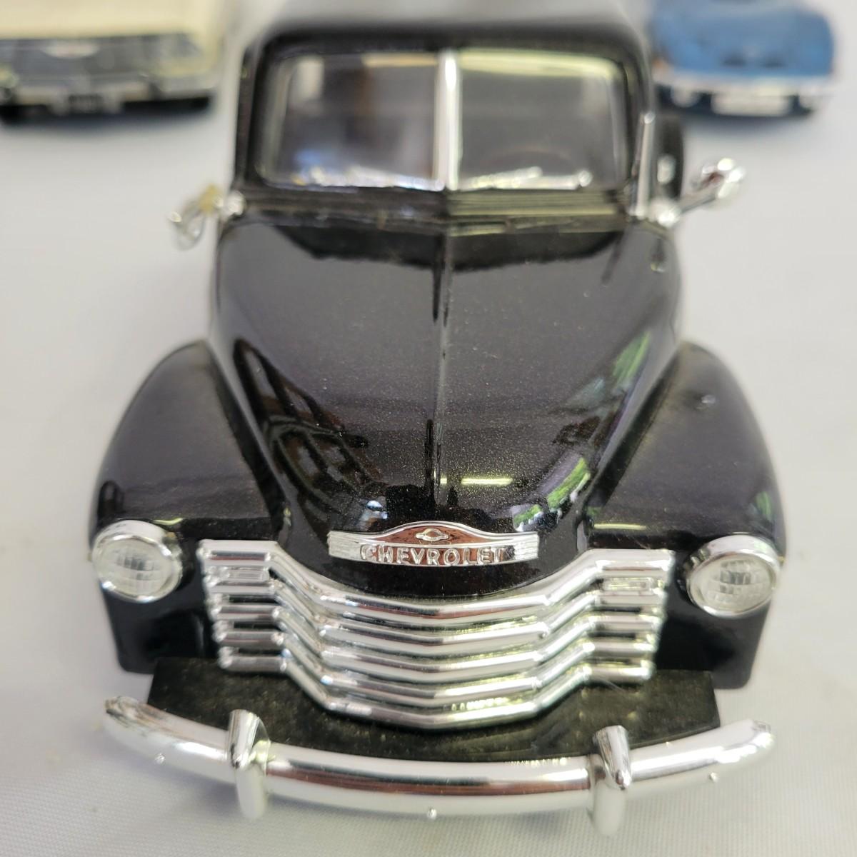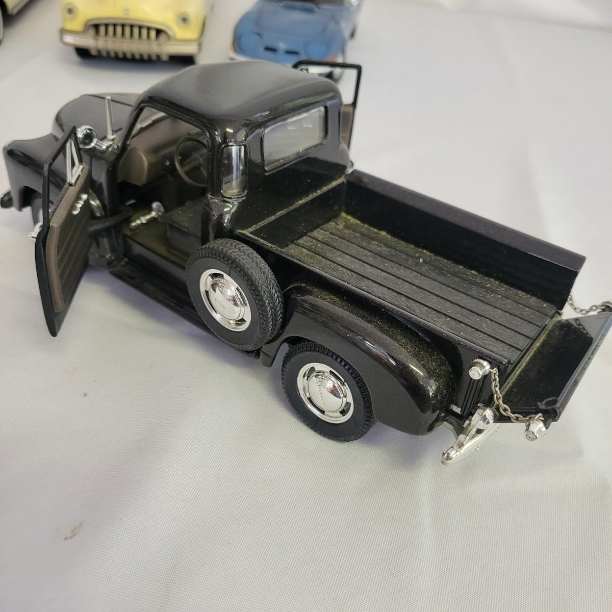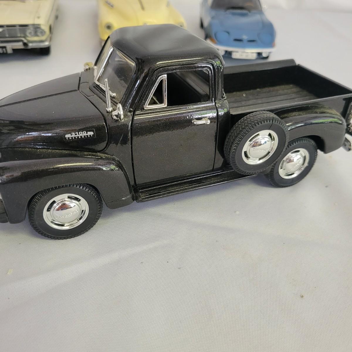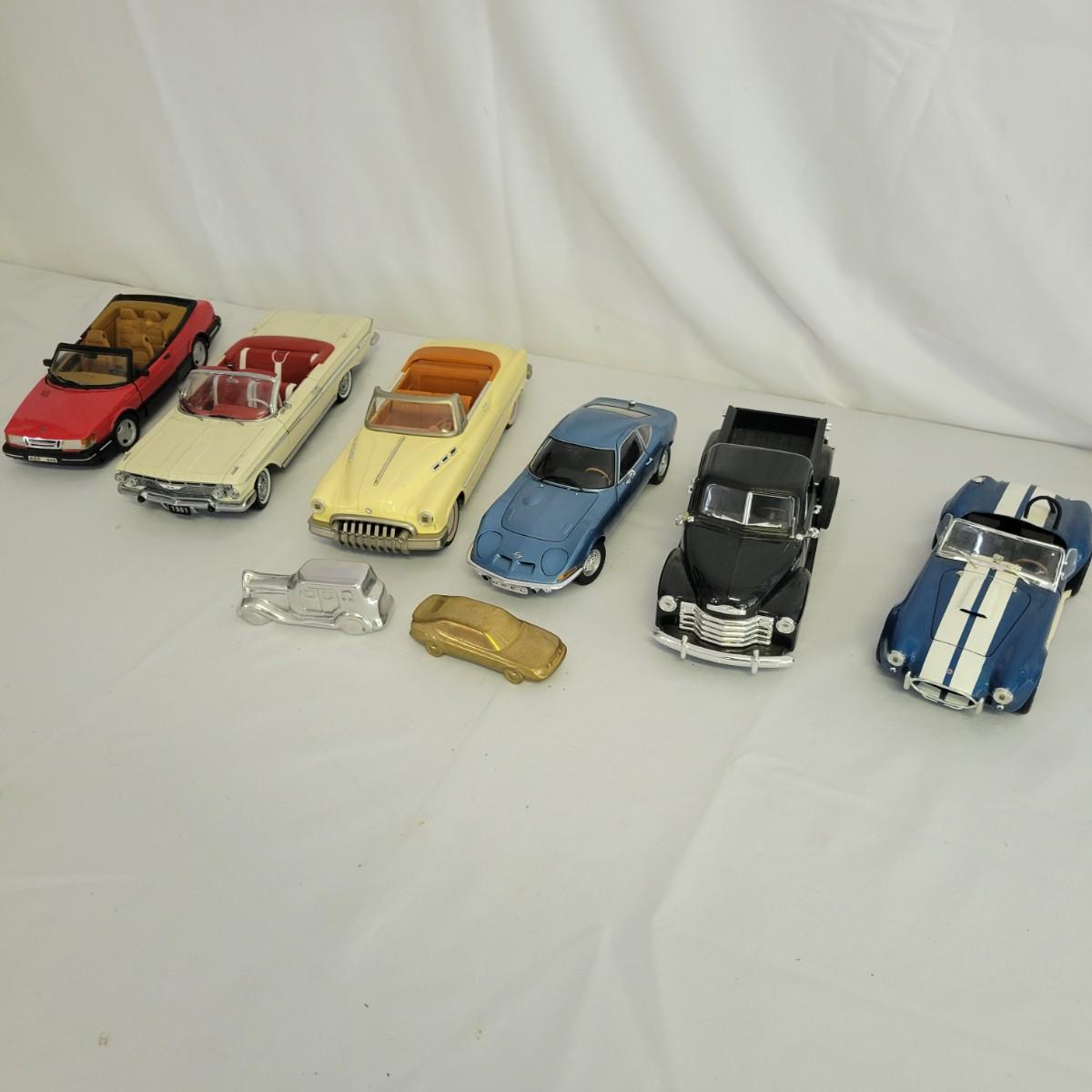 An assortment of six die cast cars and two metal molded cars. It appears most of the cars are 1/18 scale replicas of Chevrolets, Oldsmobile and Saab. The black Chevy truck has a broken side mirror and the beige convertible has a broken steering wheel. Most of the replicas have doors, hoods and trunks that open to show detail. This lot also includes two metal molded cars. One is solid brass and the other appears to aluminum. The largest beige convertible measures approximately 11" x 4.5" x 3.5"H. Shipping available. Shipping can be costly. We suggest contacting our preferred local shipping provider, Postage Express, with dimensions and getting an estimate before bidding: (828) 670-5501 or postageexpress@yahoo.com.