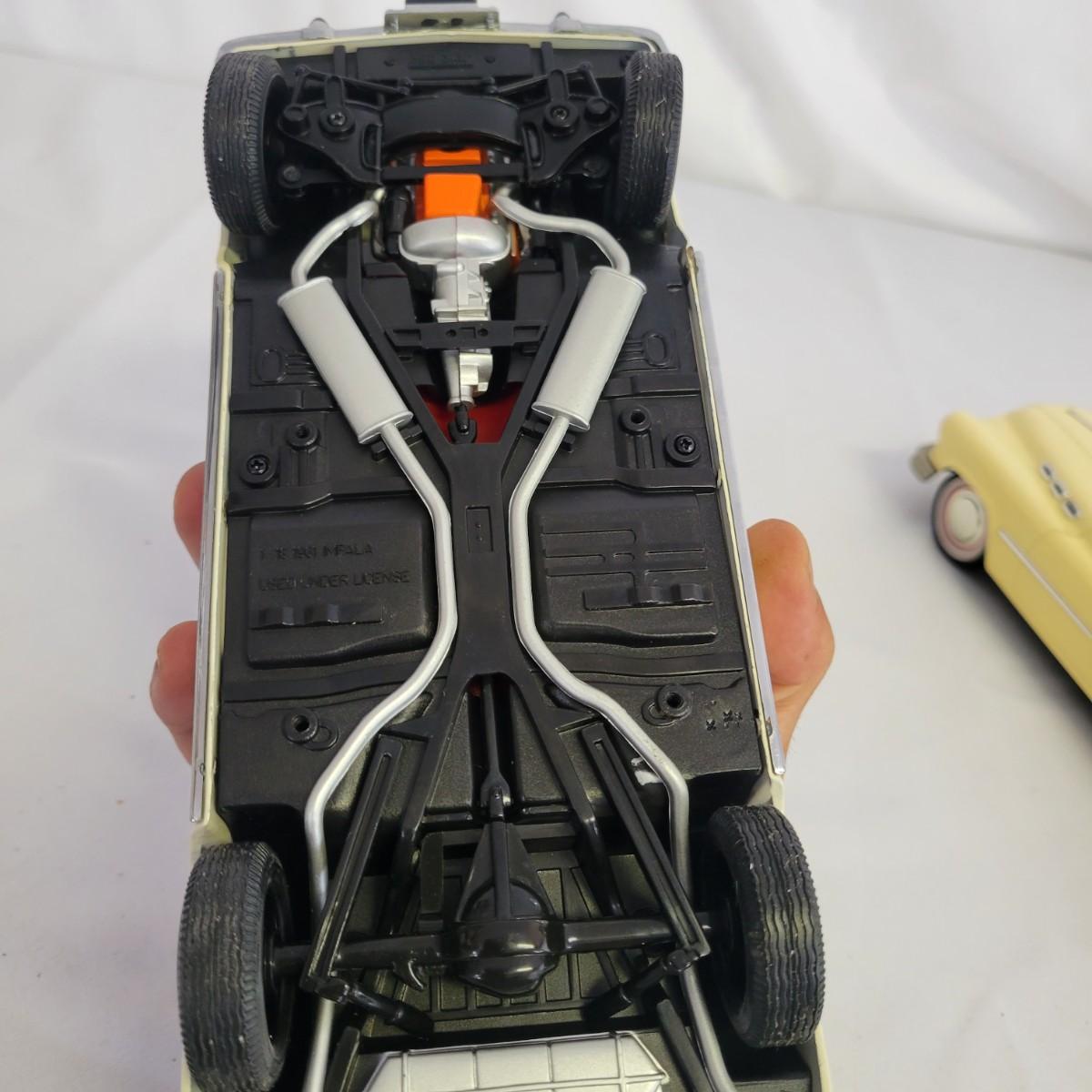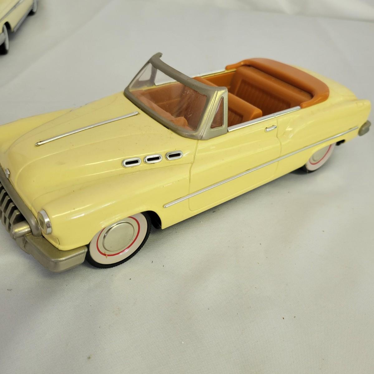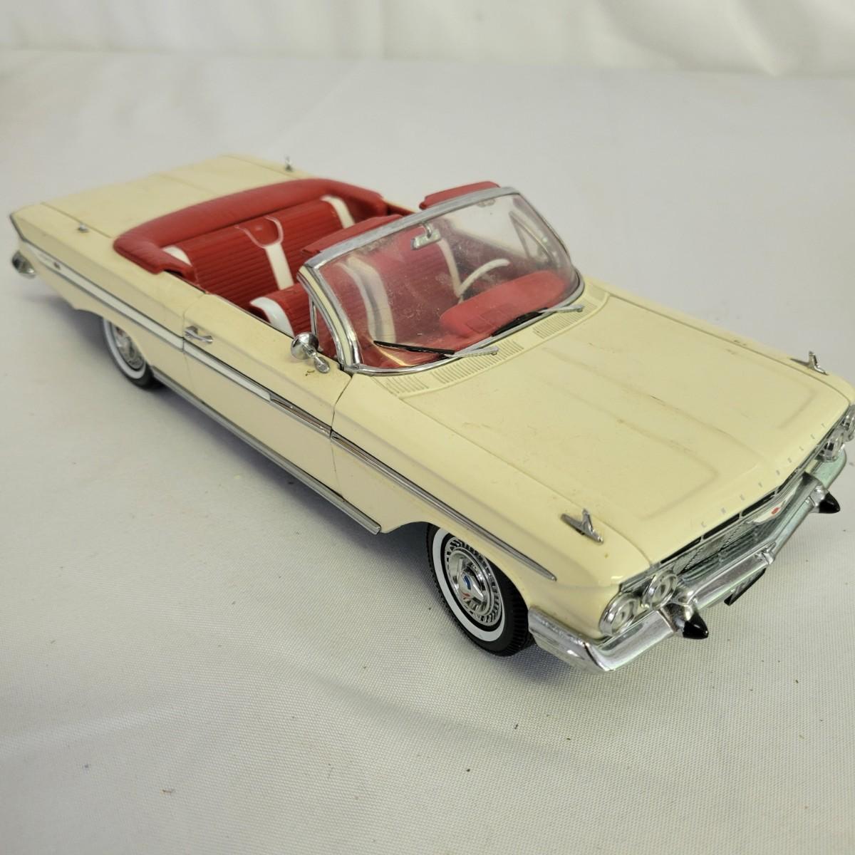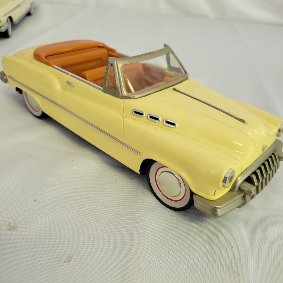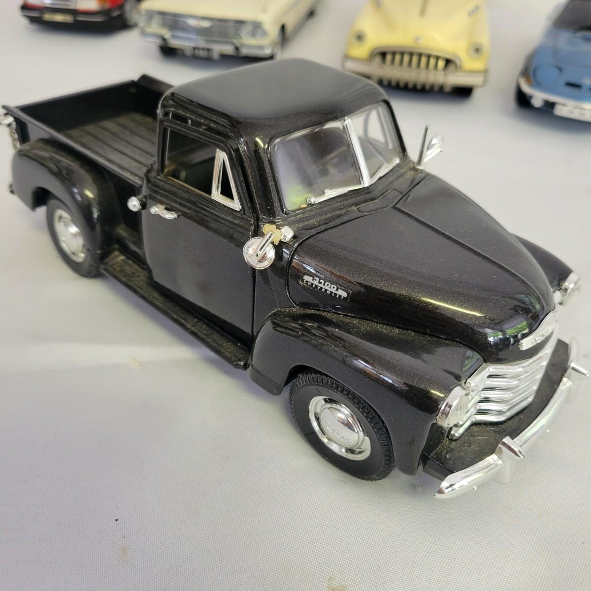 An assortment of six die cast cars and two metal molded cars. It appears most of the cars are 1/18 scale replicas of Chevrolets, Oldsmobile and Saab. The black Chevy truck has a broken side mirror and the beige convertible has a broken steering wheel. Most of the replicas have doors, hoods and trunks that open to show detail. This lot also includes two metal molded cars. One is solid brass and the other appears to aluminum. The largest beige convertible measures approximately 11" x 4.5" x 3.5"H. Shipping available. Shipping can be costly. We suggest contacting our preferred local shipping provider, Postage Express, with dimensions and getting an estimate before bidding: (828) 670-5501 or postageexpress@yahoo.com.