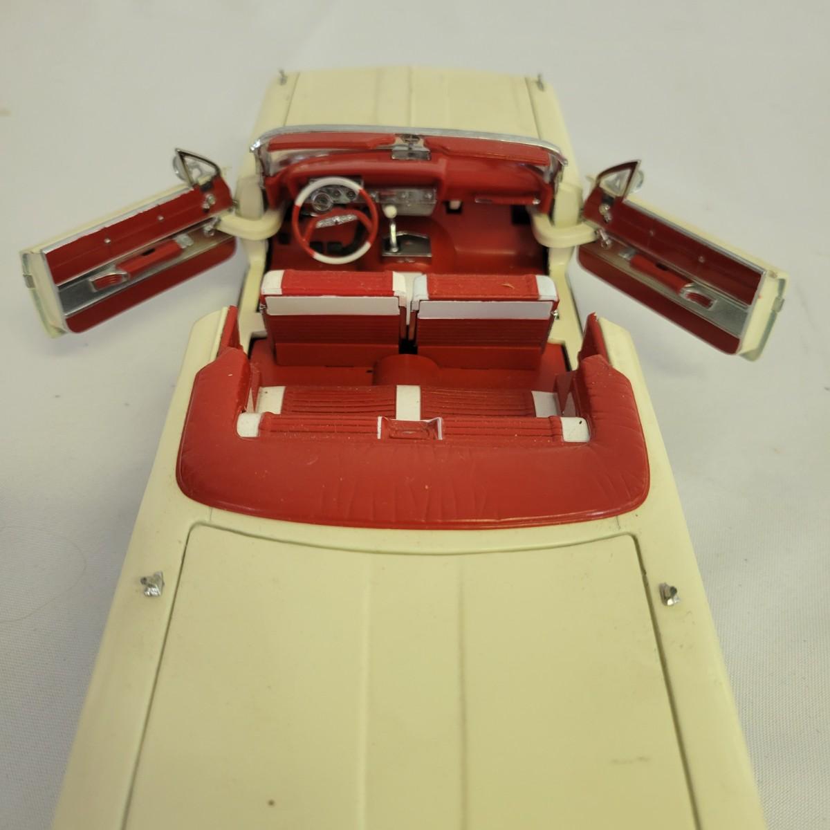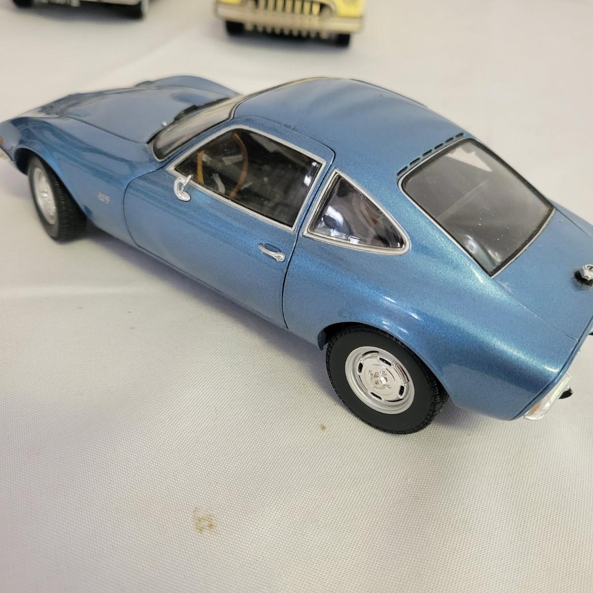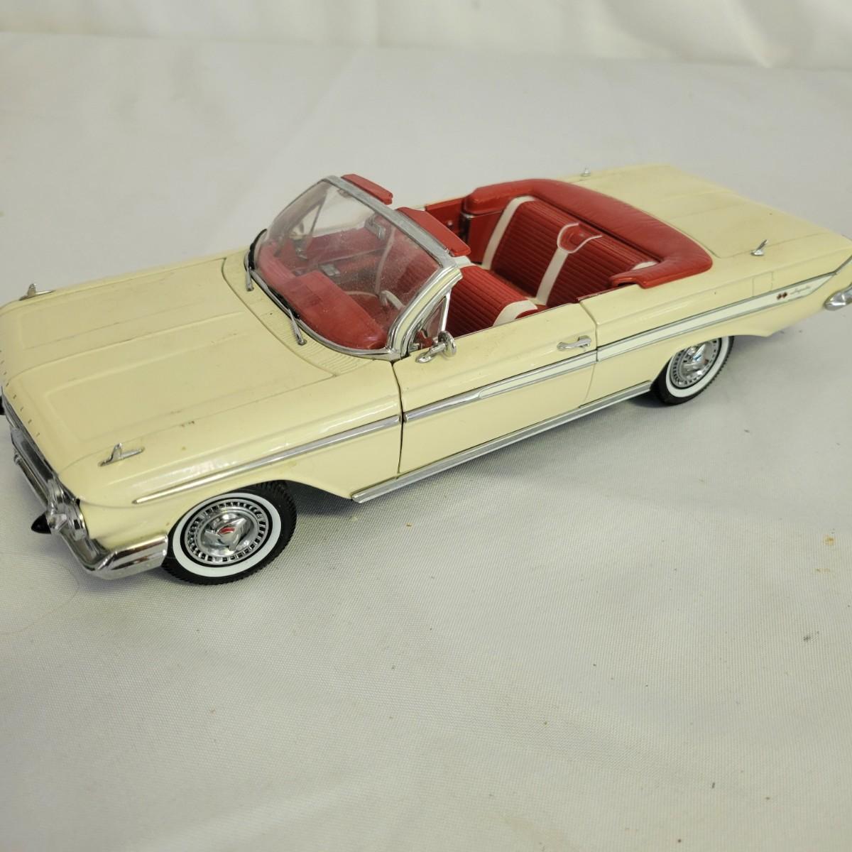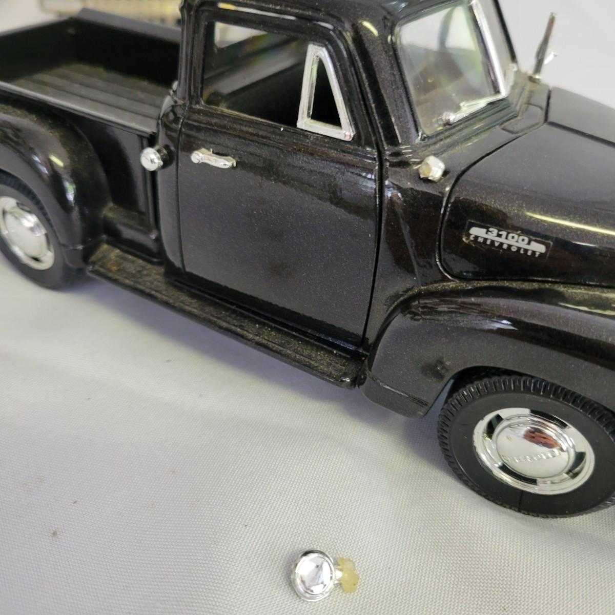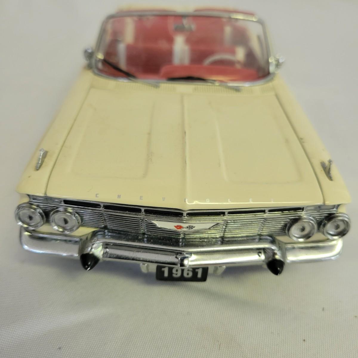 An assortment of six die cast cars and two metal molded cars. It appears most of the cars are 1/18 scale replicas of Chevrolets, Oldsmobile and Saab. The black Chevy truck has a broken side mirror and the beige convertible has a broken steering wheel. Most of the replicas have doors, hoods and trunks that open to show detail. This lot also includes two metal molded cars. One is solid brass and the other appears to aluminum. The largest beige convertible measures approximately 11" x 4.5" x 3.5"H. Shipping available. Shipping can be costly. We suggest contacting our preferred local shipping provider, Postage Express, with dimensions and getting an estimate before bidding: (828) 670-5501 or postageexpress@yahoo.com.