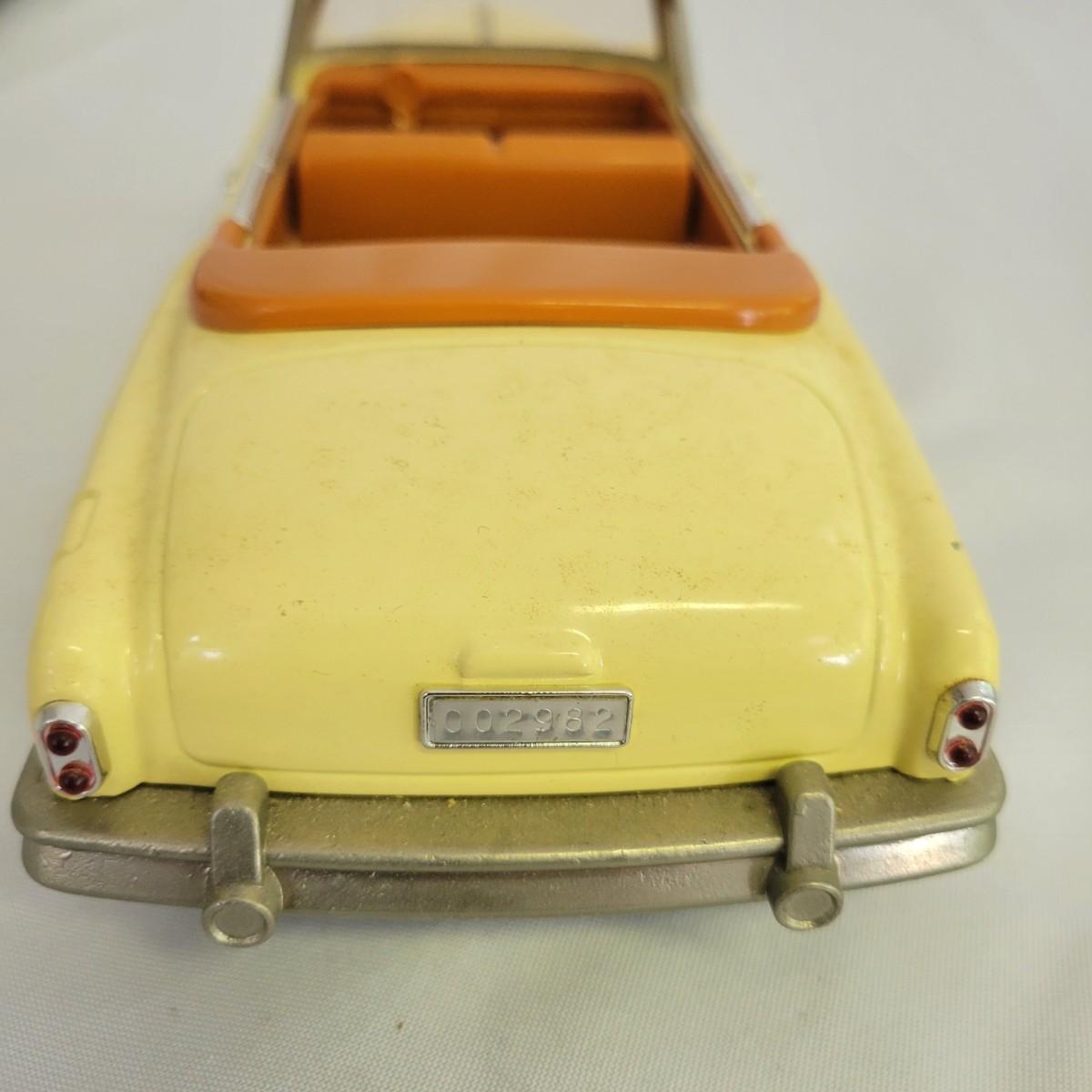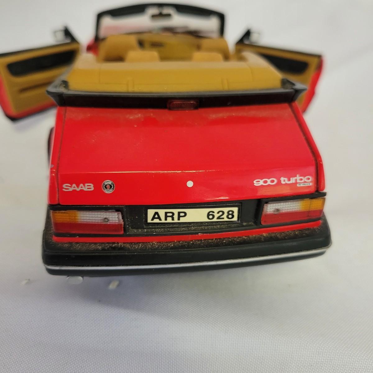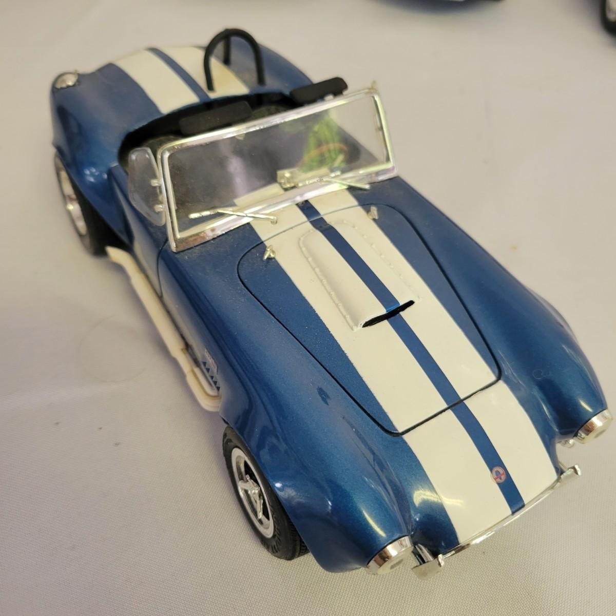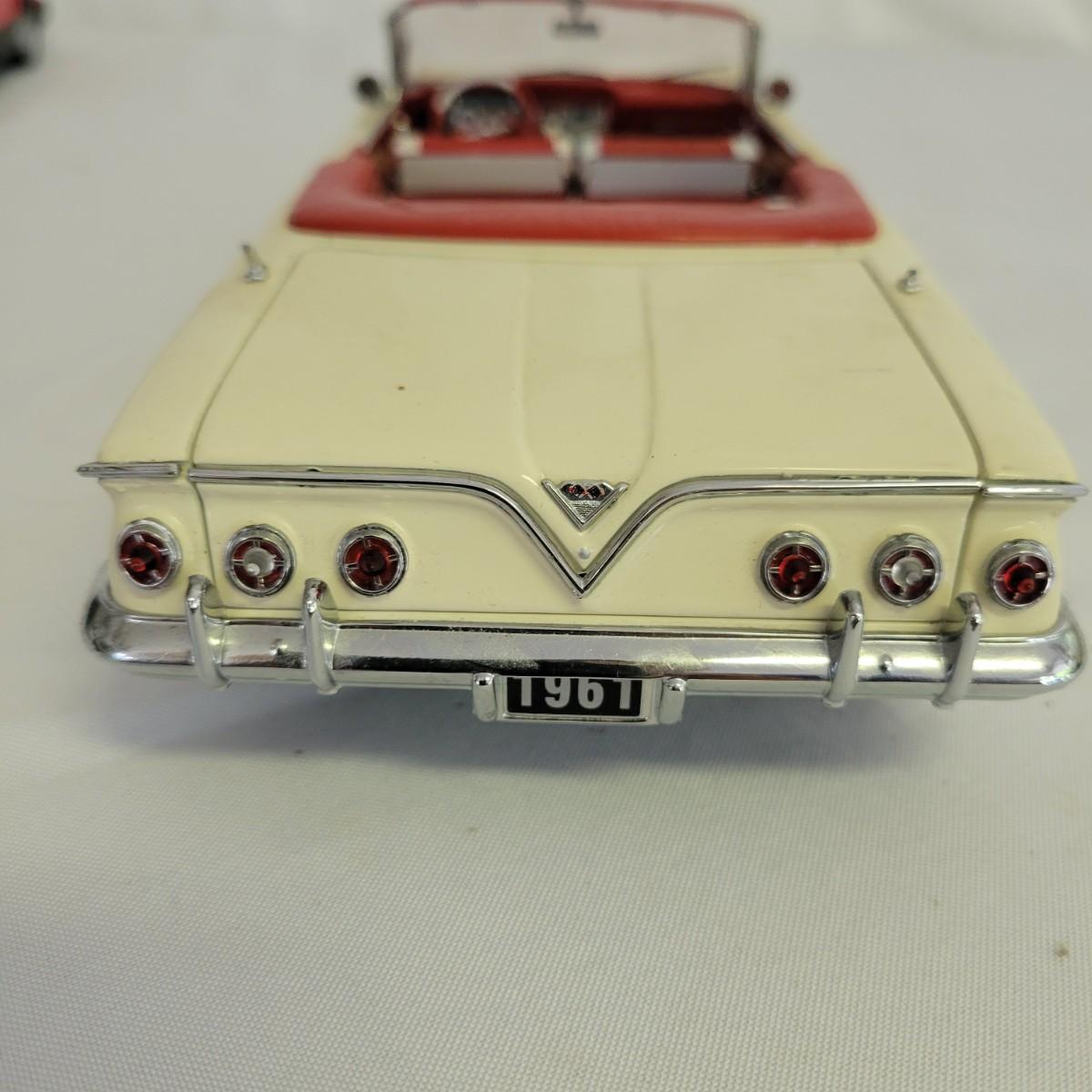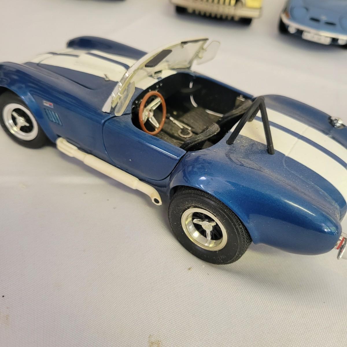 An assortment of six die cast cars and two metal molded cars. It appears most of the cars are 1/18 scale replicas of Chevrolets, Oldsmobile and Saab. The black Chevy truck has a broken side mirror and the beige convertible has a broken steering wheel. Most of the replicas have doors, hoods and trunks that open to show detail. This lot also includes two metal molded cars. One is solid brass and the other appears to aluminum. The largest beige convertible measures approximately 11" x 4.5" x 3.5"H. Shipping available. Shipping can be costly. We suggest contacting our preferred local shipping provider, Postage Express, with dimensions and getting an estimate before bidding: (828) 670-5501 or postageexpress@yahoo.com.