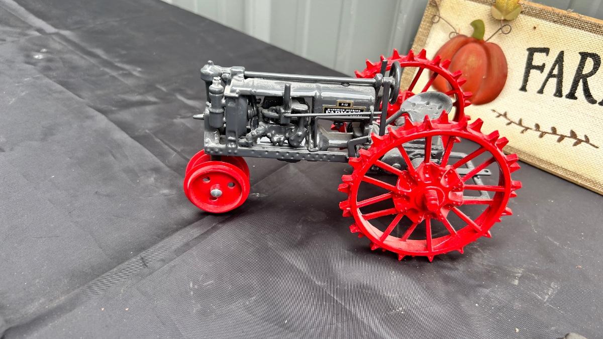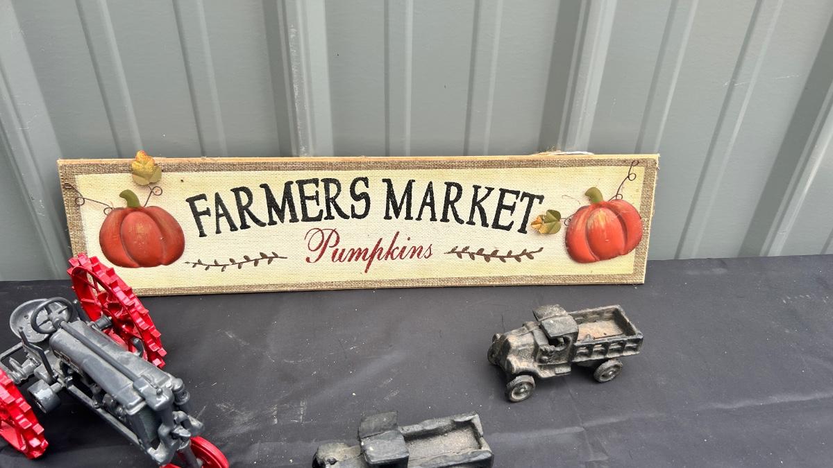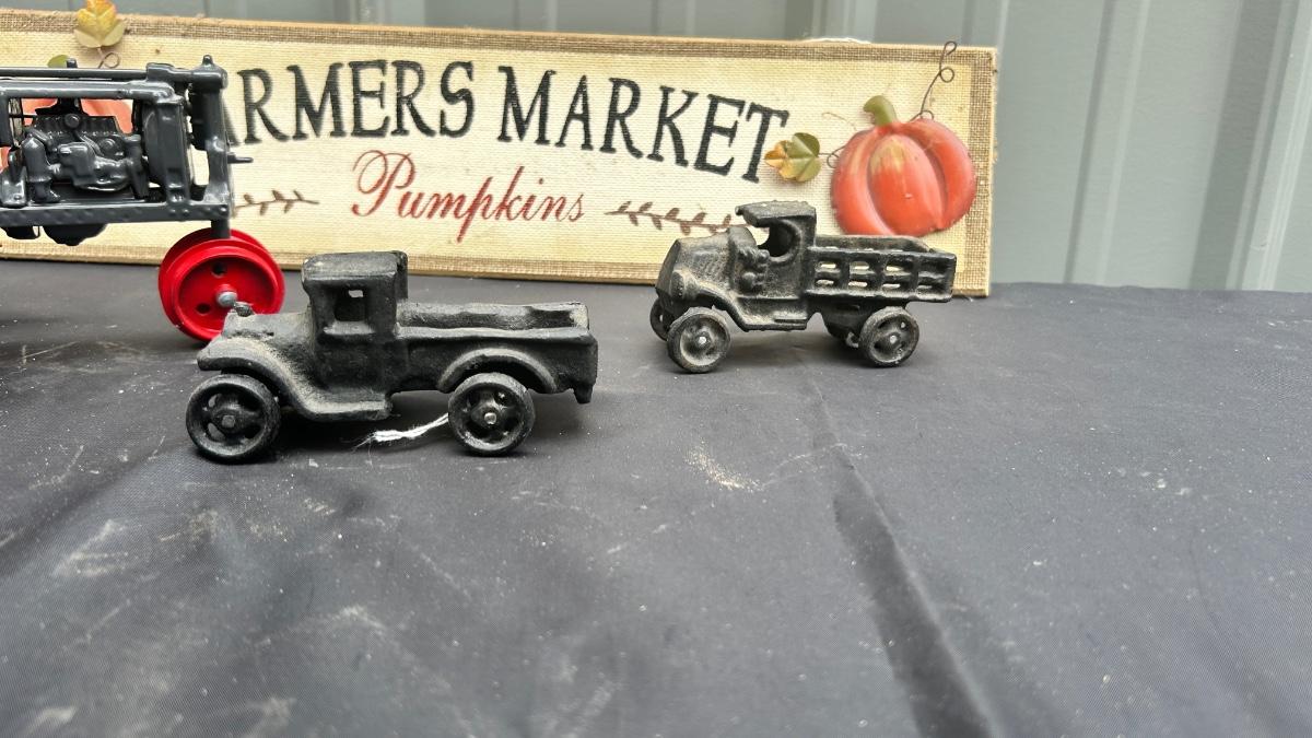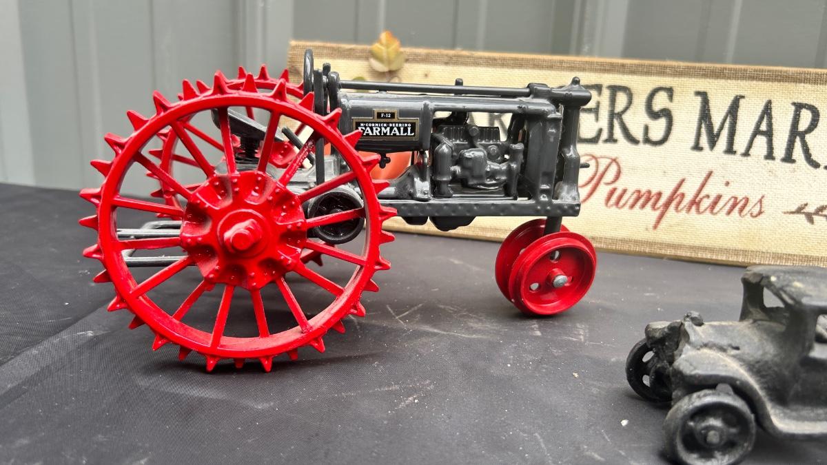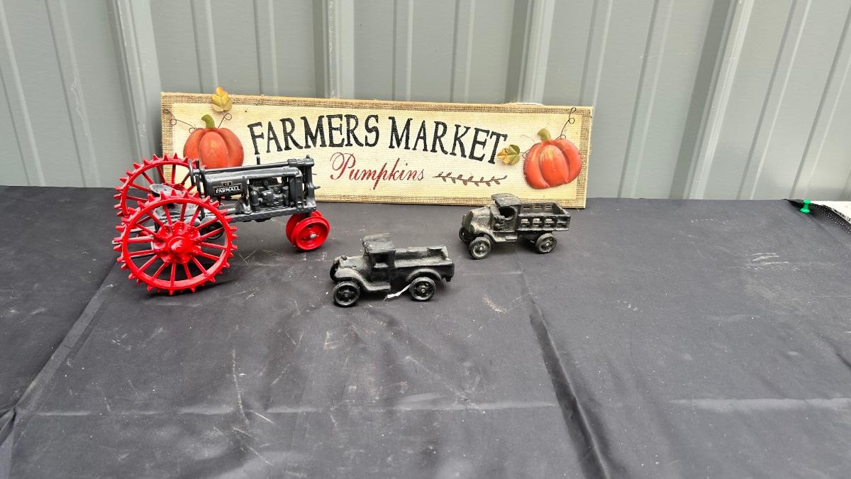 DIE CAST FARMALL TRACTOR, TWO CAST IRON MODEL A TRUCKS AND WALL HANGING