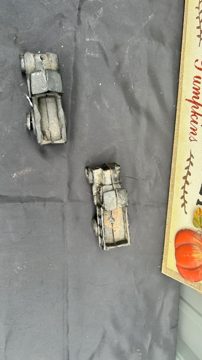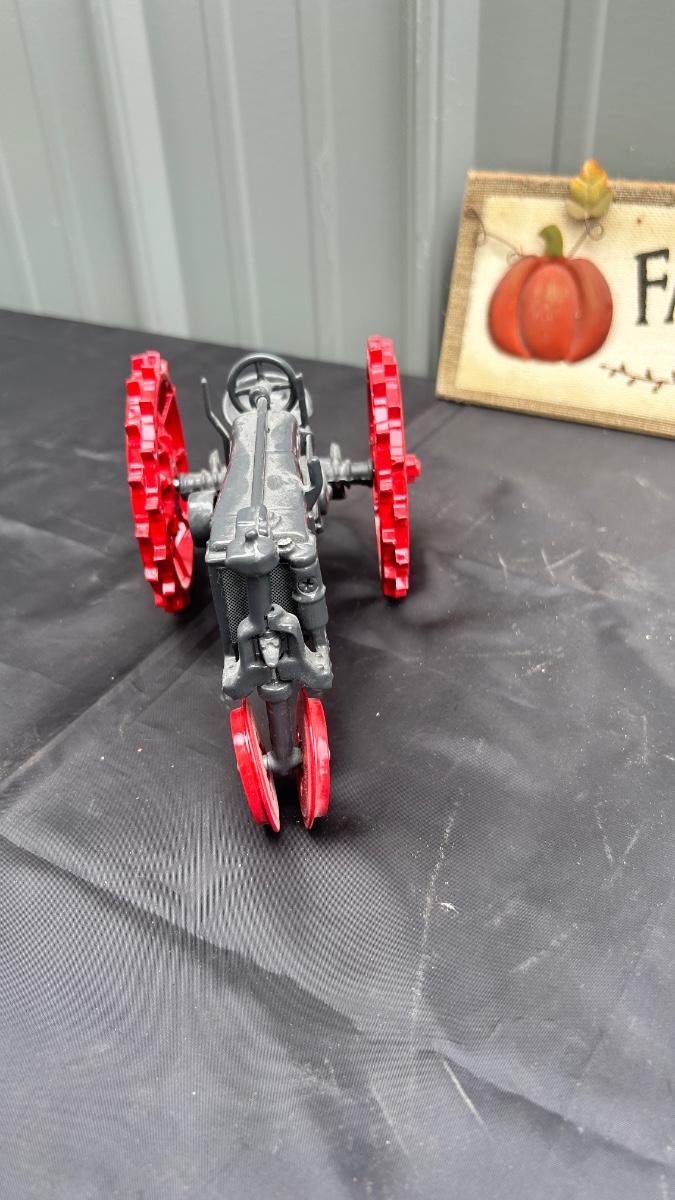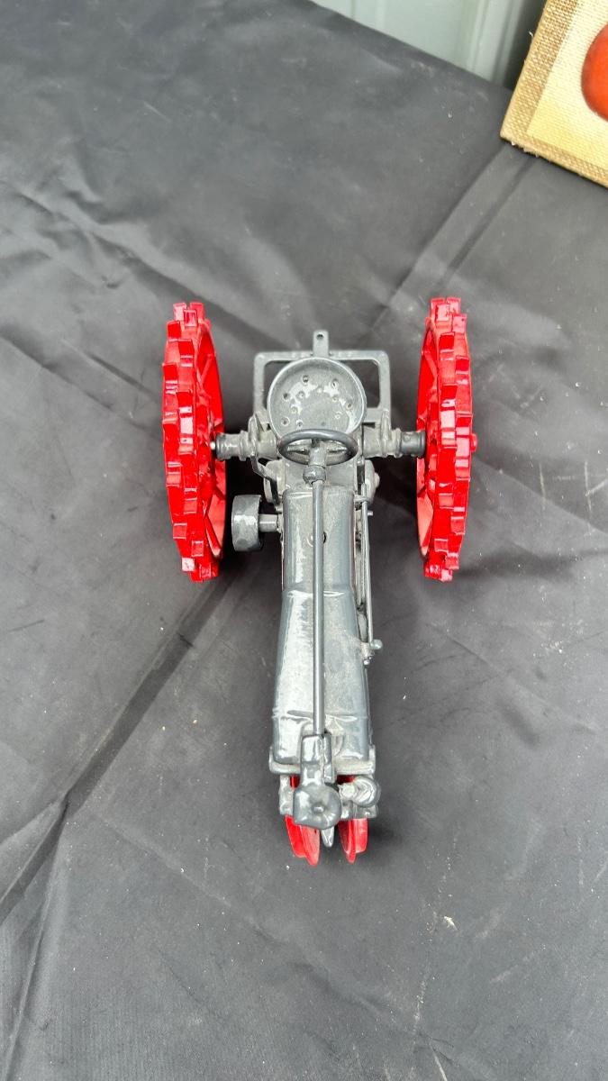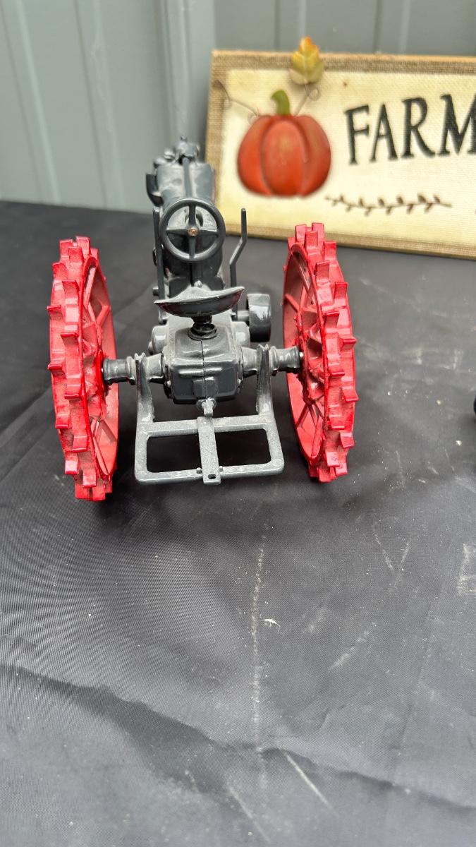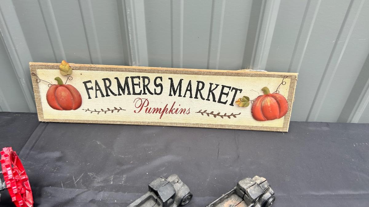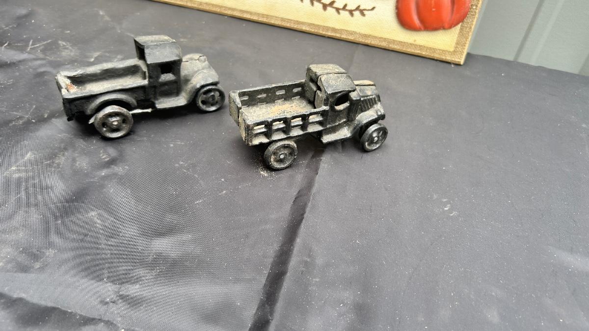 DIE CAST FARMALL TRACTOR, TWO CAST IRON MODEL A TRUCKS AND WALL HANGING